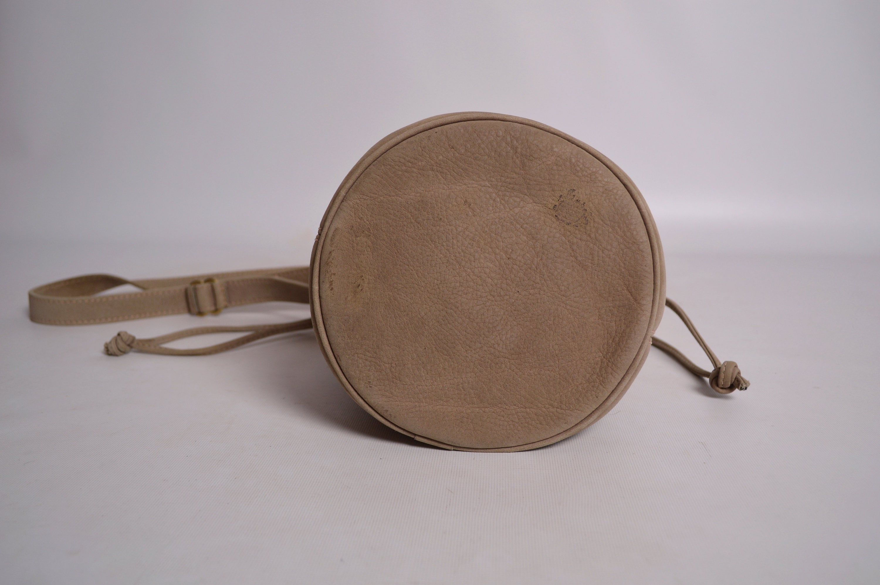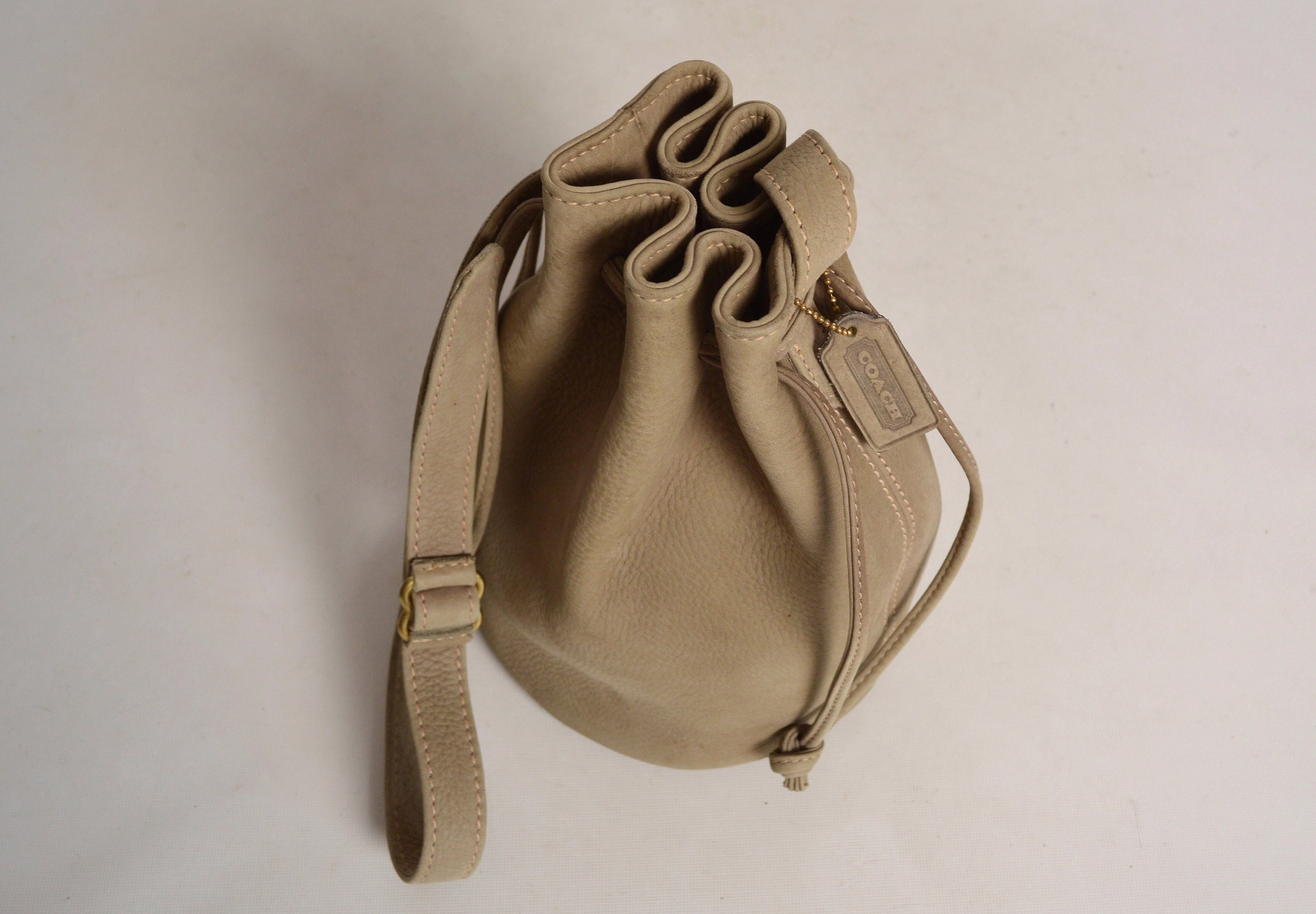 Authentic vintage taupe Coach drawstring bucket bag. Style No c4b 4931, Sonoma Collection. Extremely high-quality leather that has a soft suede feel with a pebbled texture. It has a very clean and spacious lined interior. Inside has one small zipper pocket where the Coach creed is stamped. Has the iconic Coach hangtag. Brass hardware and adjustable shoulder strap that is plenty long enough to wear crossbody. Gorgeous neutral color goes with everything! Made in the United States
