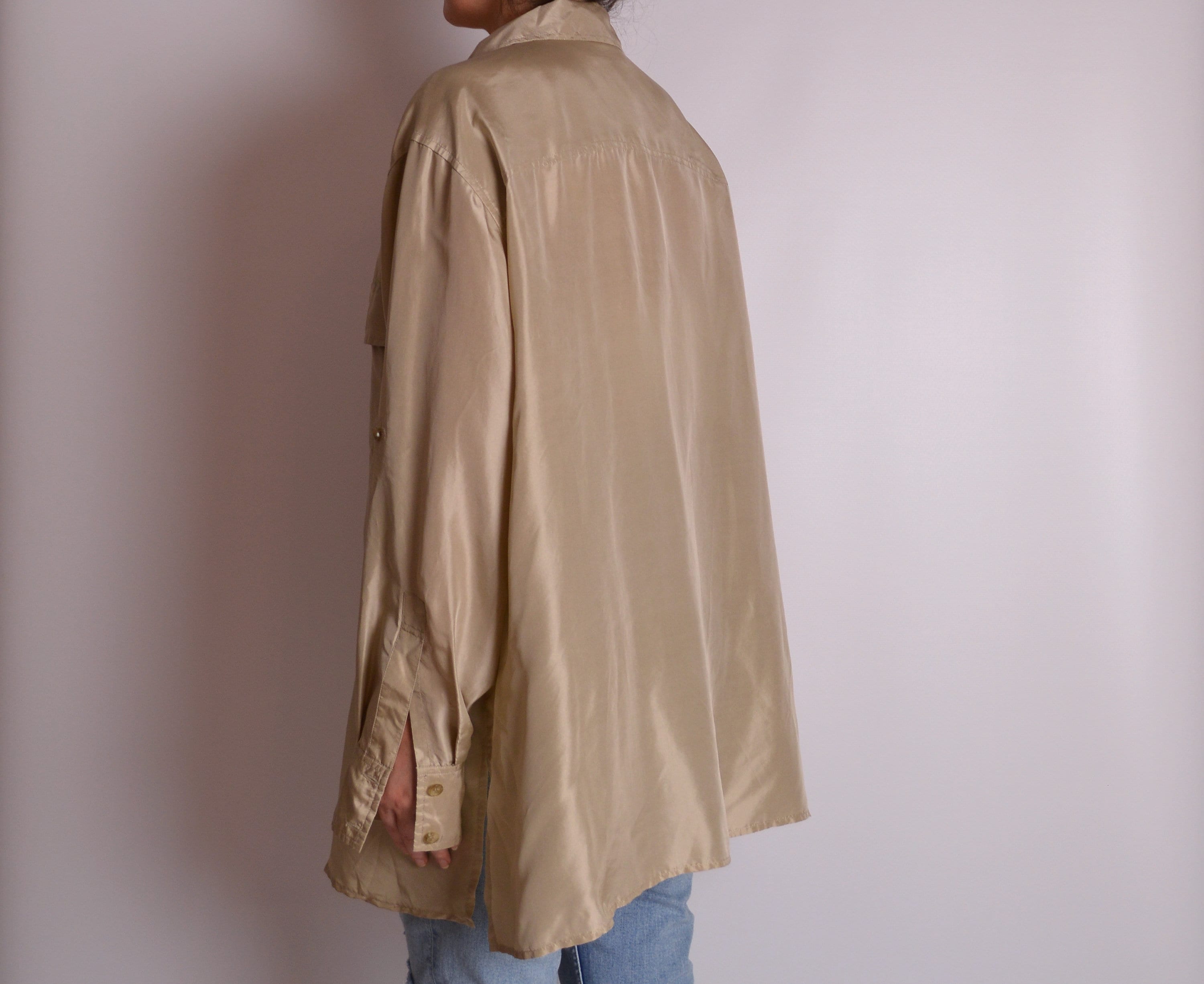 Gorgeous vintage beige silk button-up blouse. Square chest pockets and one button at the cuffs. Sleeves have a tab that allows the sleeve to be rolled up half-length. Original store tag still attached. So beautiful