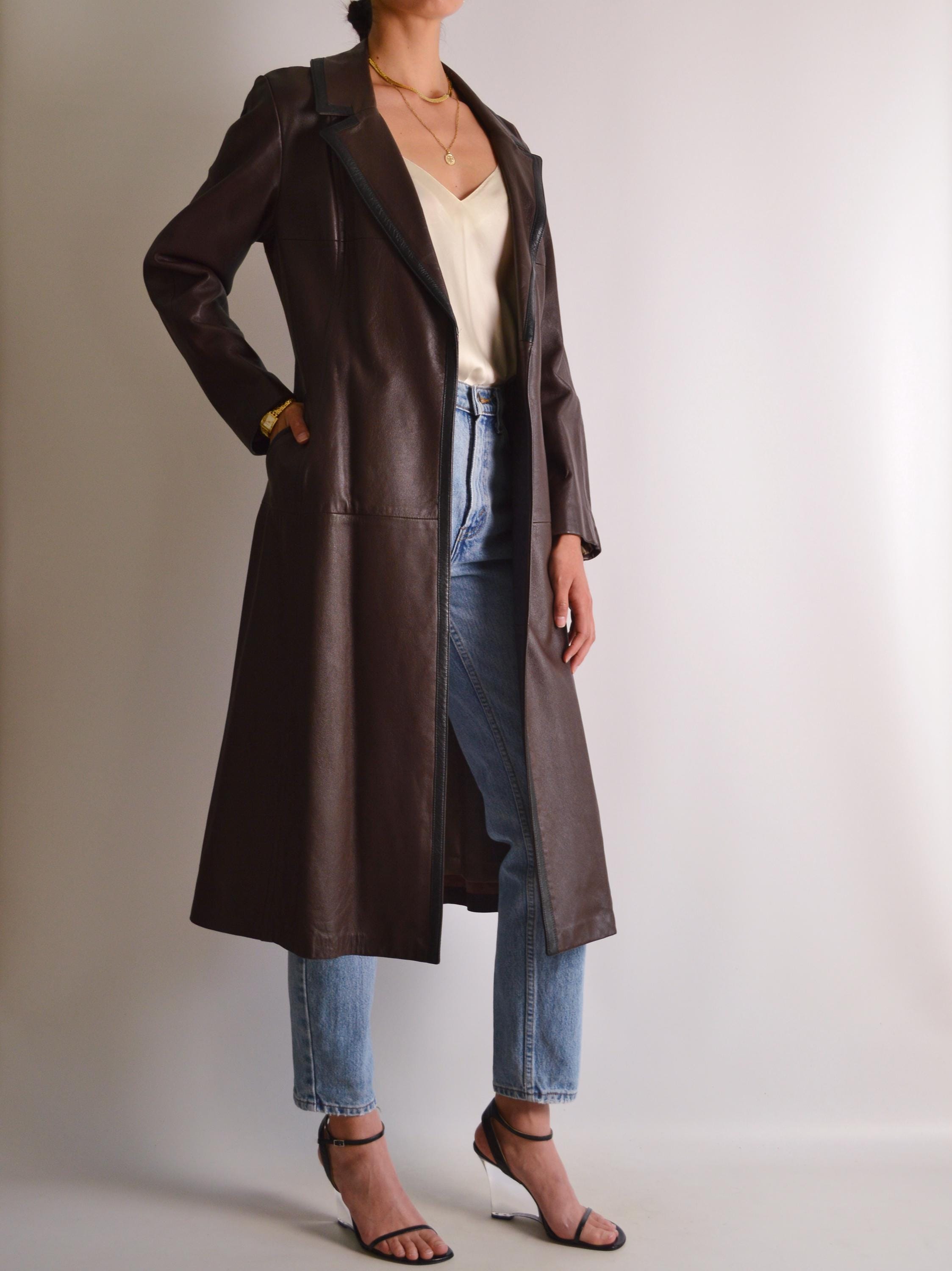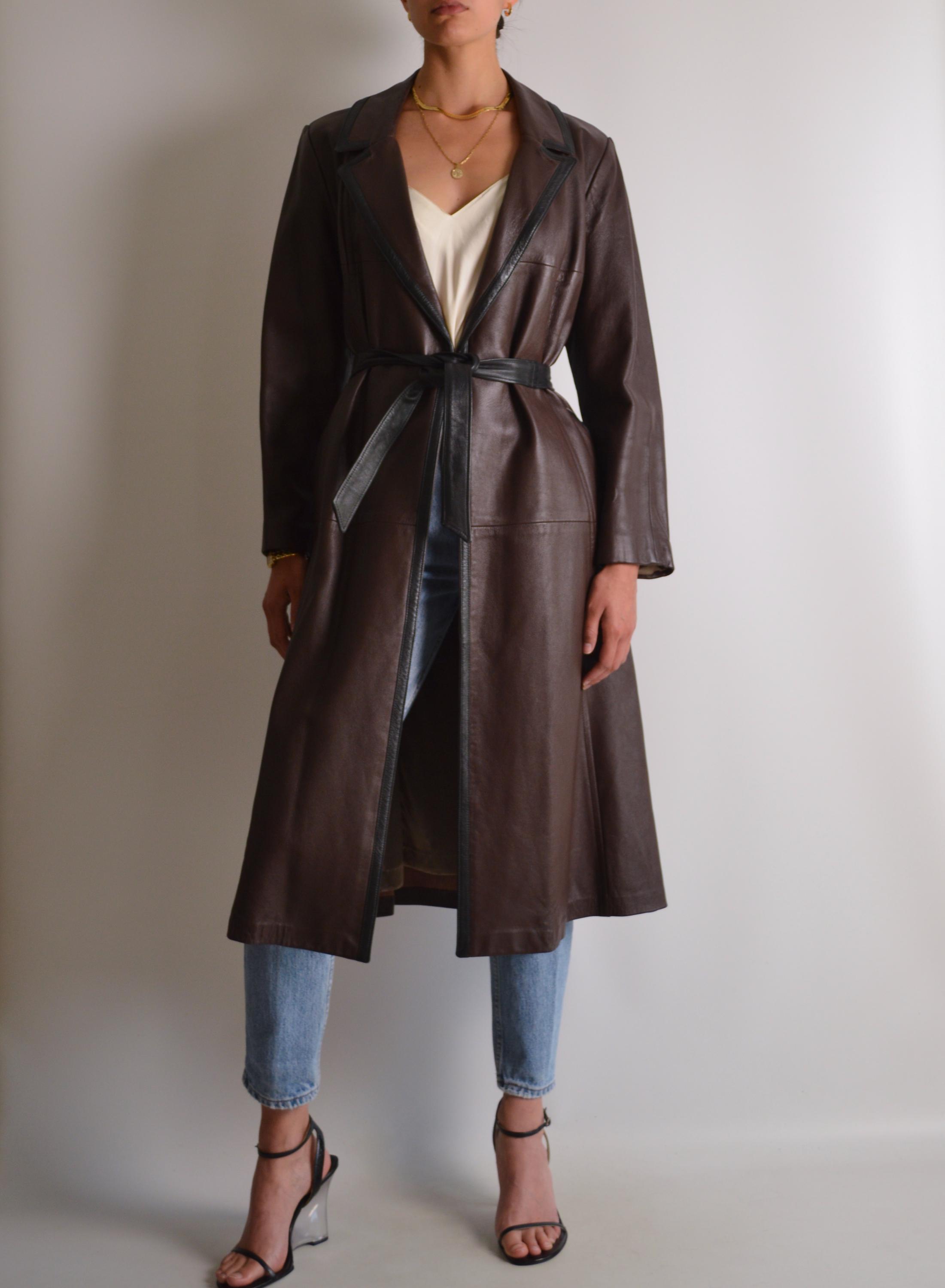 Incredibly chic vintage leather coat. In a gorgeous dark chocolate brown leather with black leather trim. It has satin-lined pockets as well as being fully lined in satin. Tie belt closure only. Made in USA. Perfect over everything! Truly a rare vintage gem.