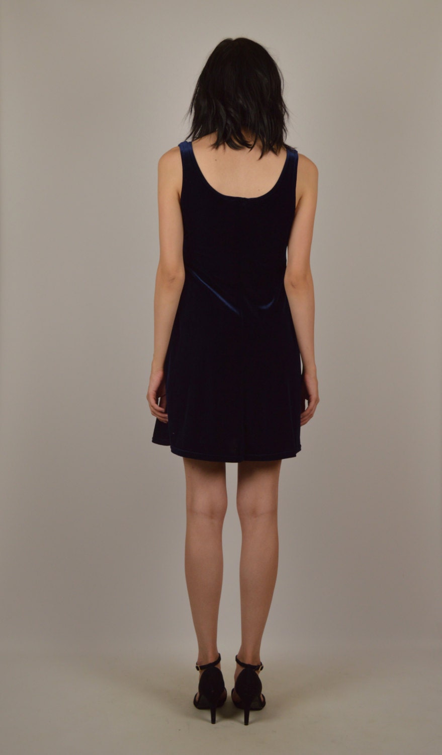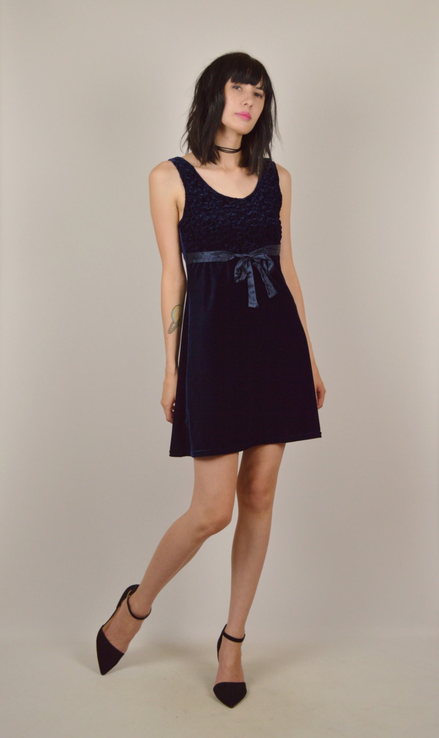 90's midnight blue velvet mini dress with ribbon tie at empire waist