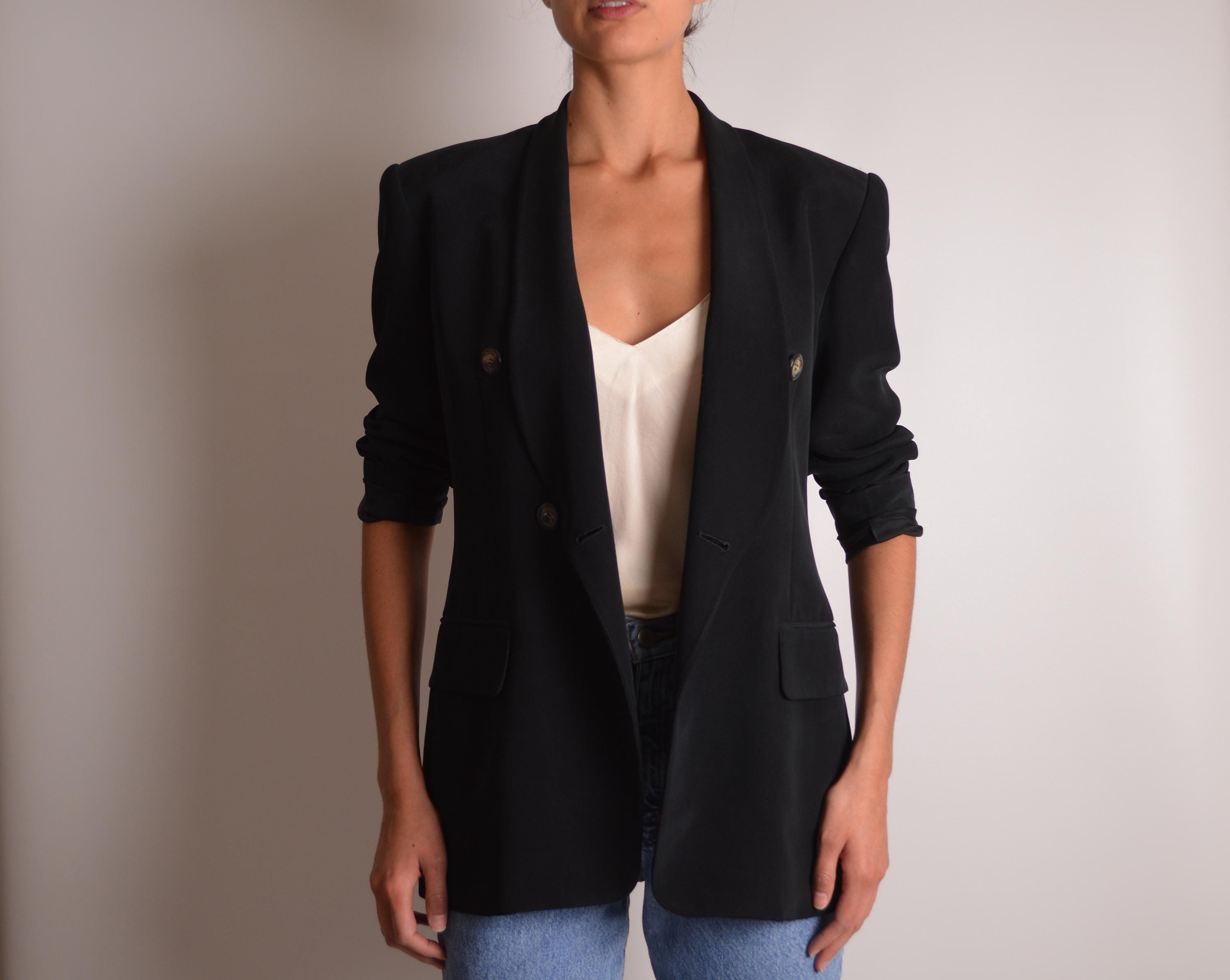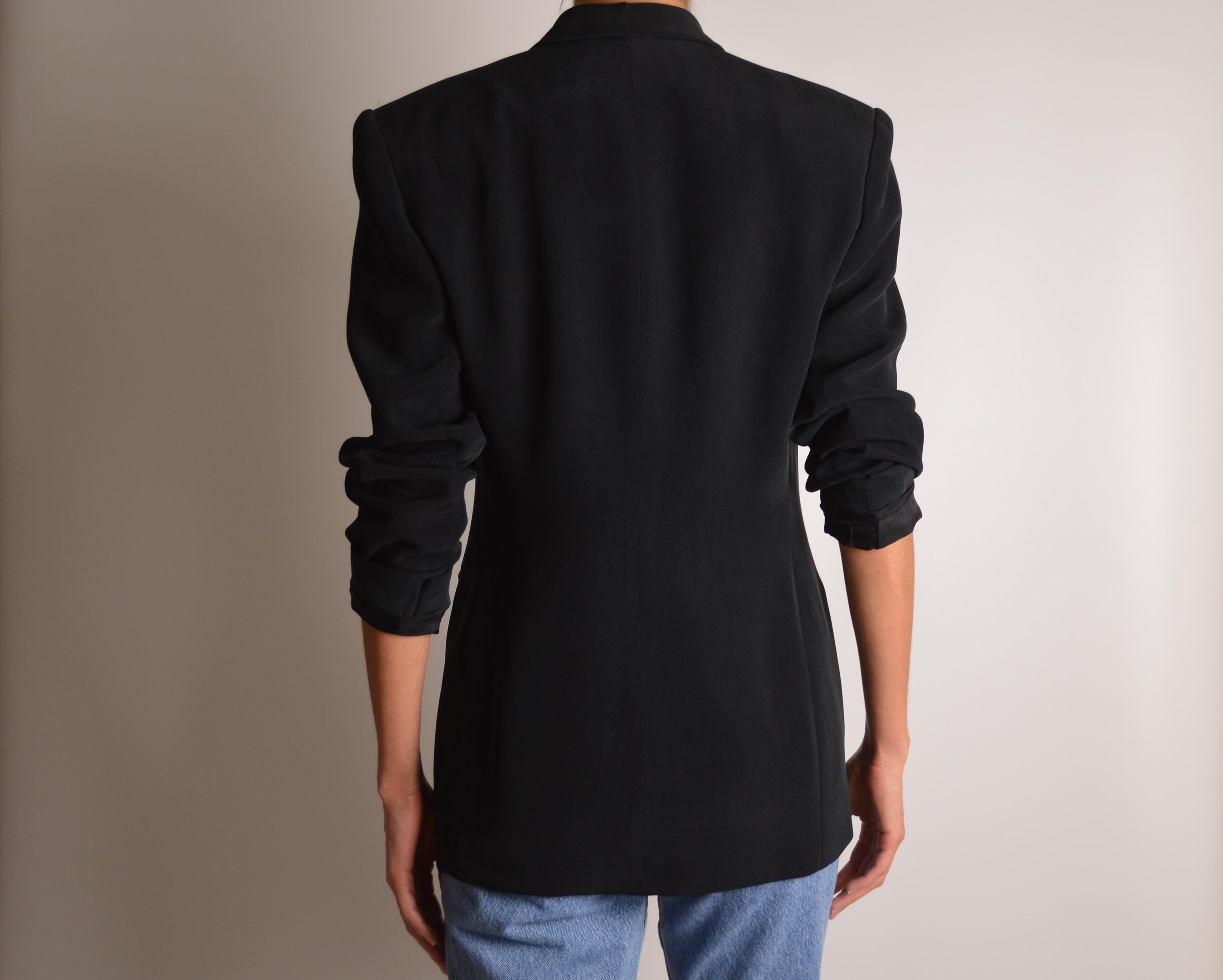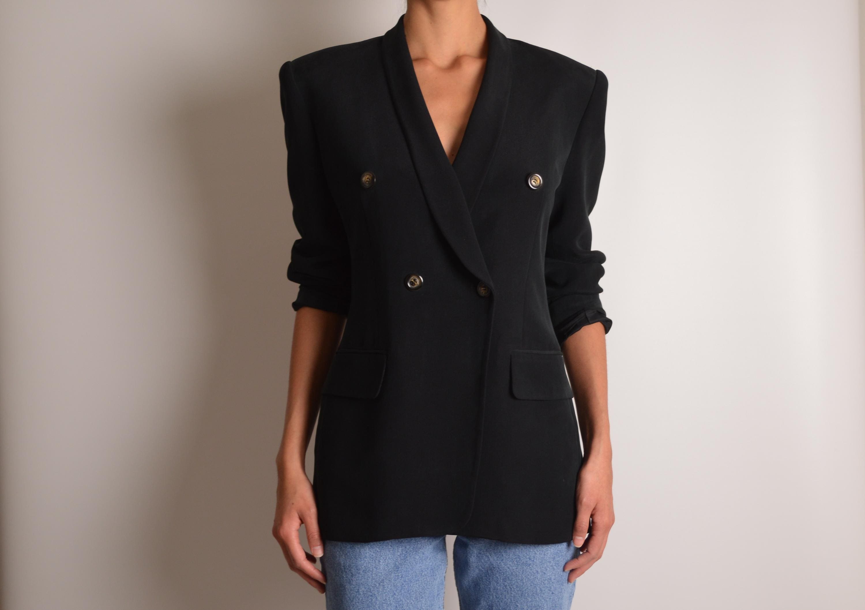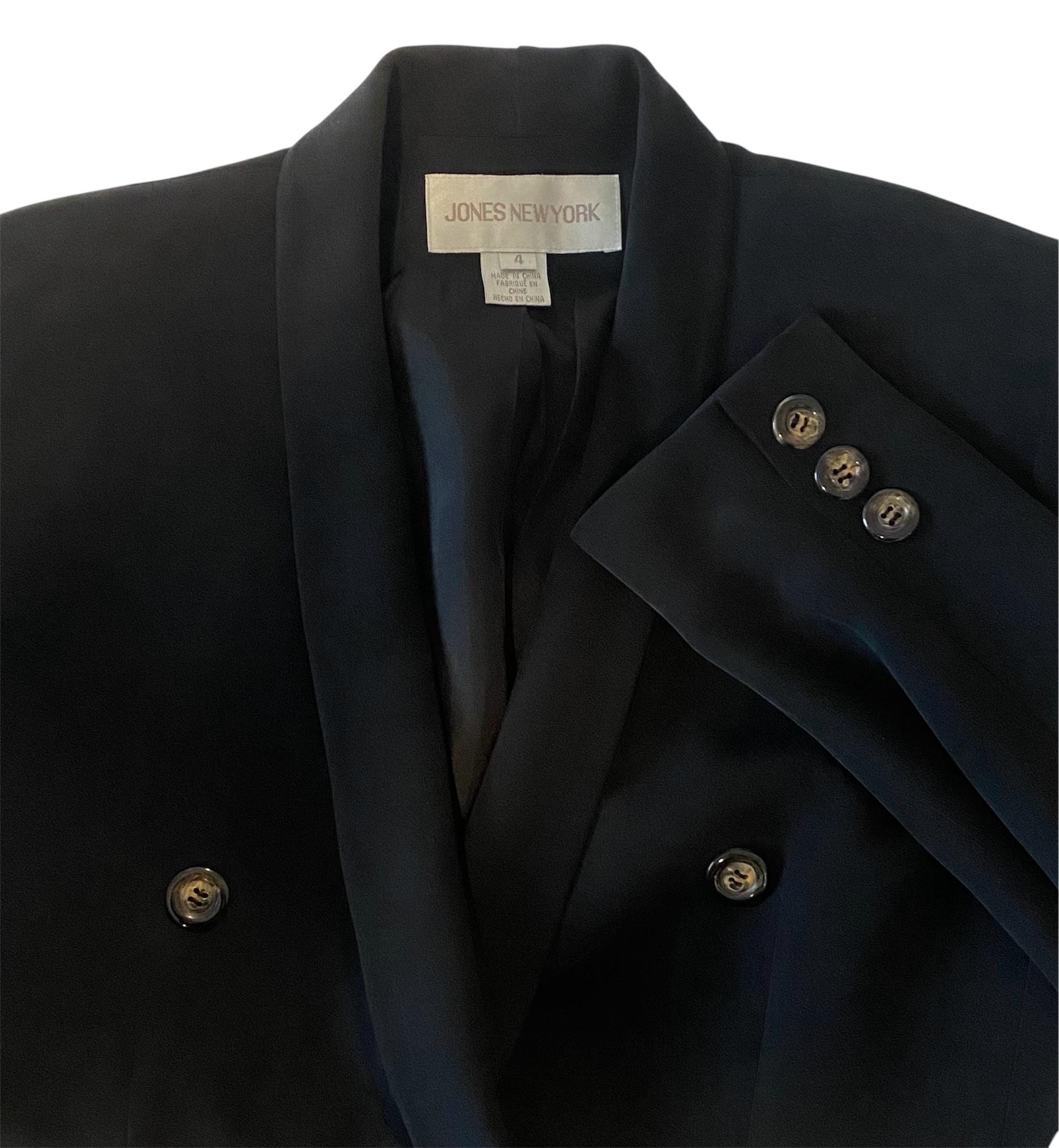Perfect vintage Jones New York black silk blazer. Double-breasted closure, flap-covered pockets, and three buttons at each wrist. It has perfectly padded shoulders and is fully lined inside. The silk has an amazing, soft, easy drape. Beautiful quality and so chic
