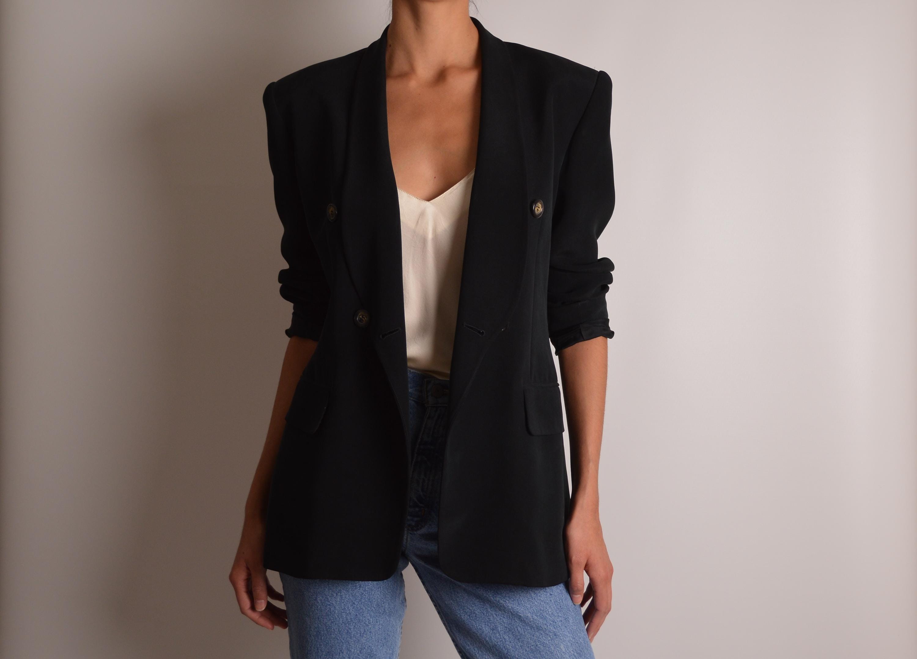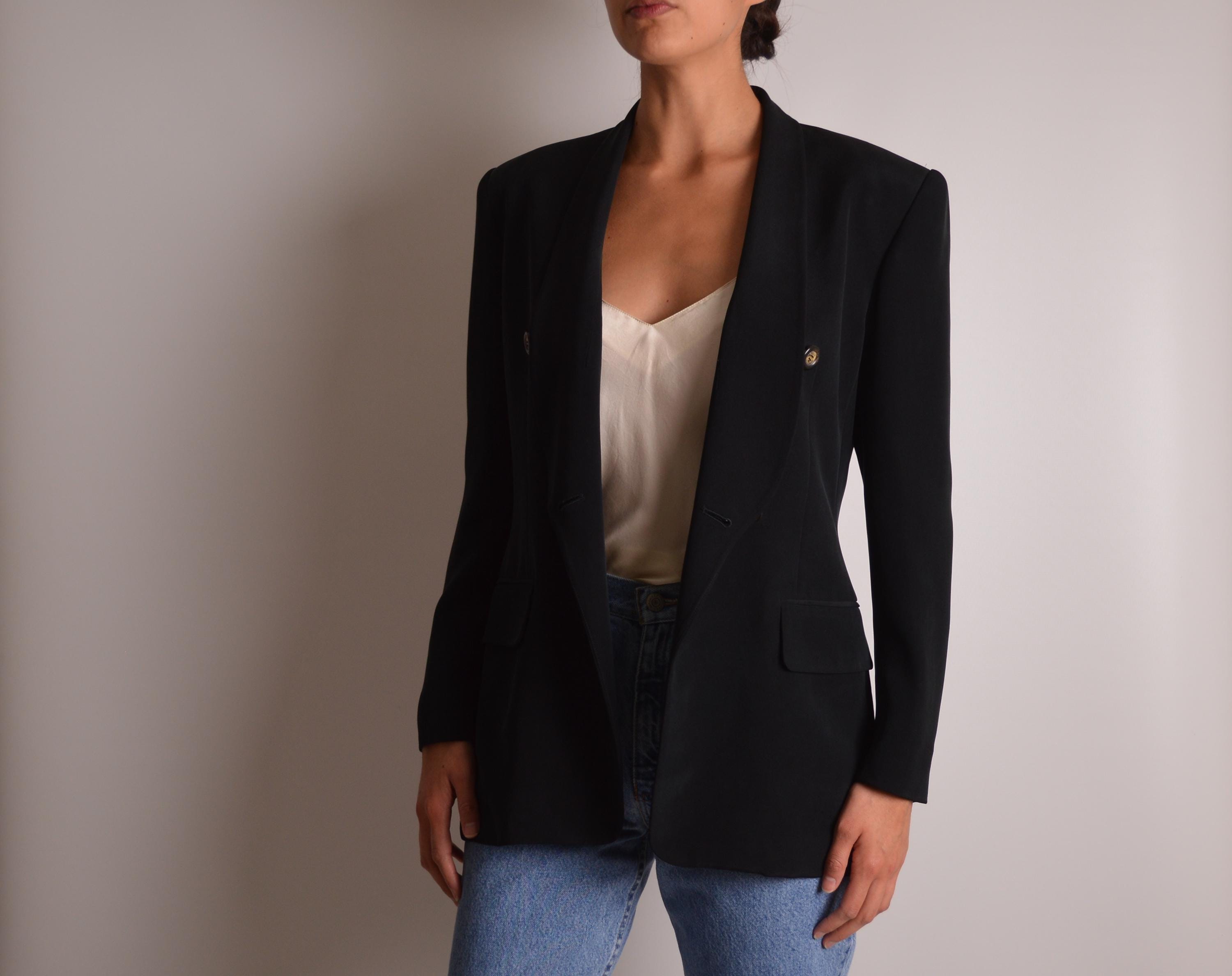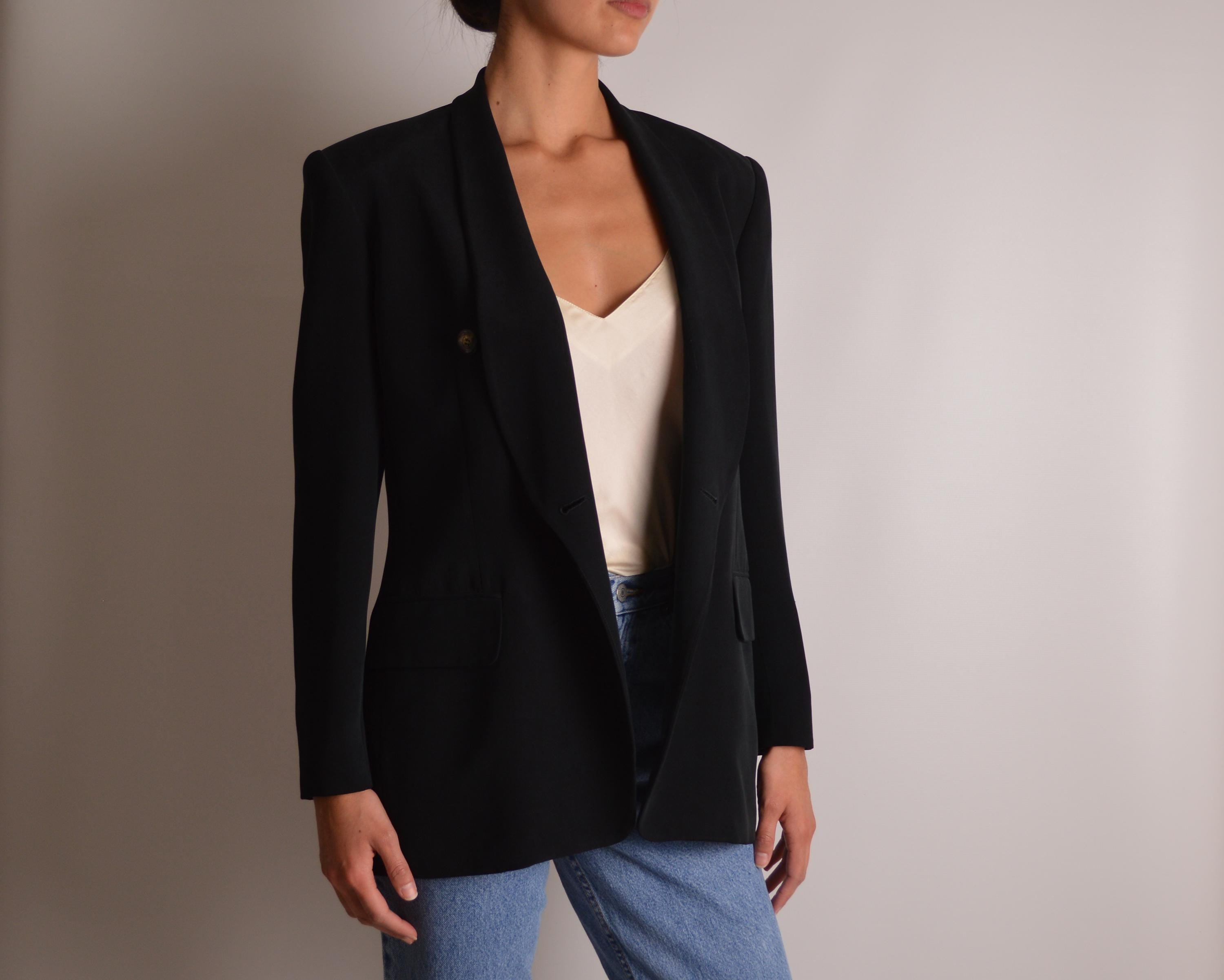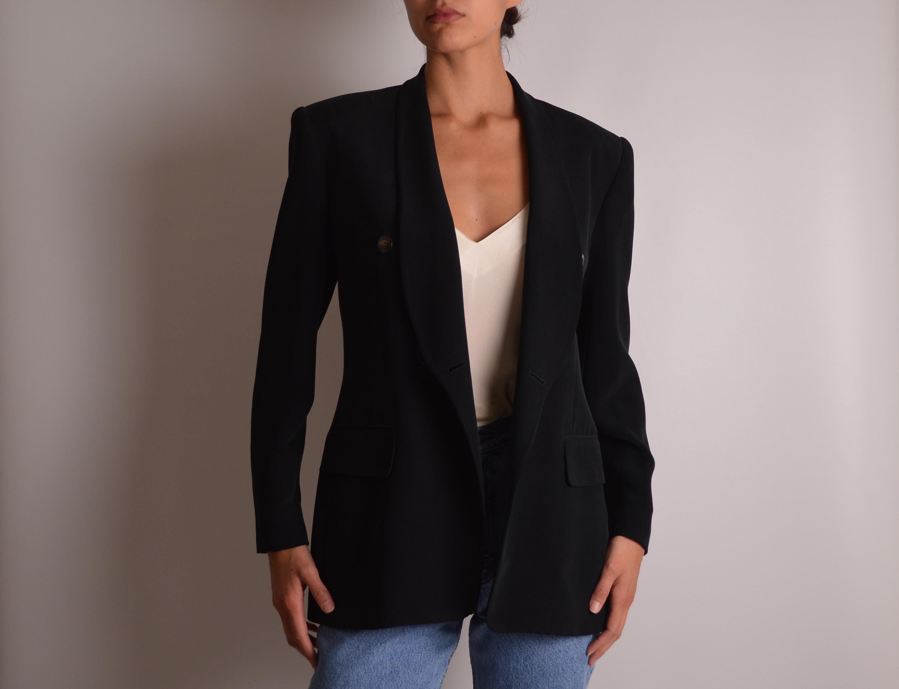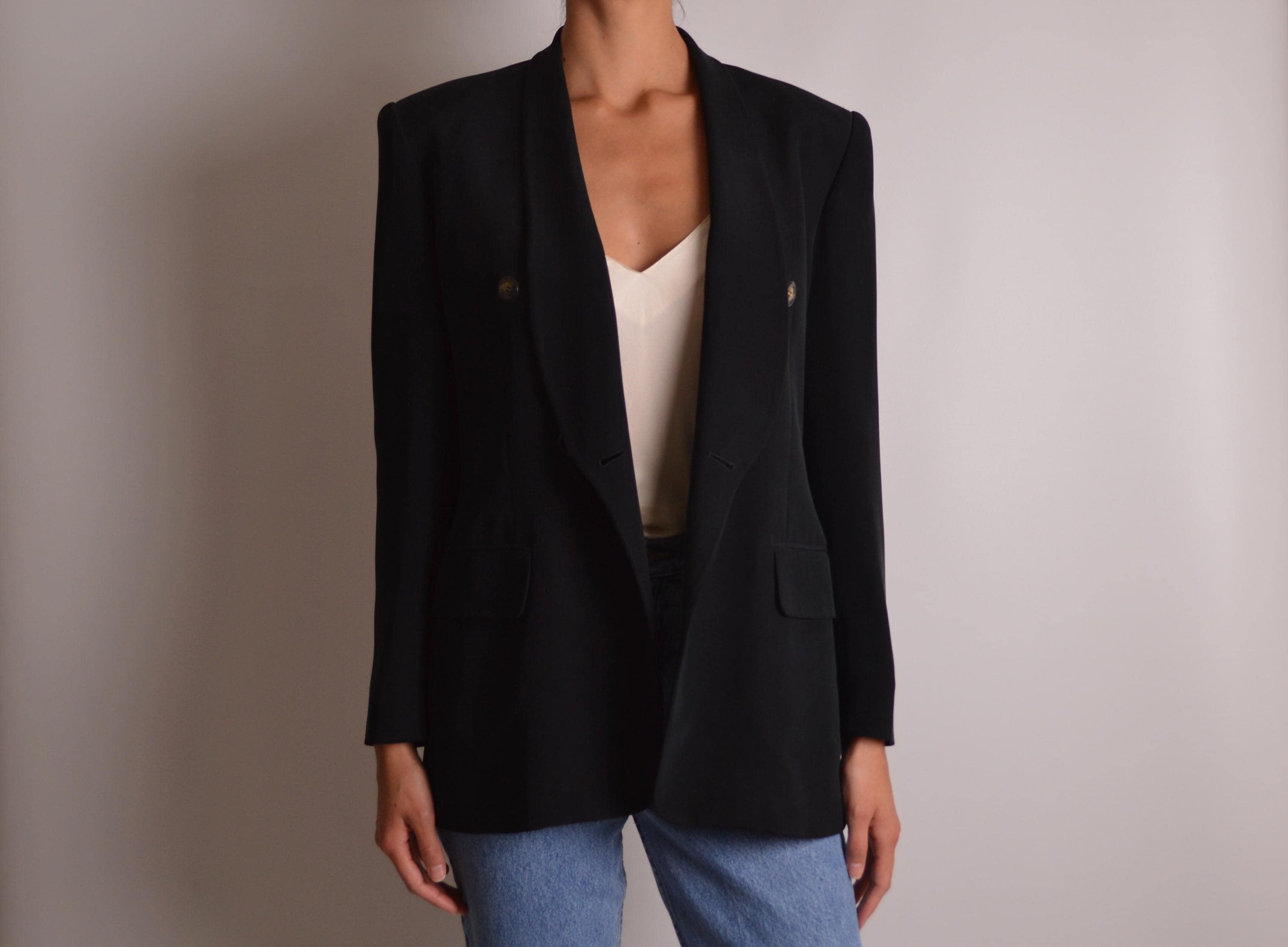 Perfect vintage Jones New York black silk blazer. Double-breasted closure, flap-covered pockets, and three buttons at each wrist. It has perfectly padded shoulders and is fully lined inside. The silk has an amazing, soft, easy drape. Beautiful quality and so chic