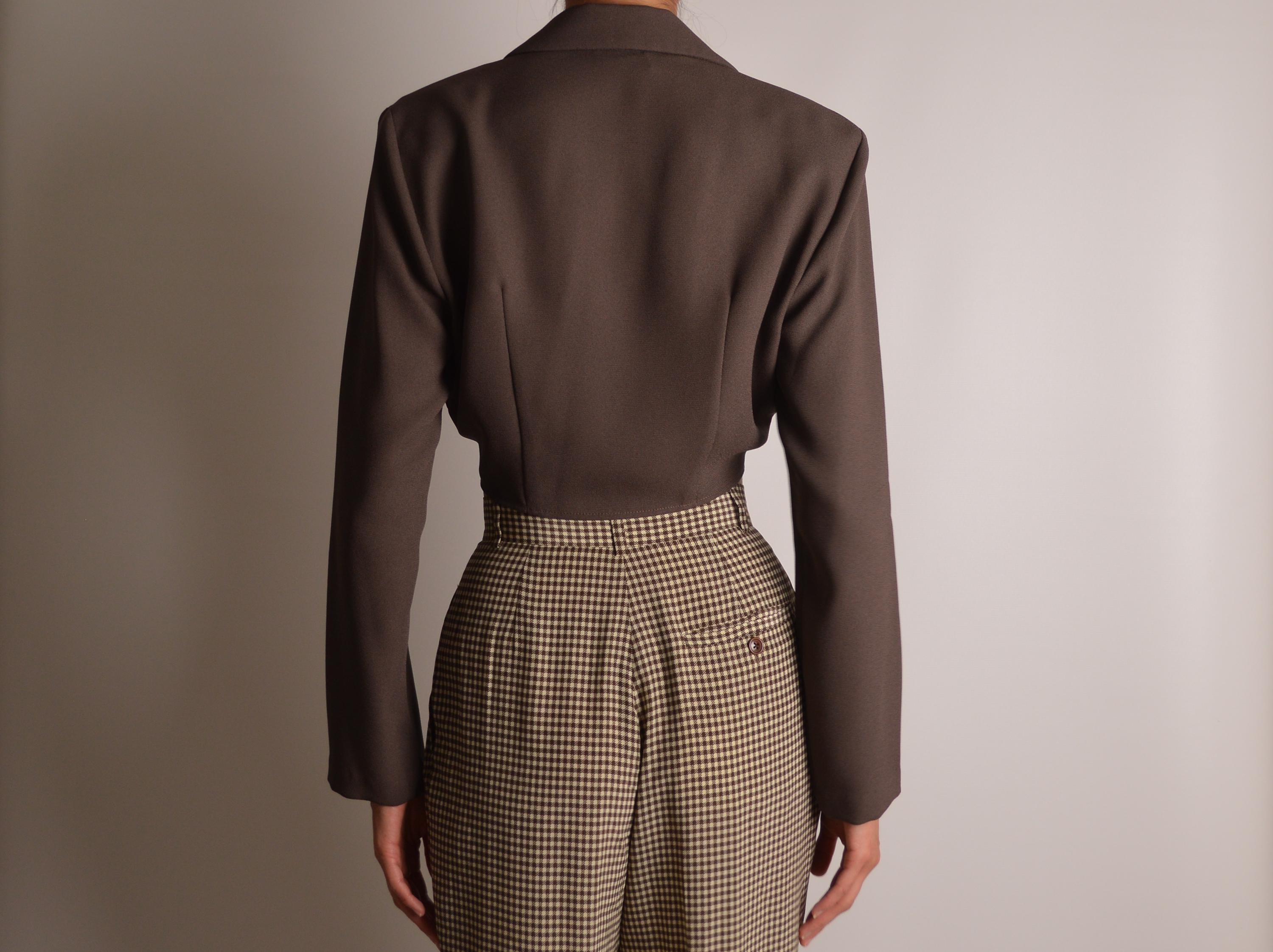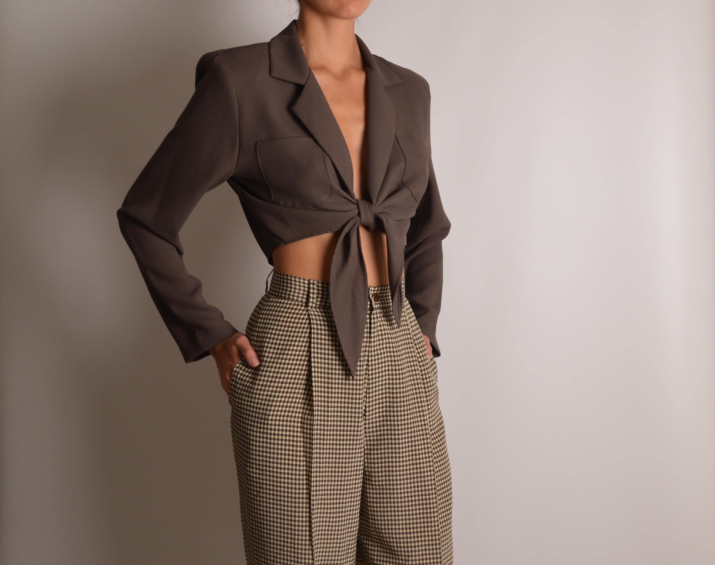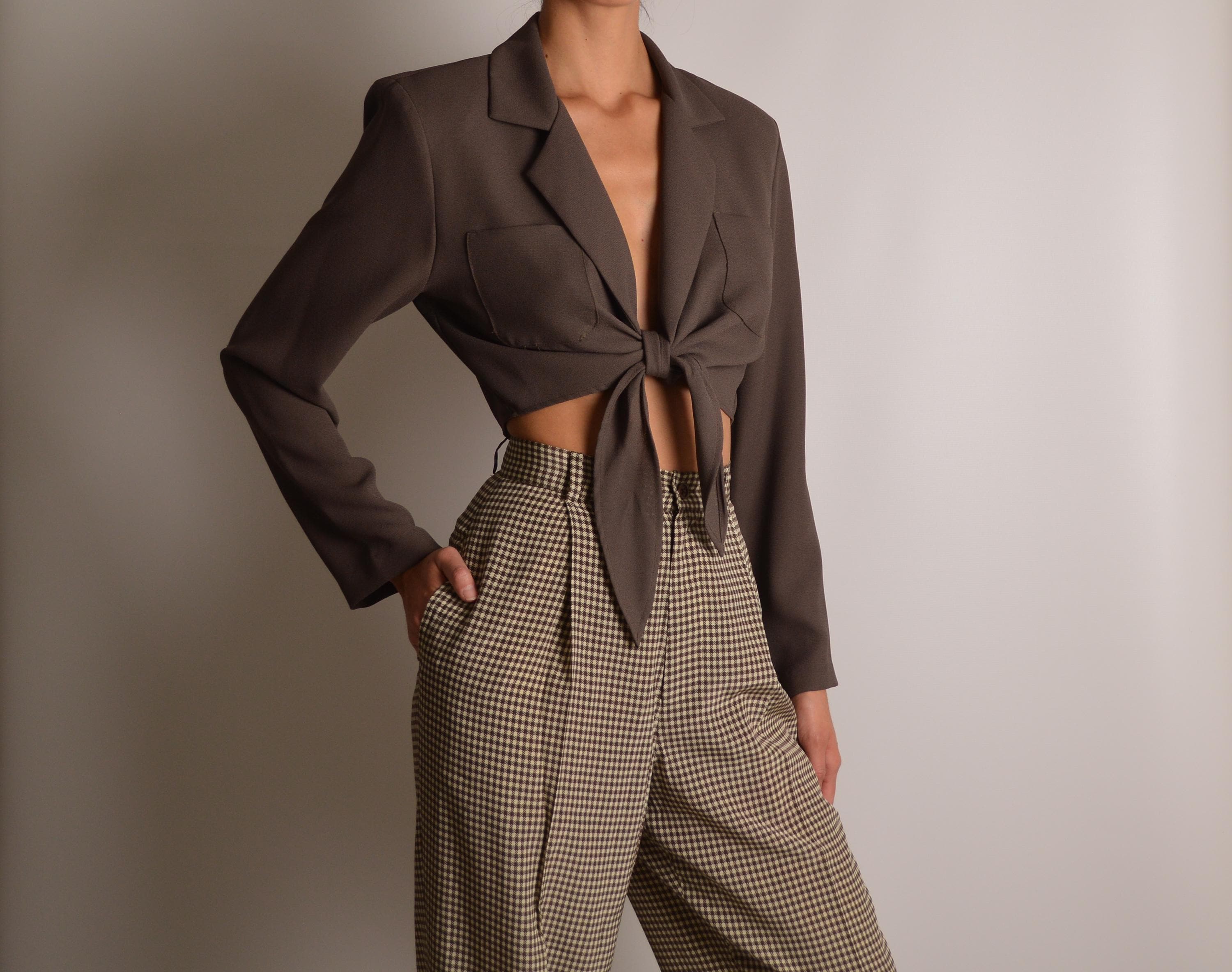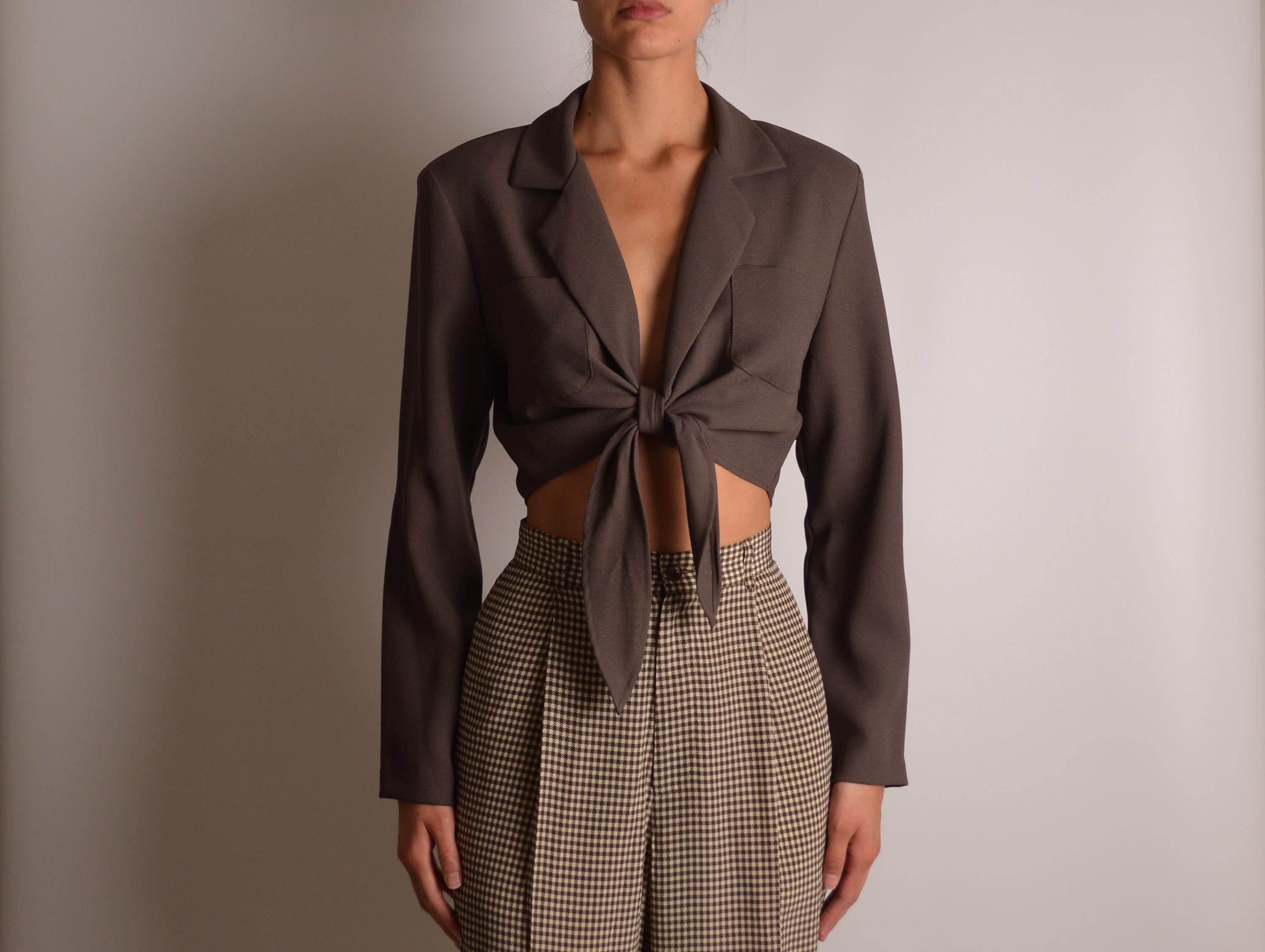 Vintage brown tie front cropped blouse. Perfectly padded shoulders, chest pockets, and unlined. Made in USA. So good
