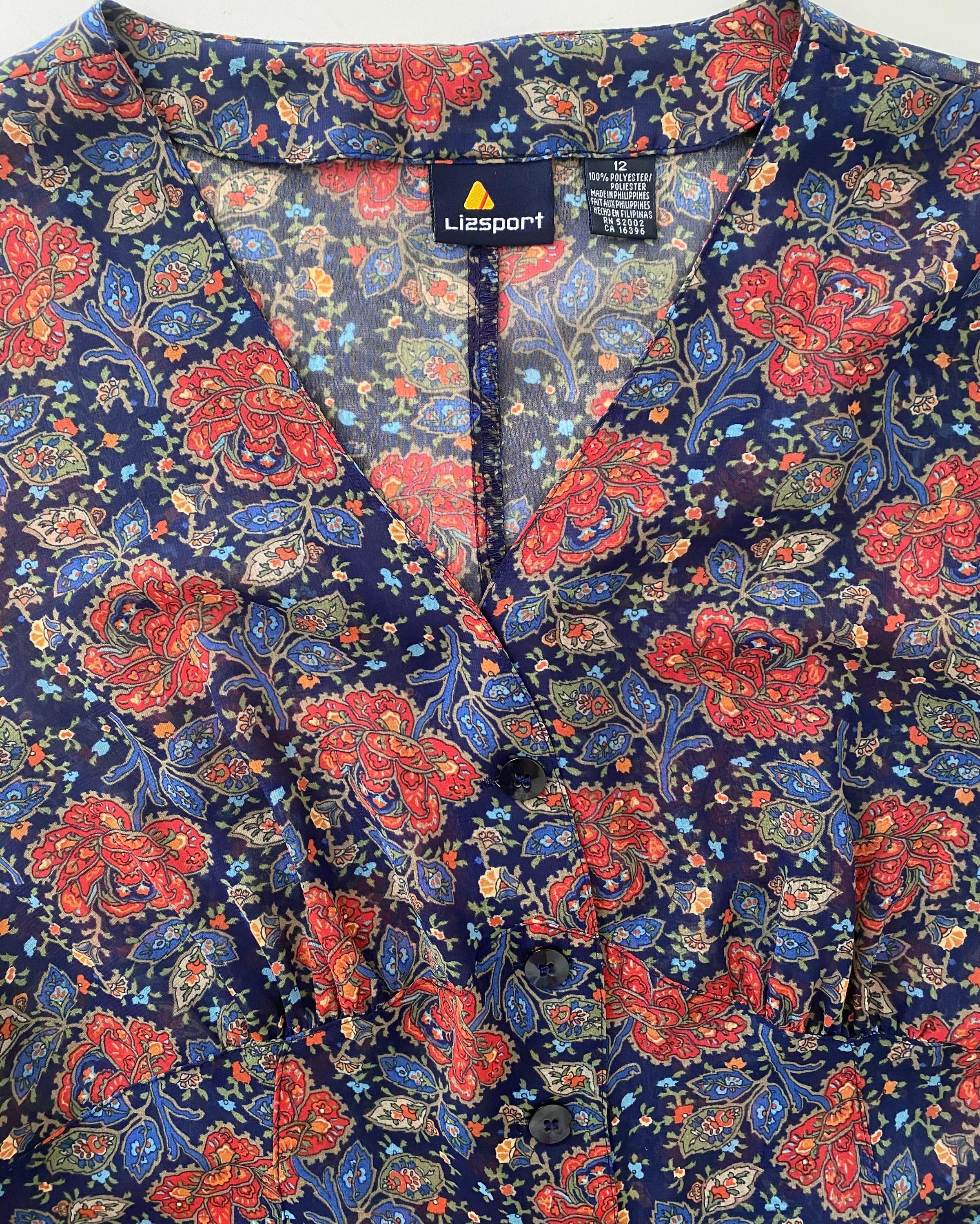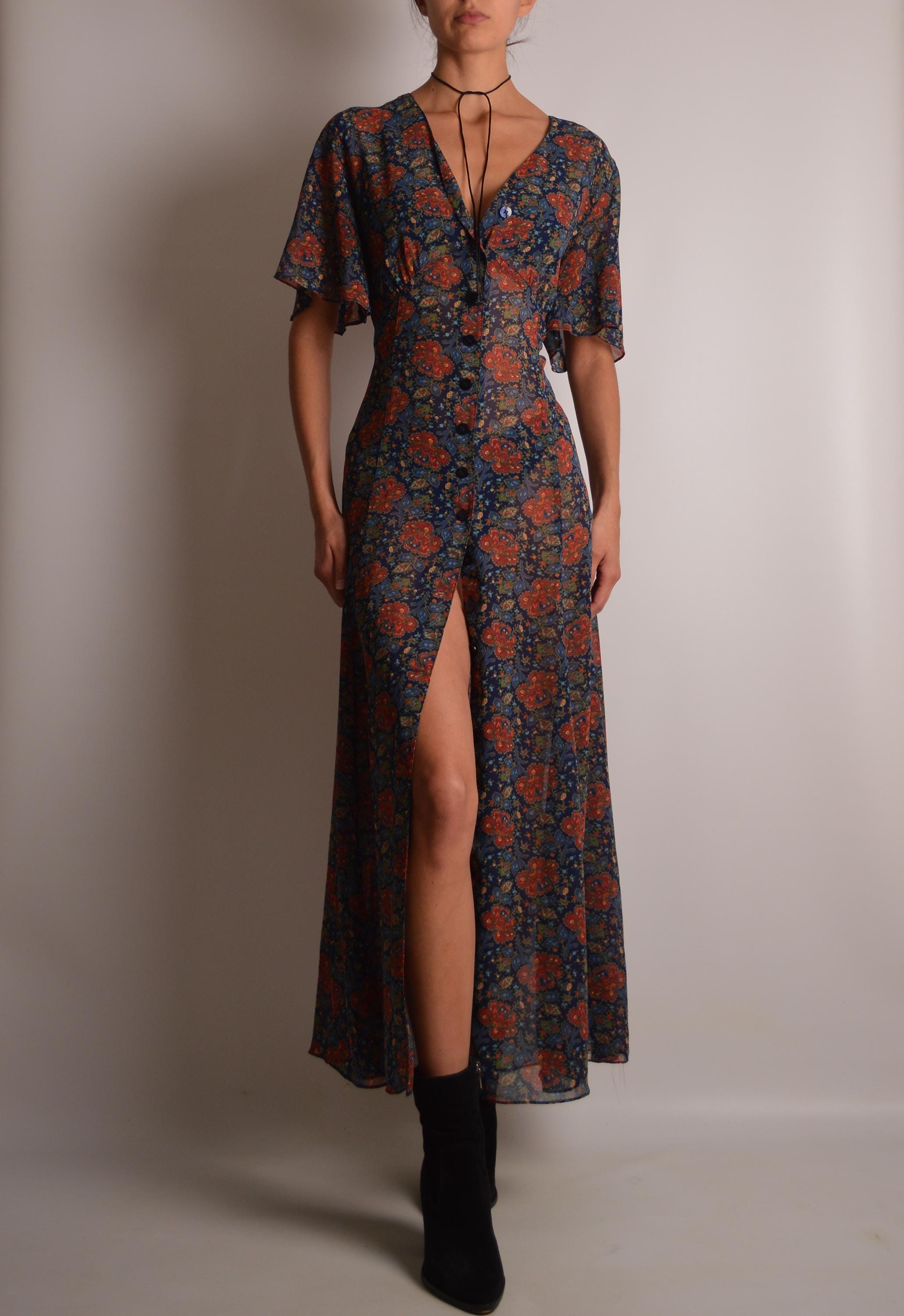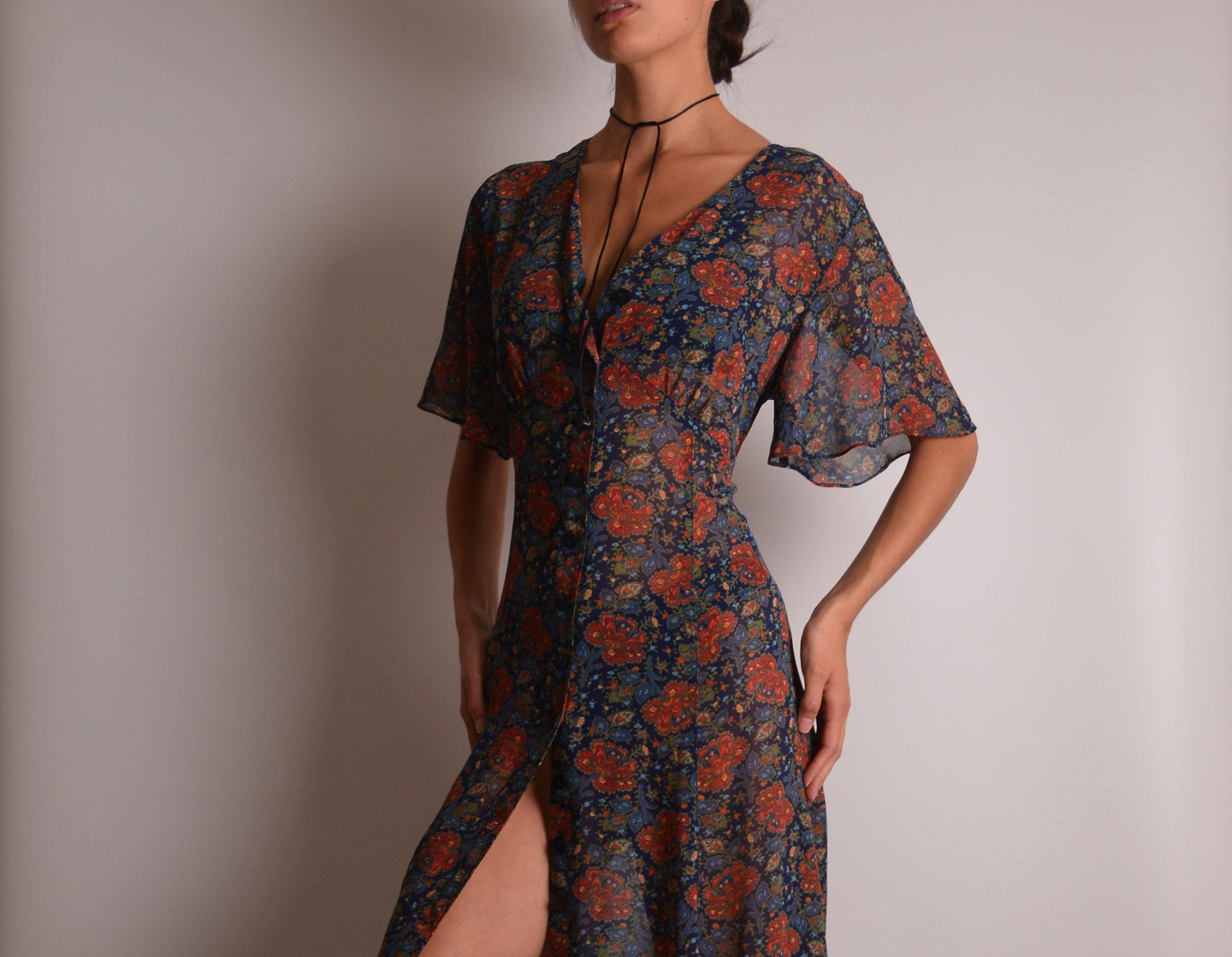 Lovley vintage floral print dress. Button-front closure, flutter sleeves, and sheer lightweight fabric. Shown with a gold clip on the back to take in the fit on the model. The clip is included to accommodate a range of sizes.