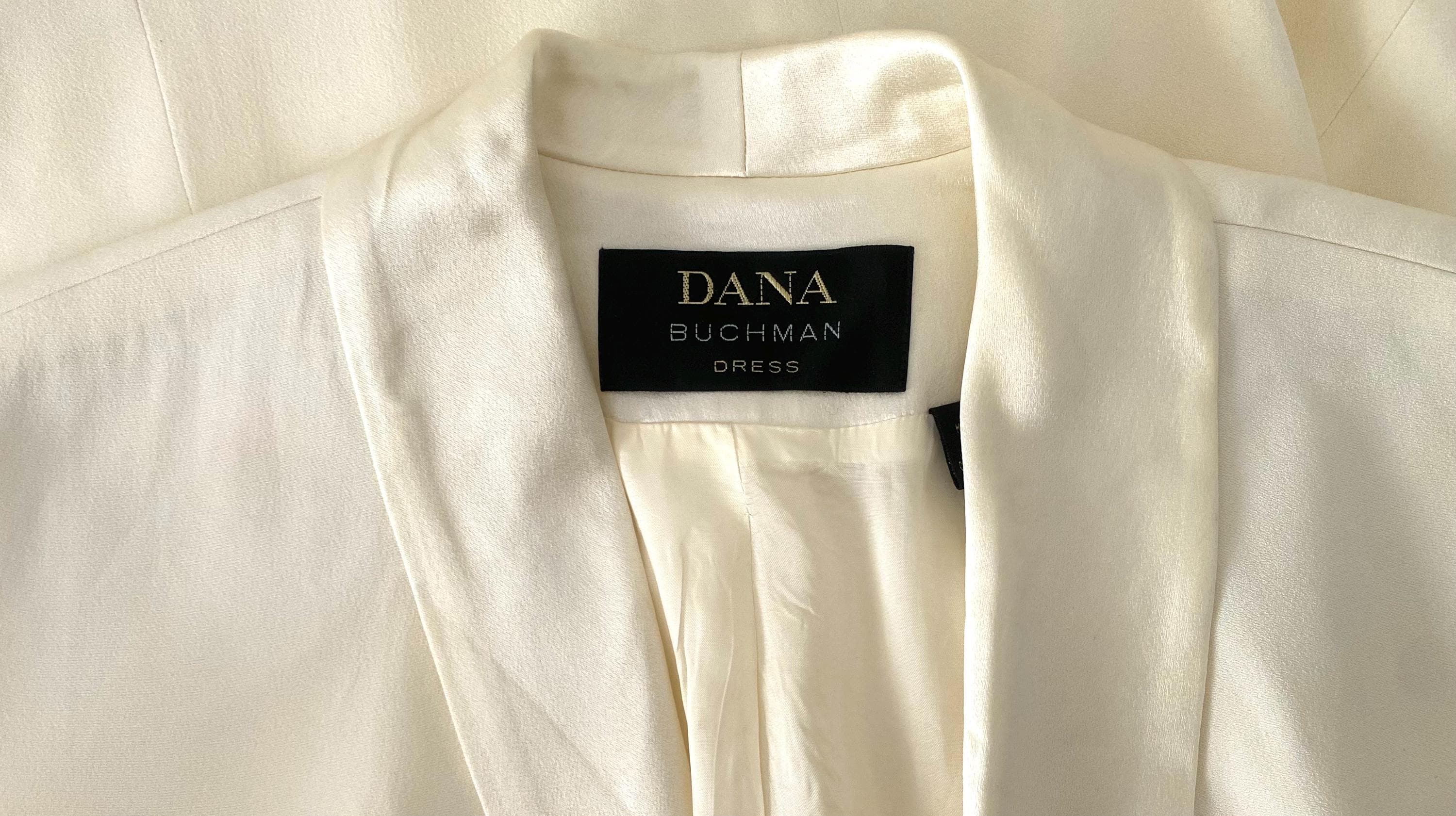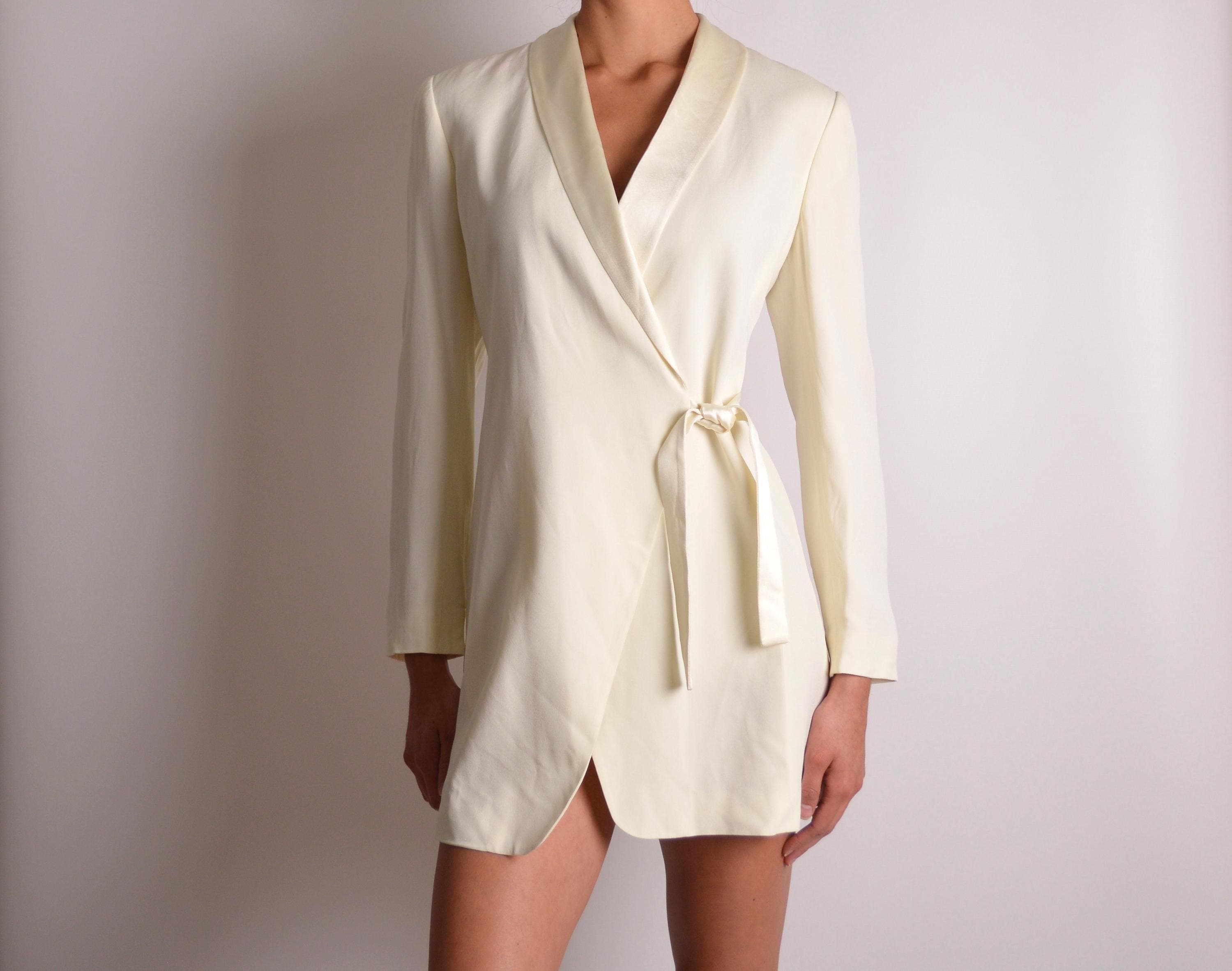 Incredible vintage cream wrap blazer. Just long enough to be a perfect mini dress, also looks fantastic paired with jeans or shorts. Thin shoulder pads, satin lapel and tie, and fully lined. The gold clip shown will be included to allow fit adjustment. Minimalist chic at its best