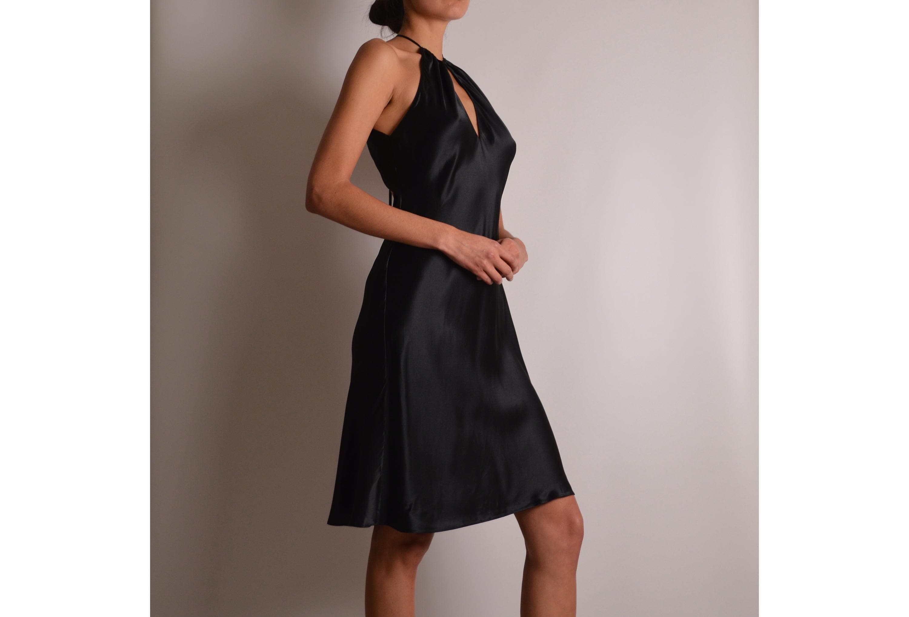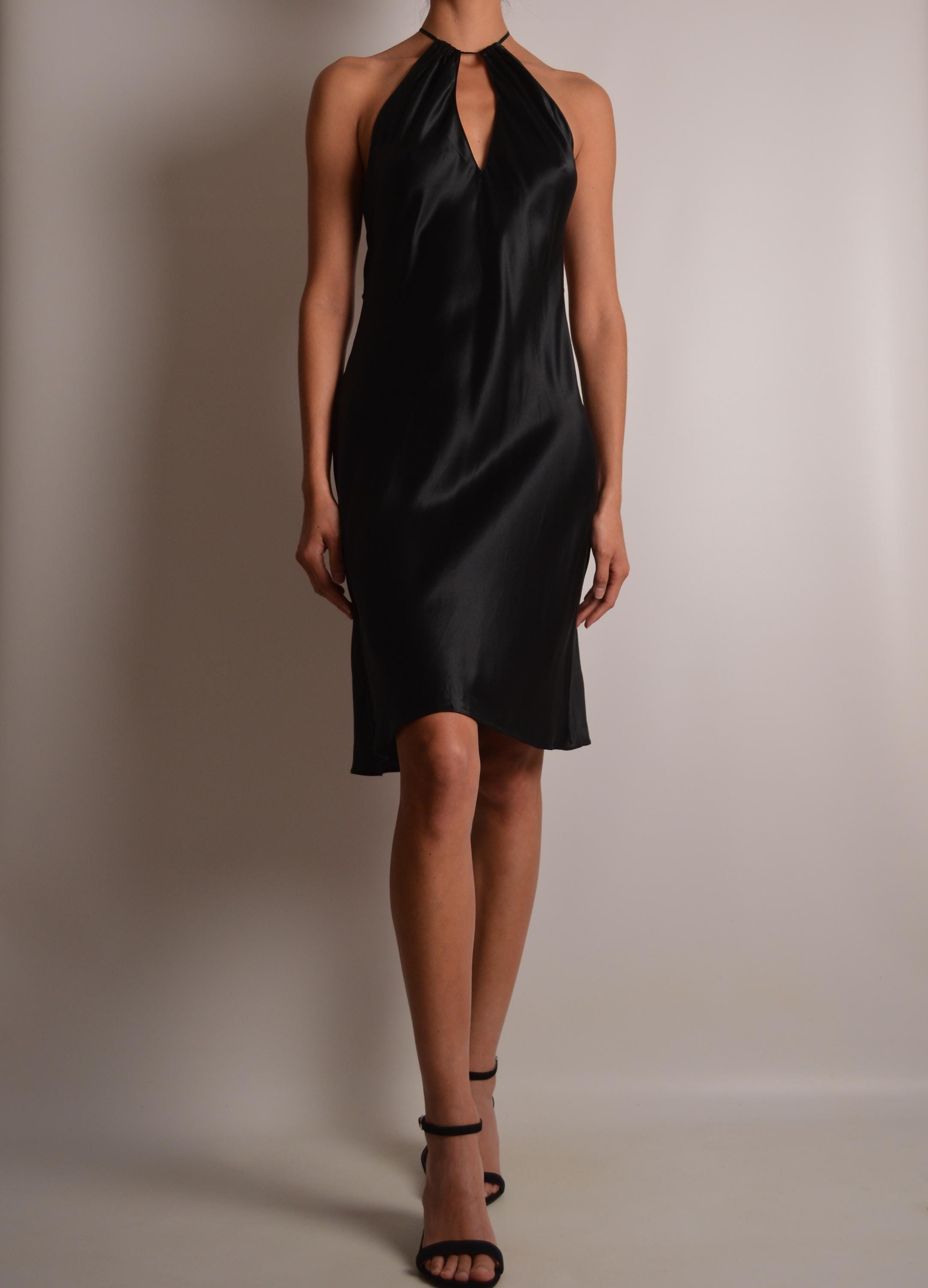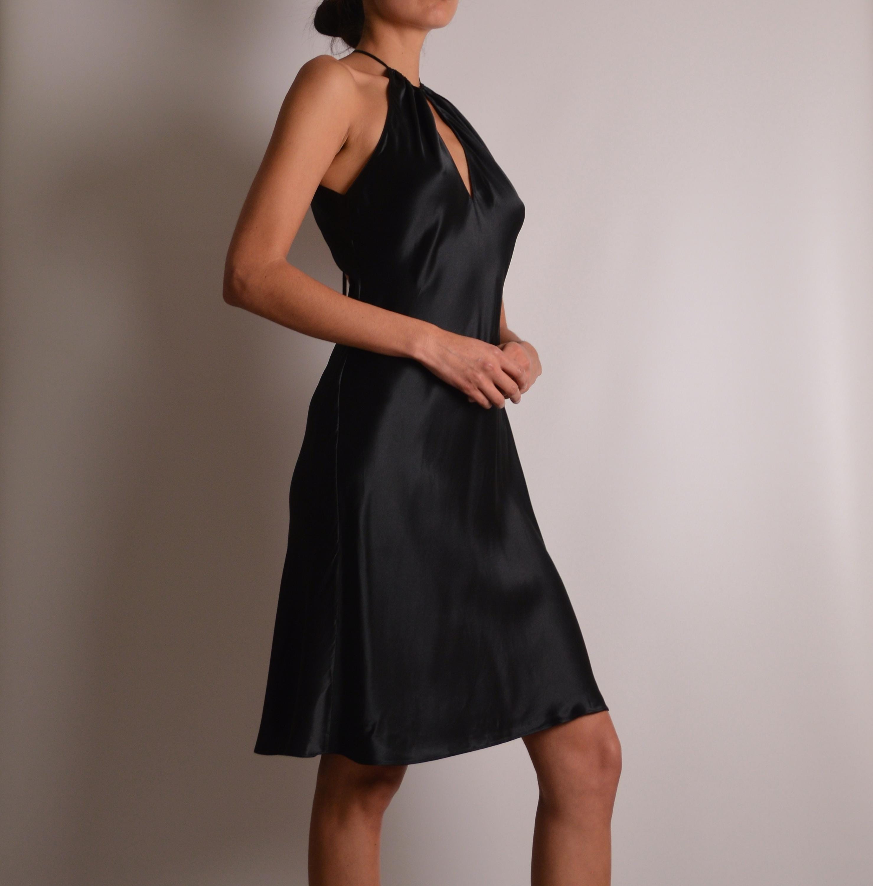 Stunning vintage Victoria's Secret (pink label), black silk slip dress. Open back, tiny straps, super soft. High neckline with keyhole detail. Perfect classy length. So delicate and feminine