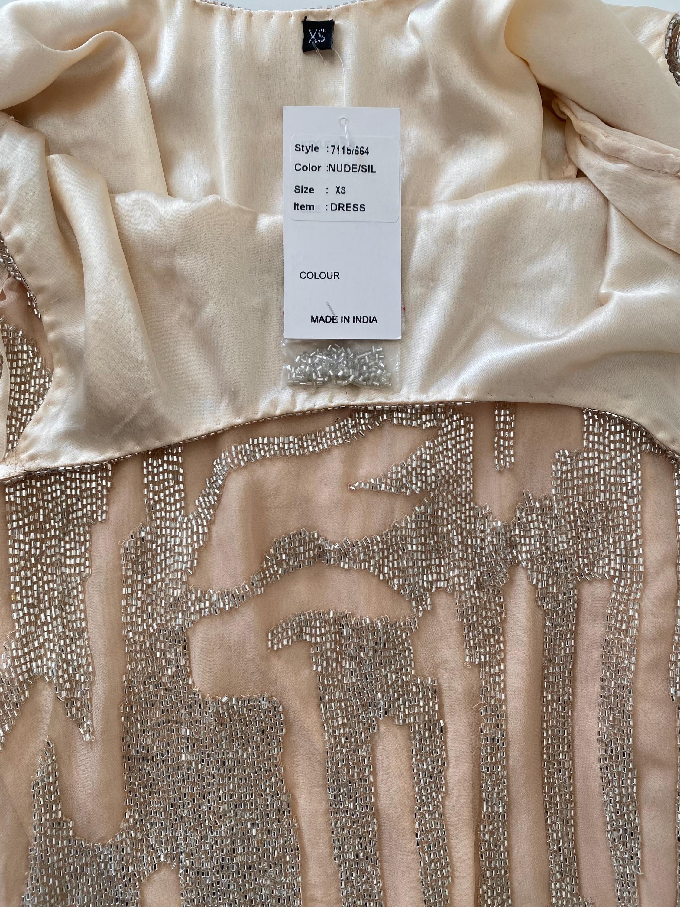 Absolutely stunning, fully beaded silk cocktail dress. Gorgeous nude silk with silver beading all over. No closure, must carefully pull over the head. Original tag attached. So incredible
