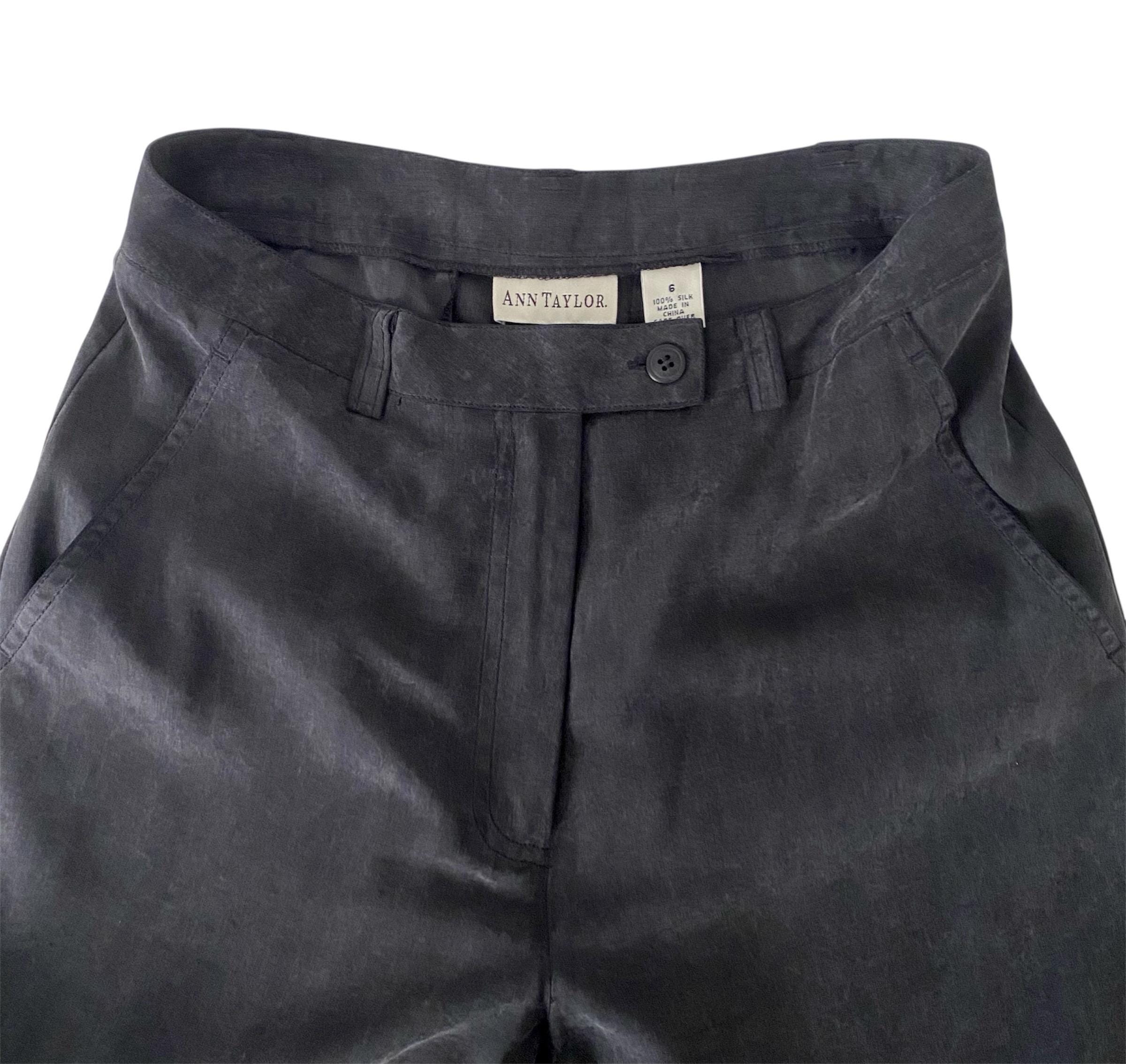 Ultra cool vintage Ann Taylor silk trousers. The silk is a unique dusty gray with a brushed appearance. These have pockets, a high waist, and a relaxed leg. Super soft, lightweight, and unlined. So good