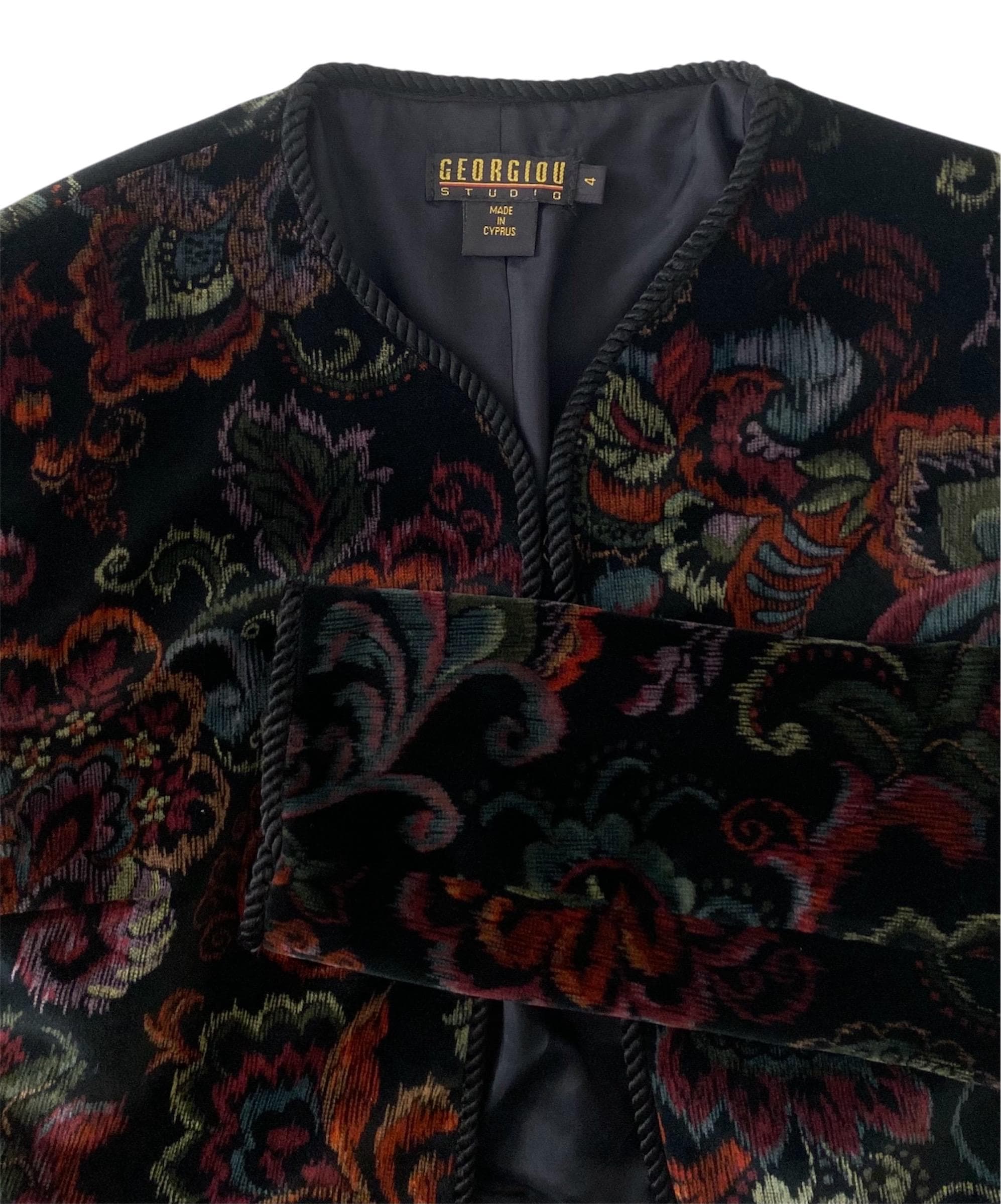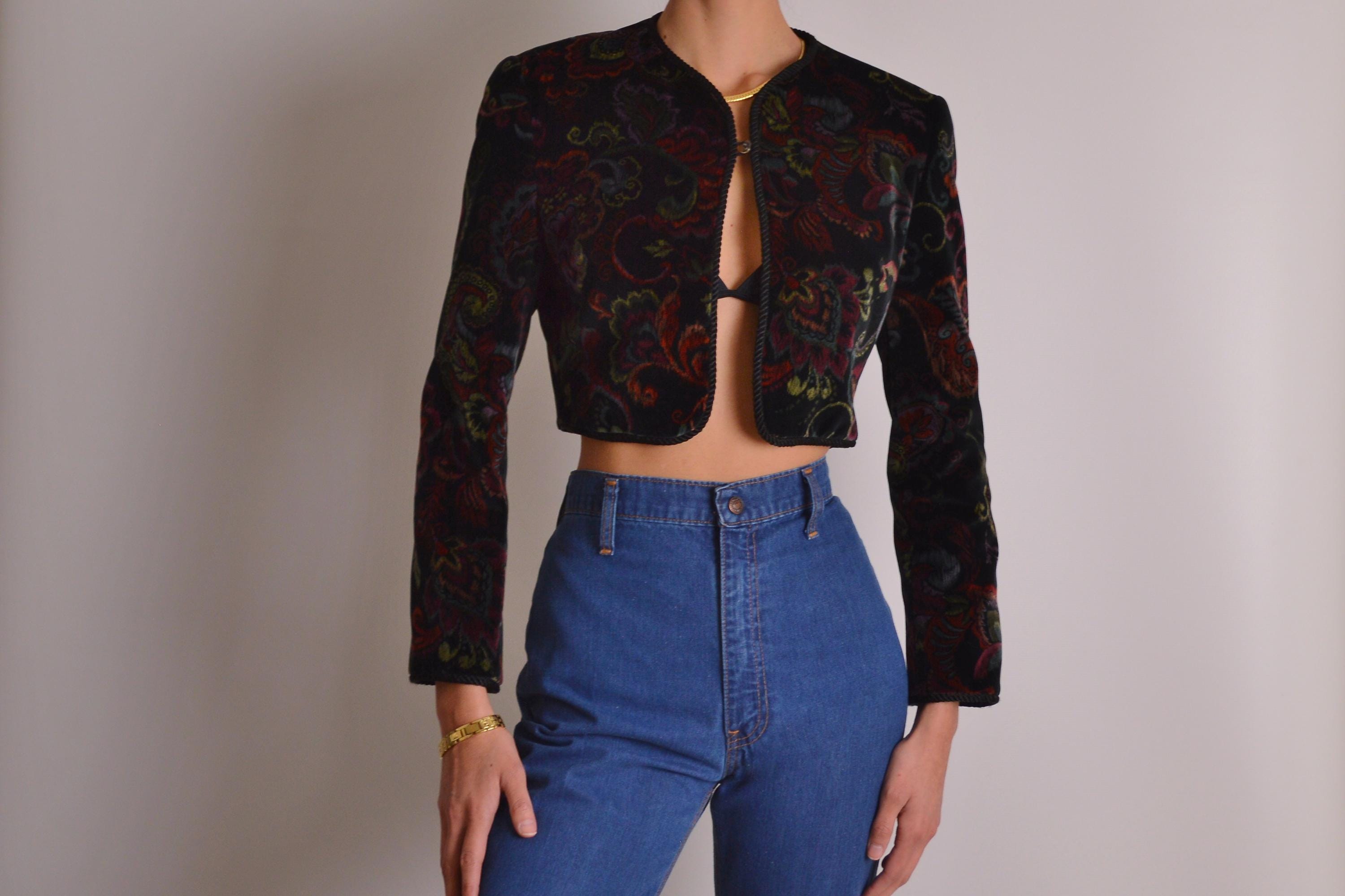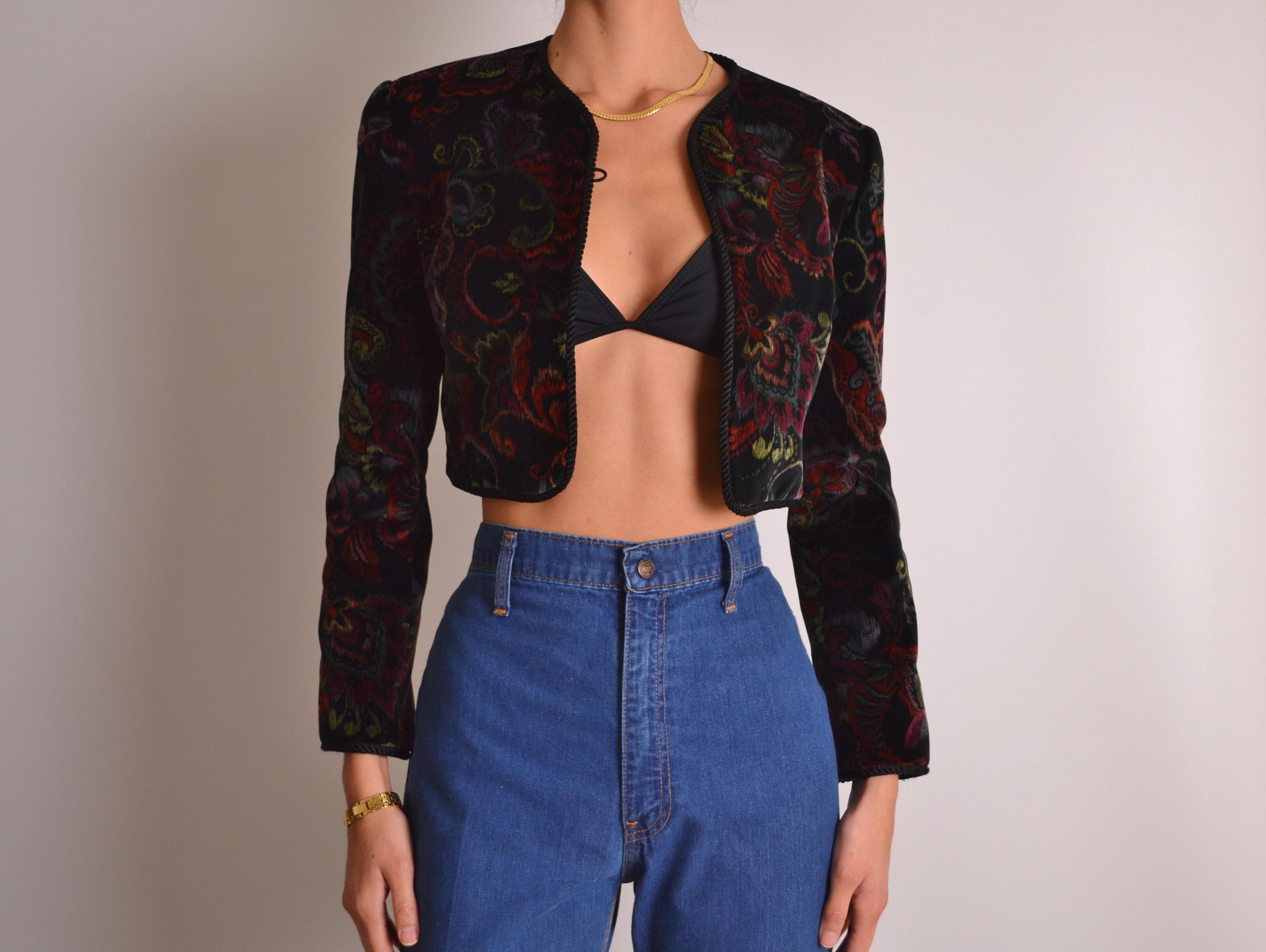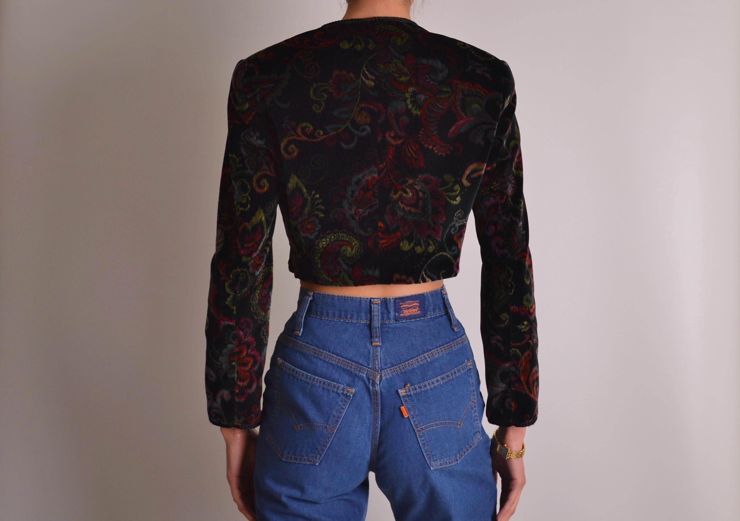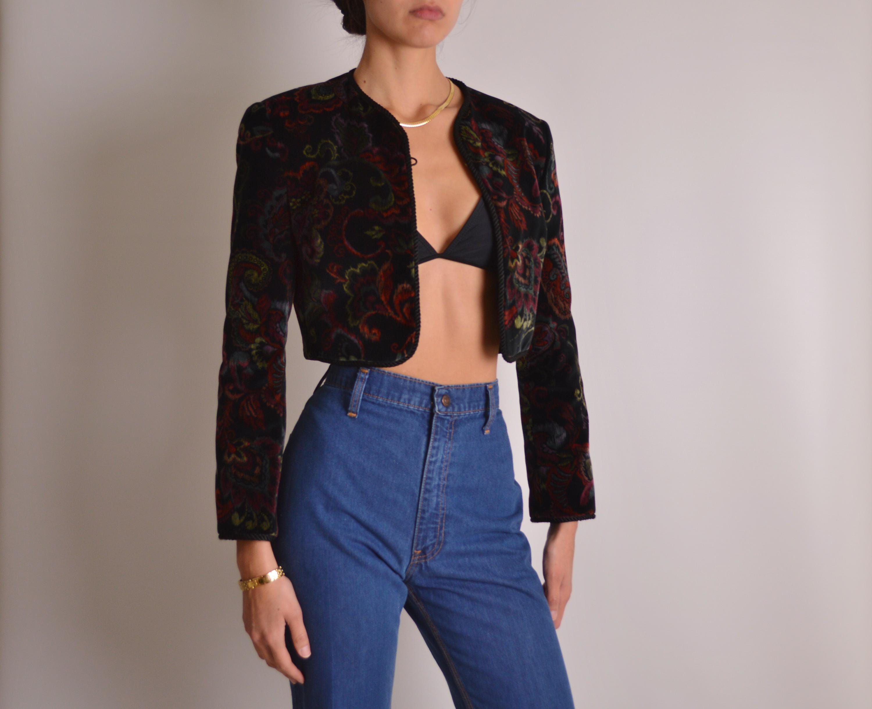 Amazing vintage velvet bolero jacket. Gorgeous paisley print and rope trim detail make this one extra special. One button closure, perfectly padded shoulders, and fully lined. Beautiful quality and a unique vintage piece