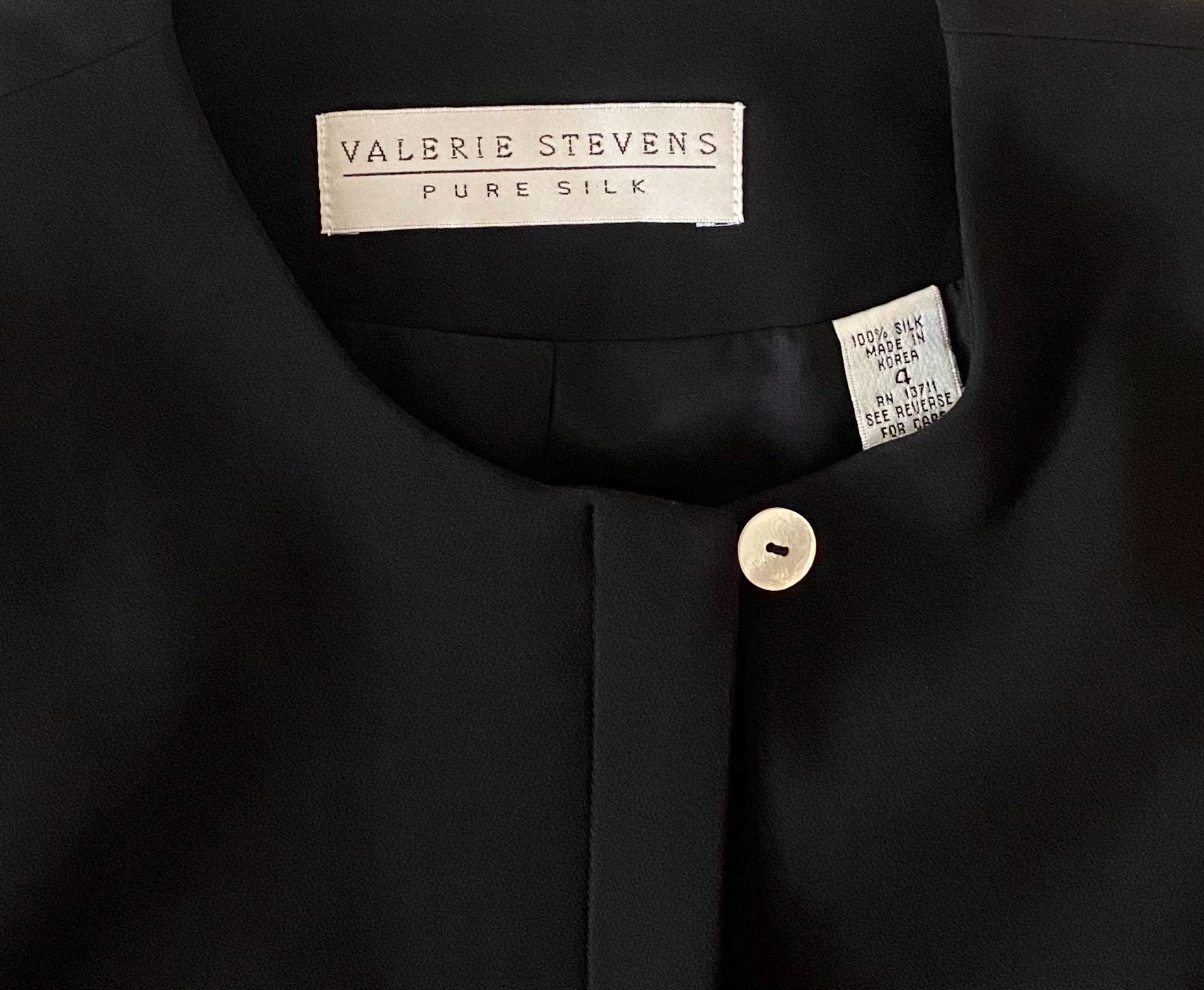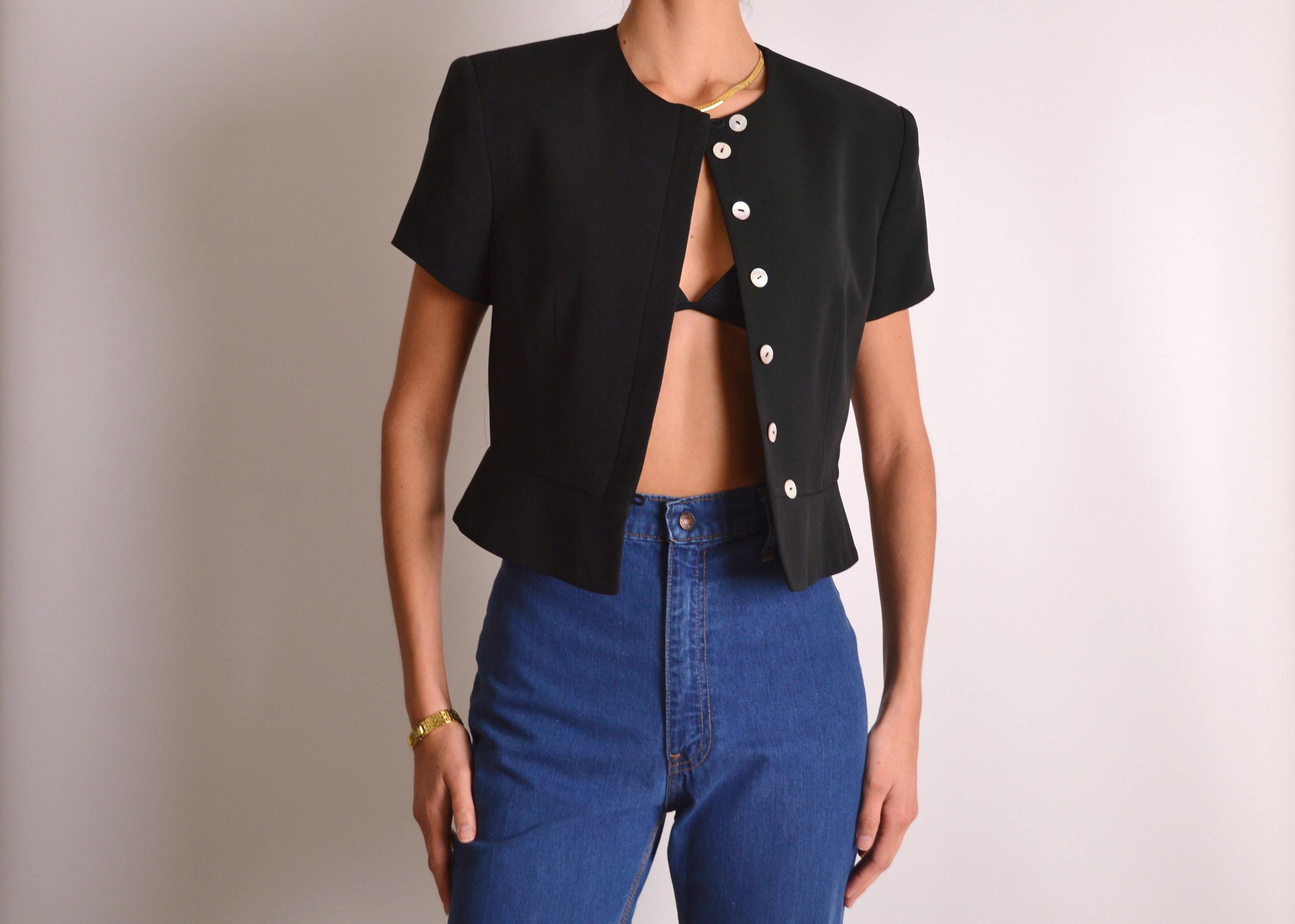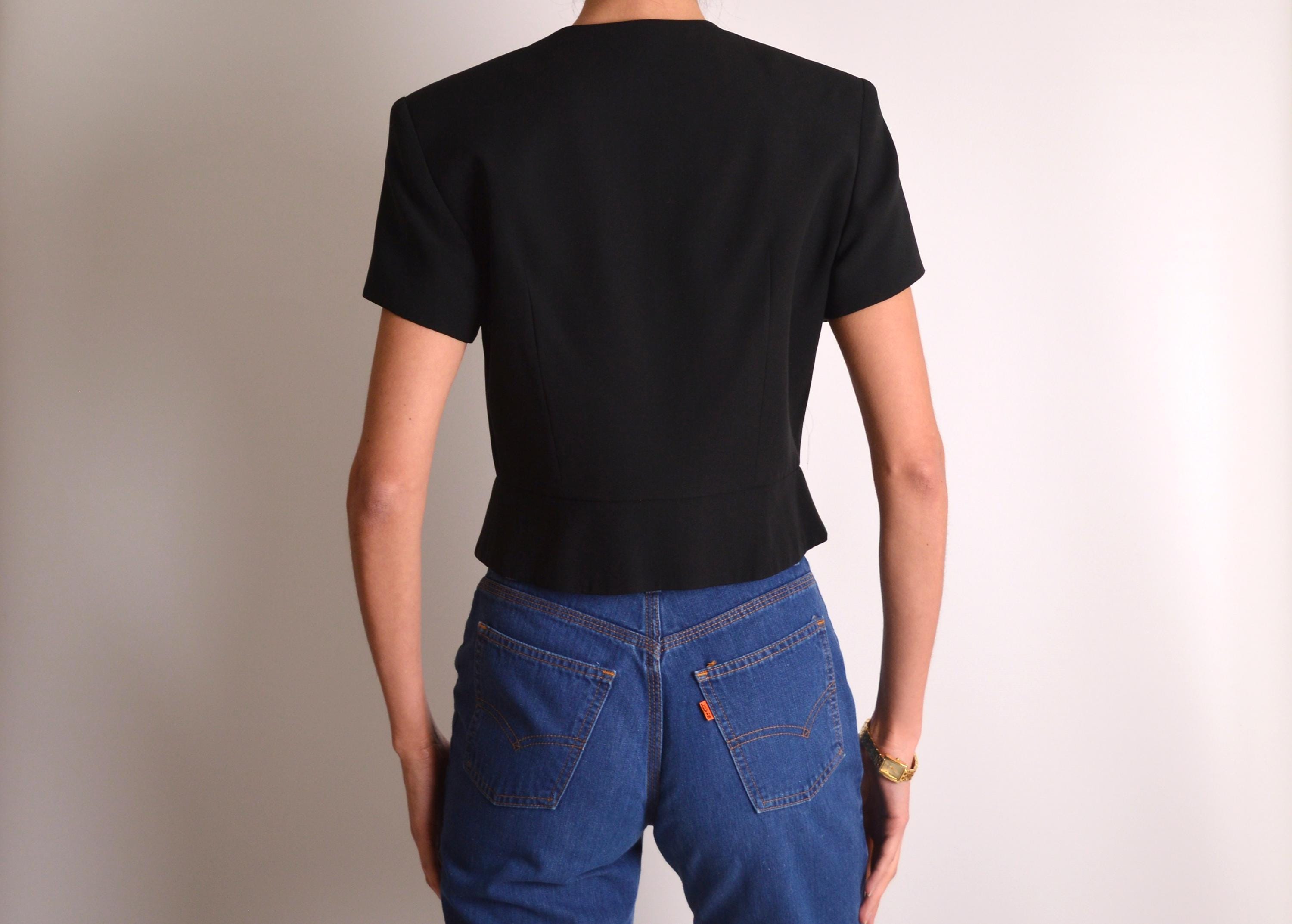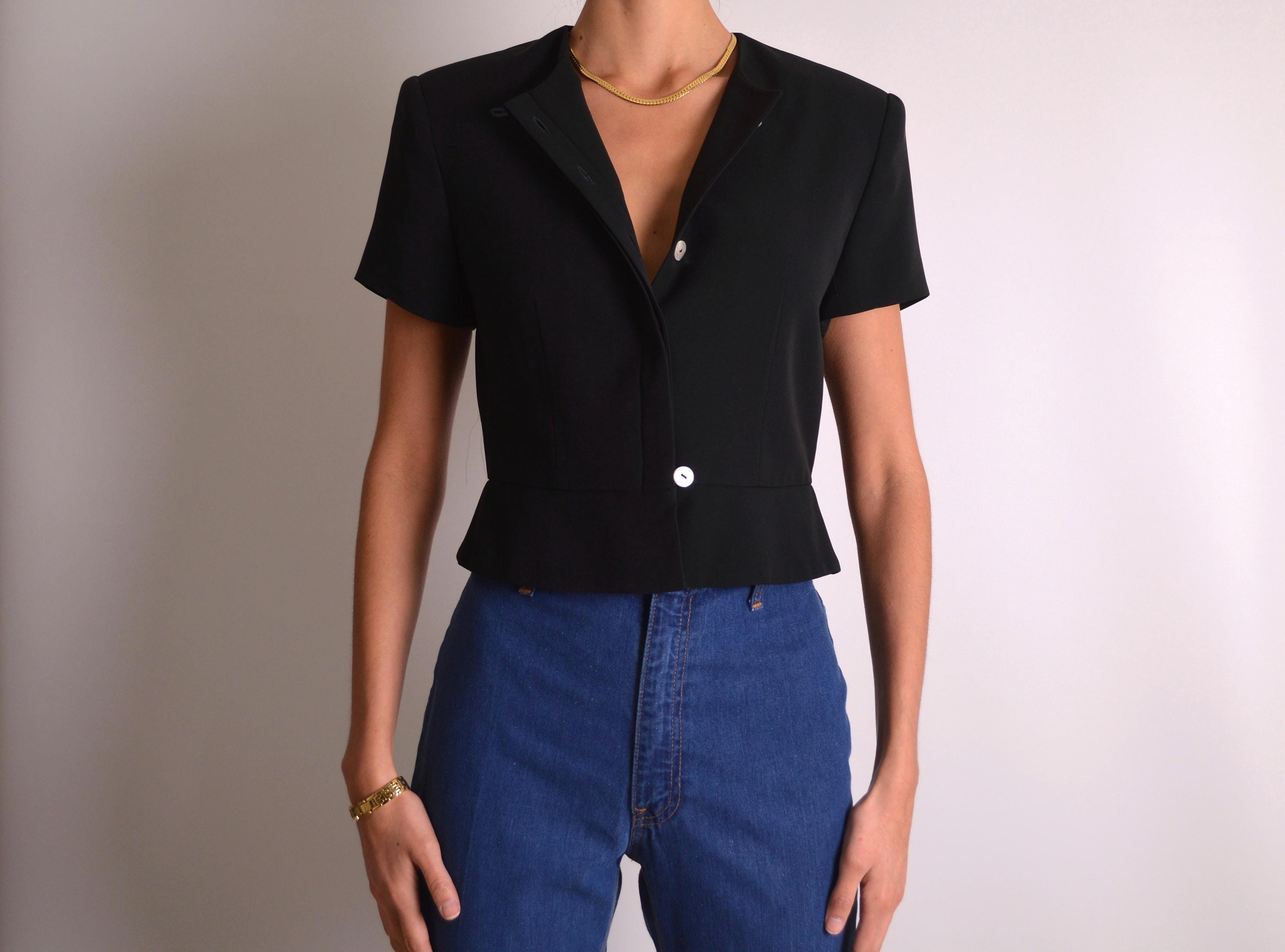 Gorgeous vintage black silk top. Tailored fit and fully lined, like a short-sleeve blazer. Beautiful mother-of-pearl buttons from the neck to the waist. Quality construction. Layer it over a silk camisole for the office. So chic