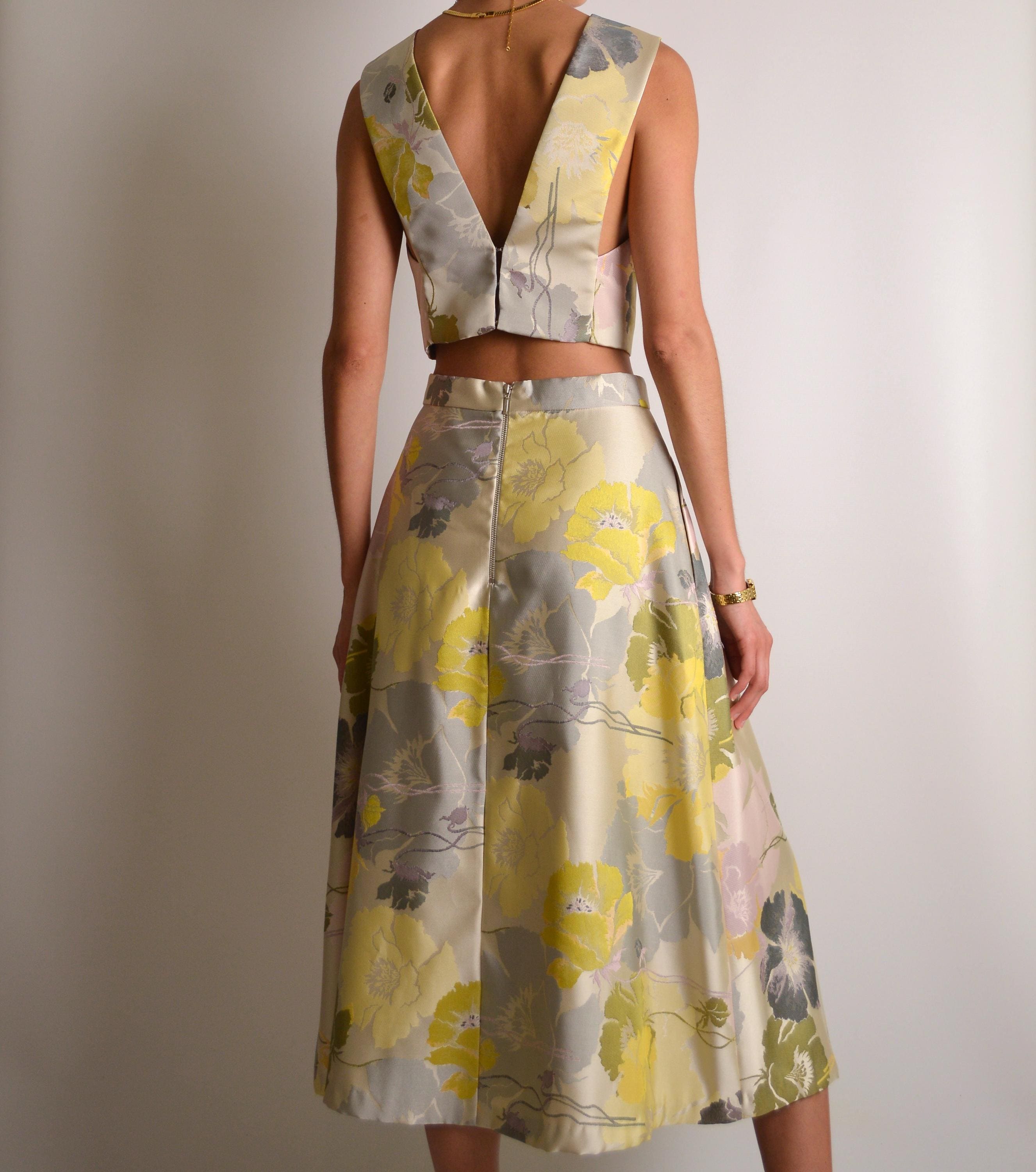 Absolutely incredible Y2K's vintage top and skirt set in a luscious brocade. The cropped top has hook-and-eye closures in the back. The A-line skirt has pockets and a back zipper. Both pieces are fully lined. Perfect for a summer wedding or a derby party. Also, mix and match. Wear the skirt with a white tee and wear the top with jeans. Original tags attached. Made in USA. So gorgeous!