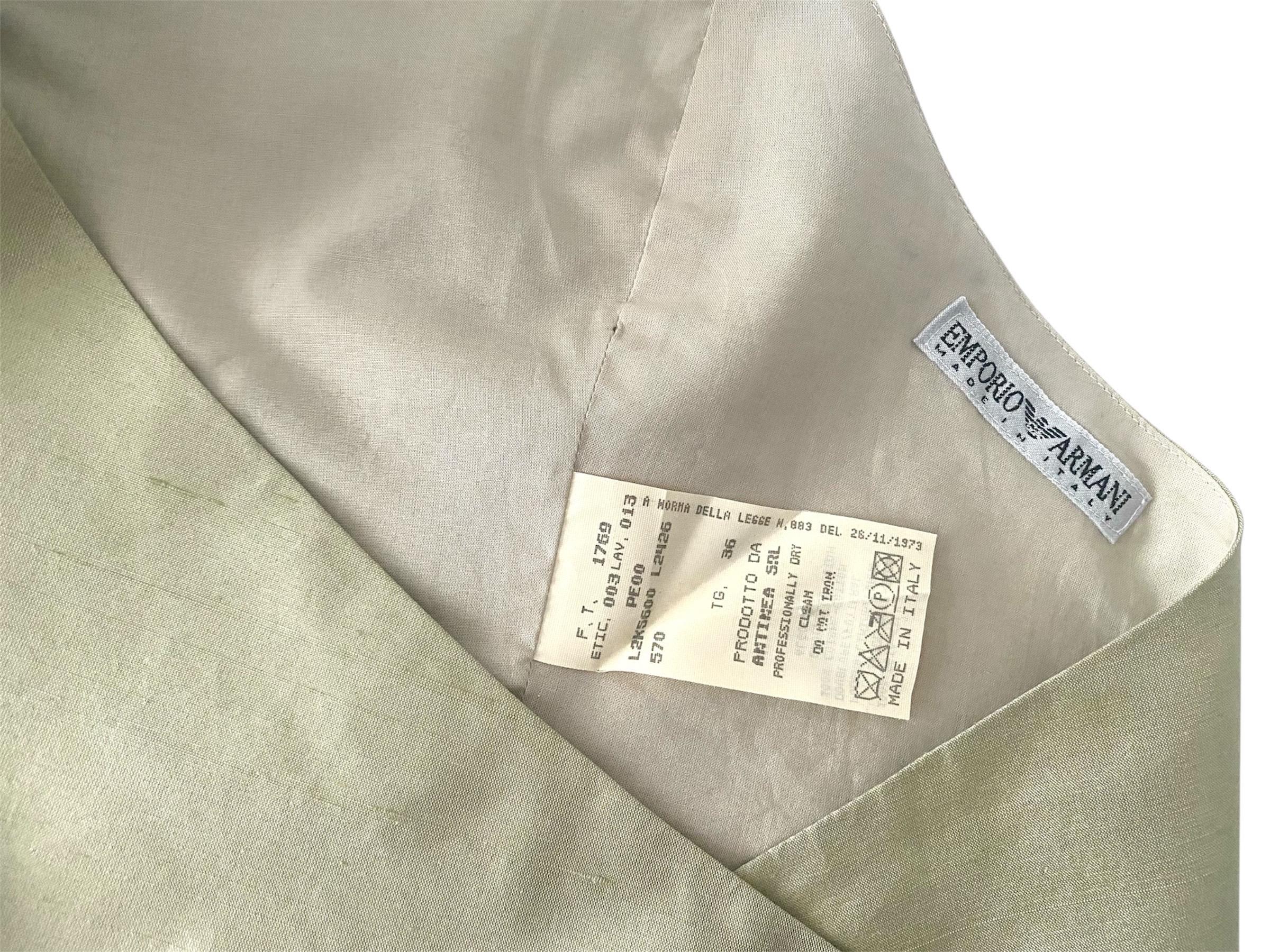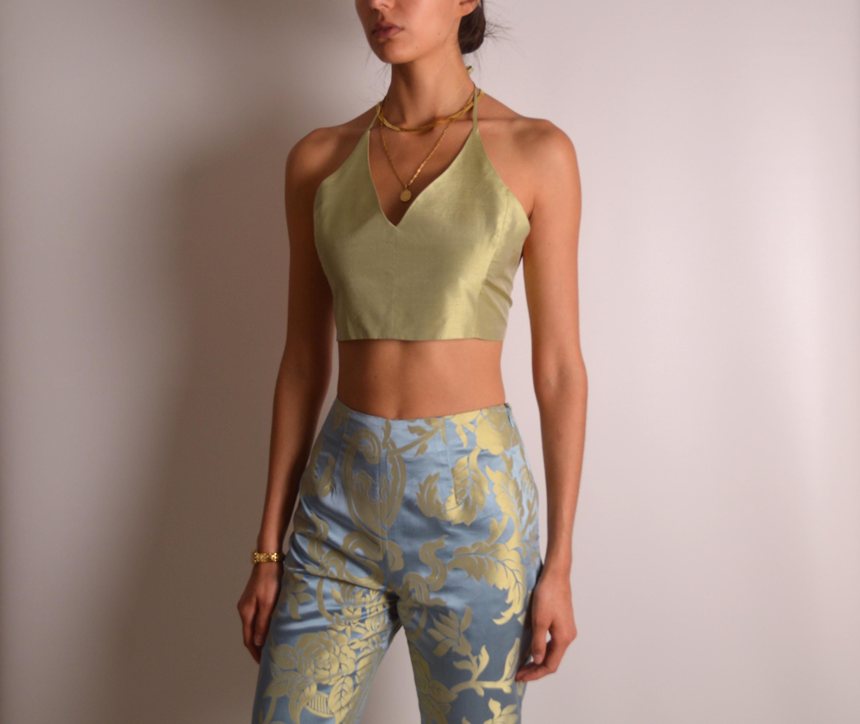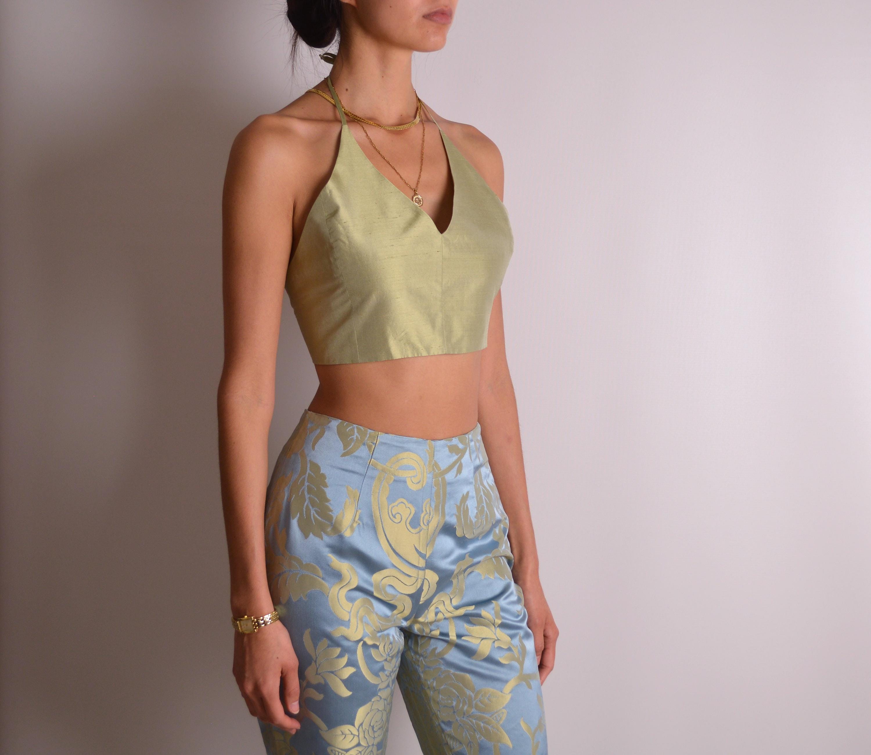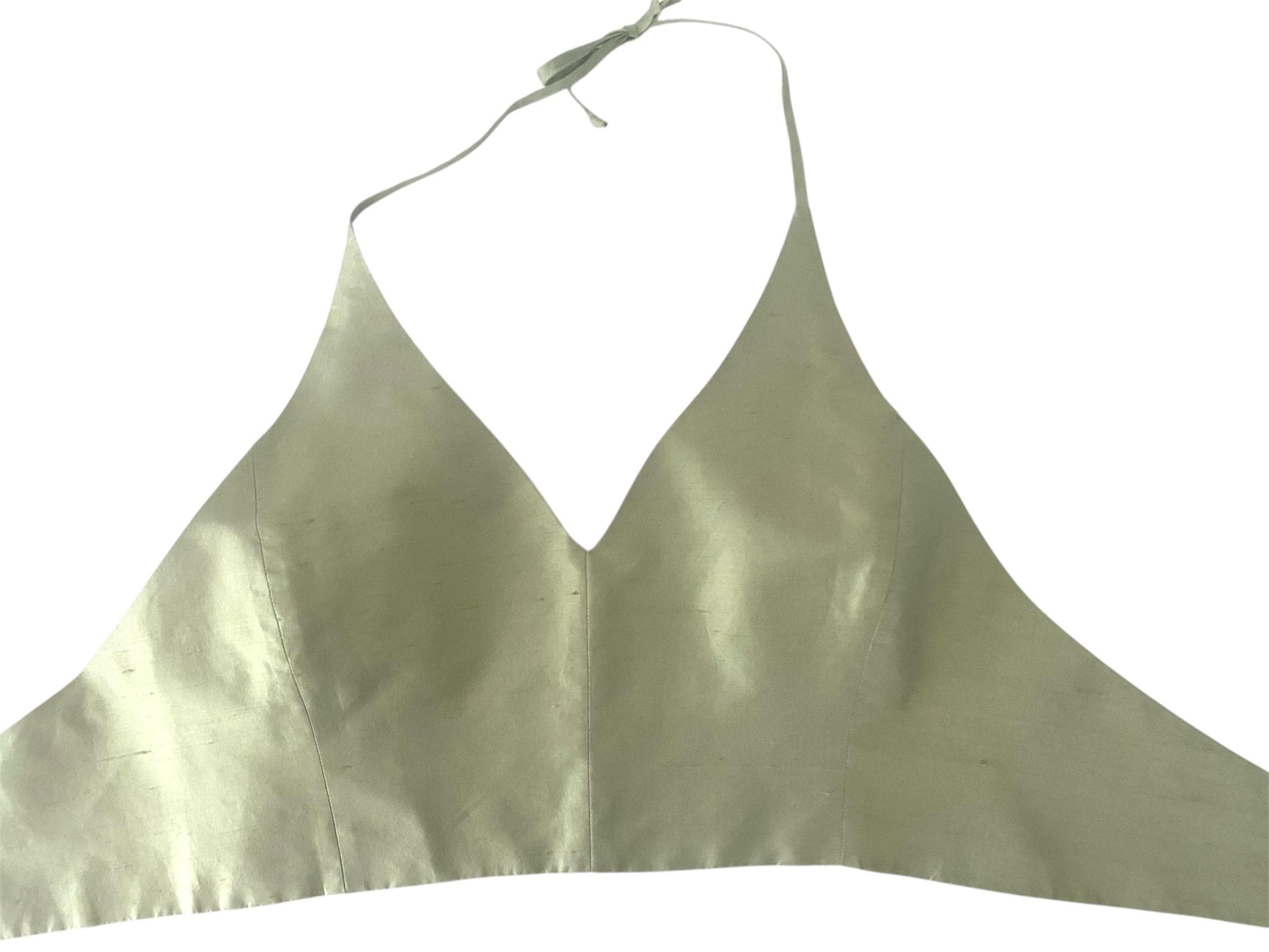 Vintage Armani silk halter crop top. Gorgeous raw silk in an iridescent pale green hue. Fully lined in 100% cotton. Tie neck and back allow adjustment of the fit. Fits extra small to small. Made in Italy. So good