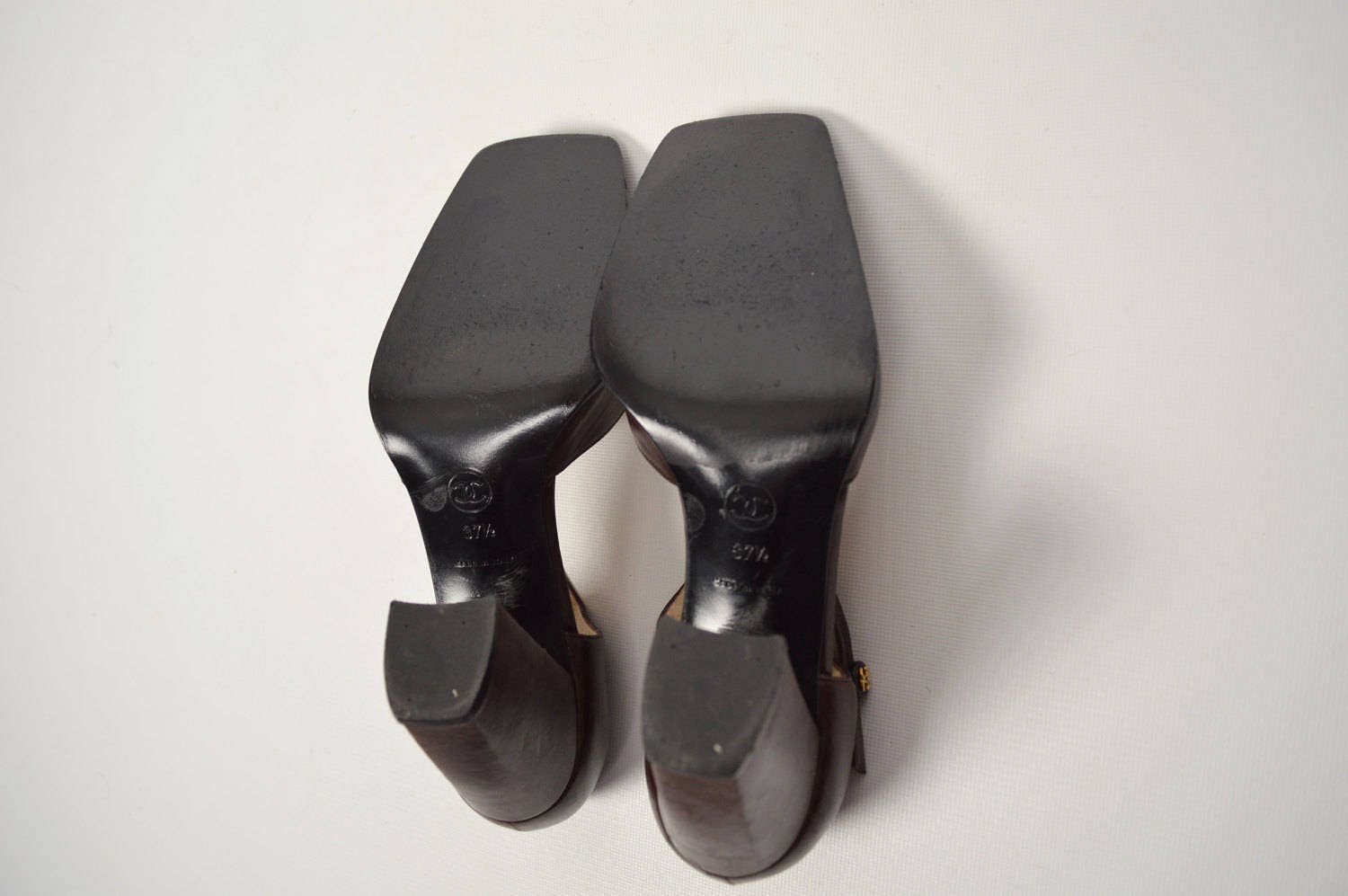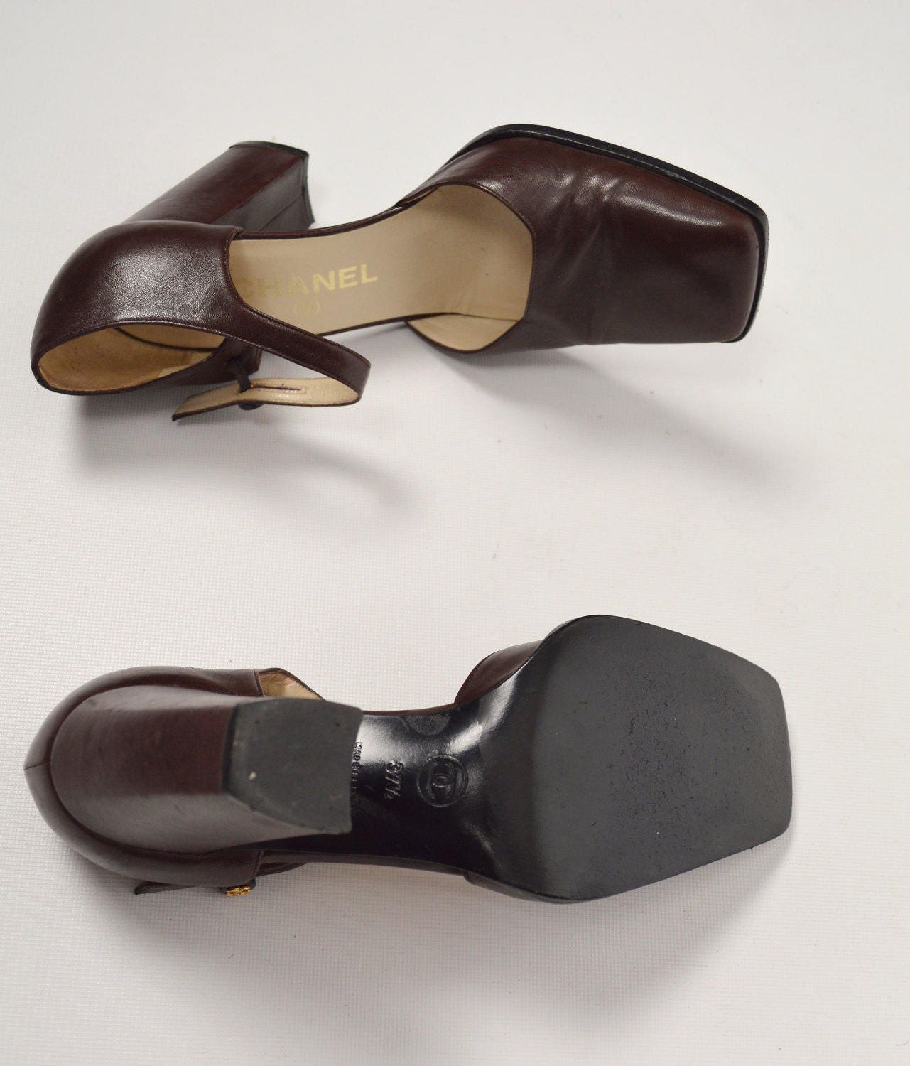 Vintage 90s Chanel classic burgundy / brown leather square toe heels. Featuring gold "CC" logo on the strap fastening. Thick square heel. The sole has had a light re-surfacing. They are in great condition with minor / normal signs of wear