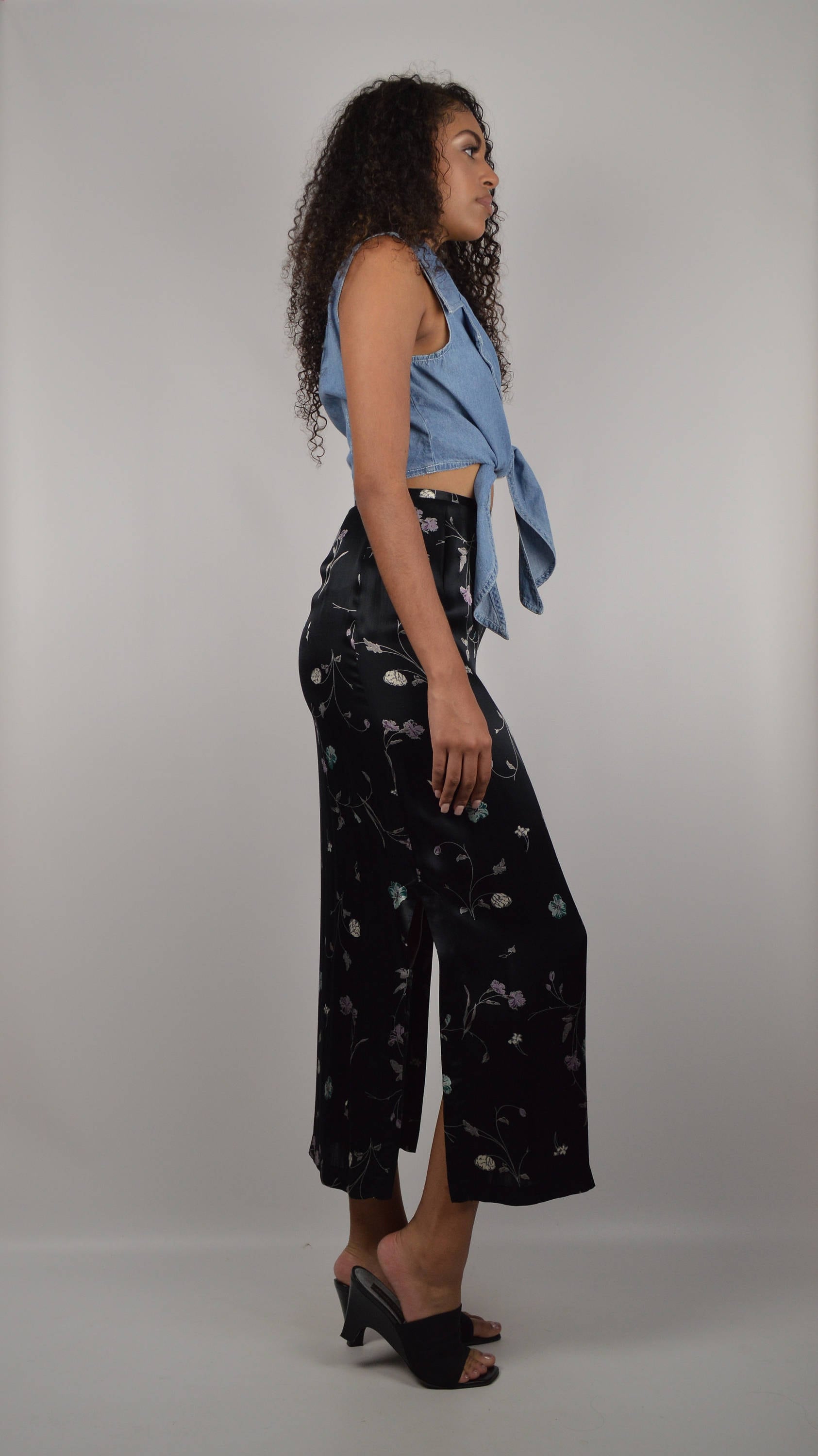 Vintage 90's black satiny floral print high waisted maxi skirt with side slits. Button and zipper closure