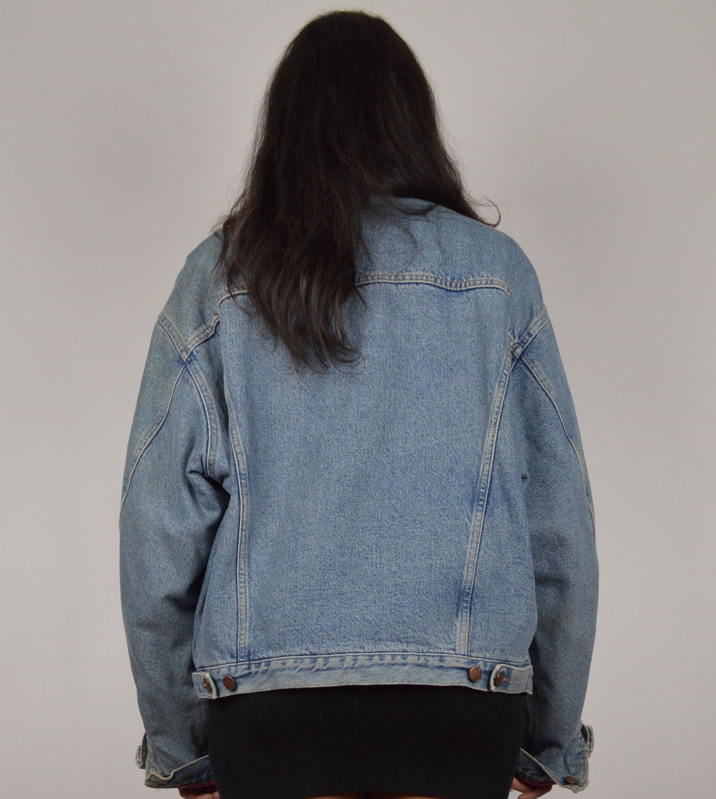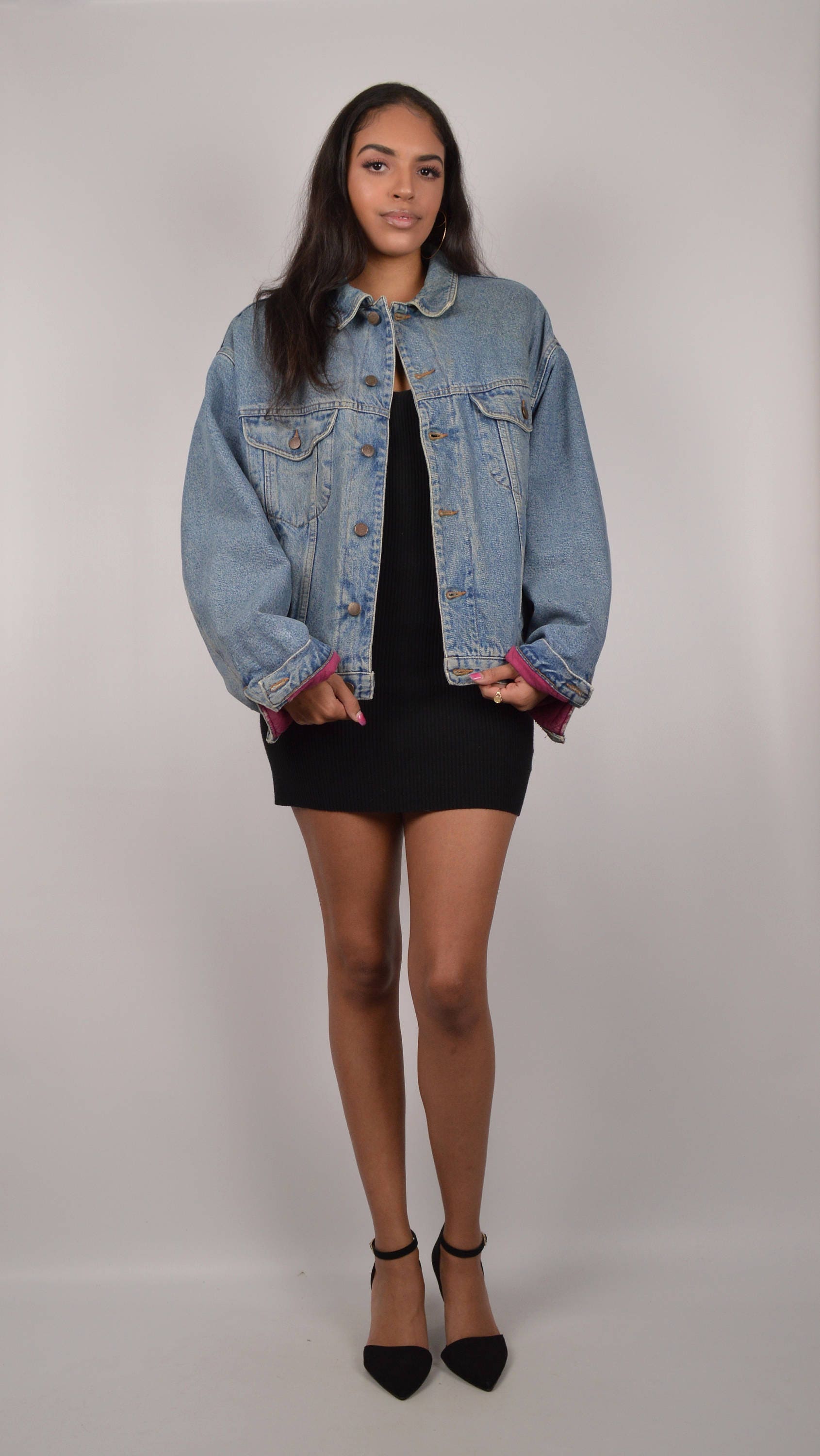 Vintage United Colors of Benetton blue jean jacket with magenta quilted poly-fill lining. Makes the jacket much warmer than a normal denim jacket. Oversized fit. Button closure. Hand and chest pockets. Made in Italy