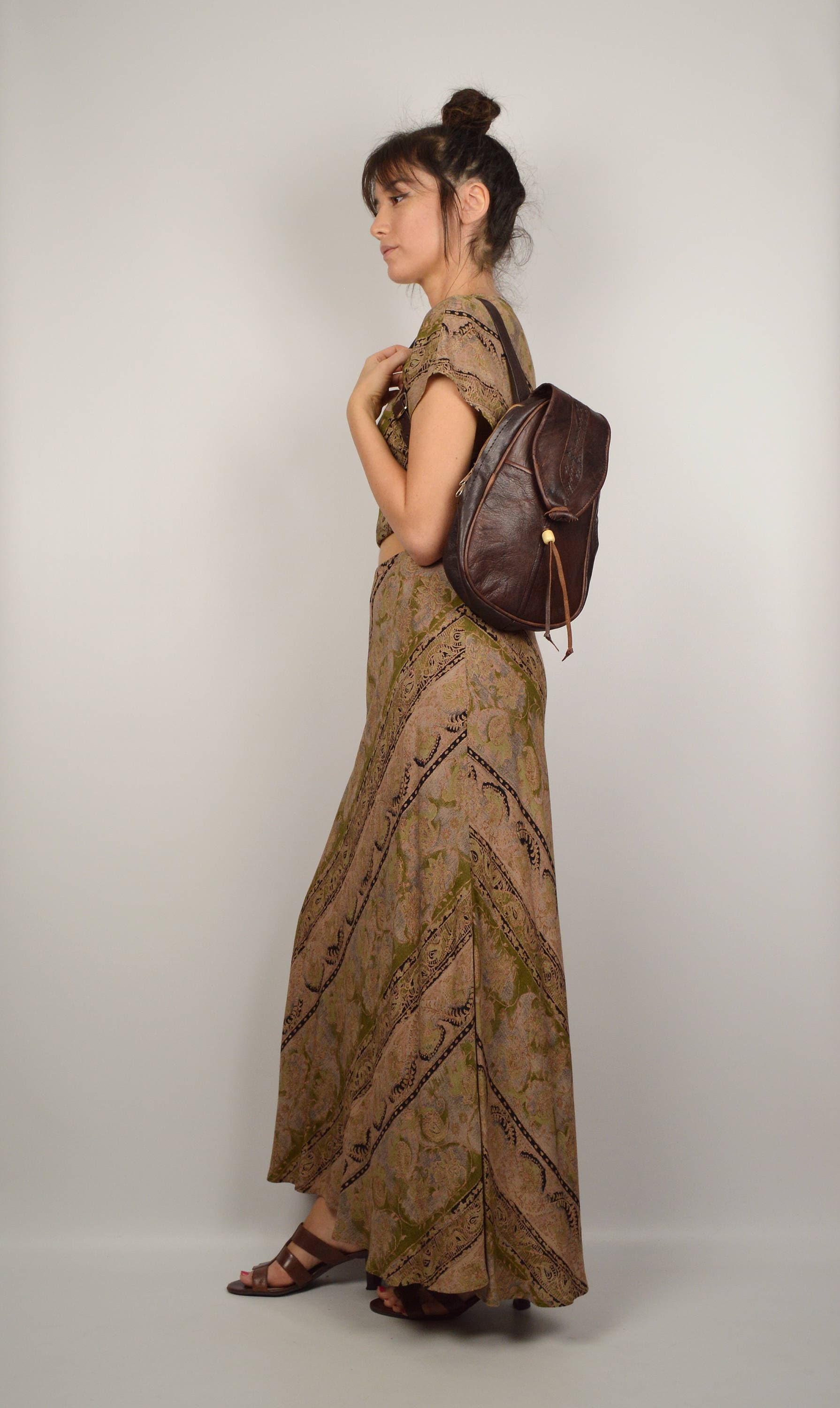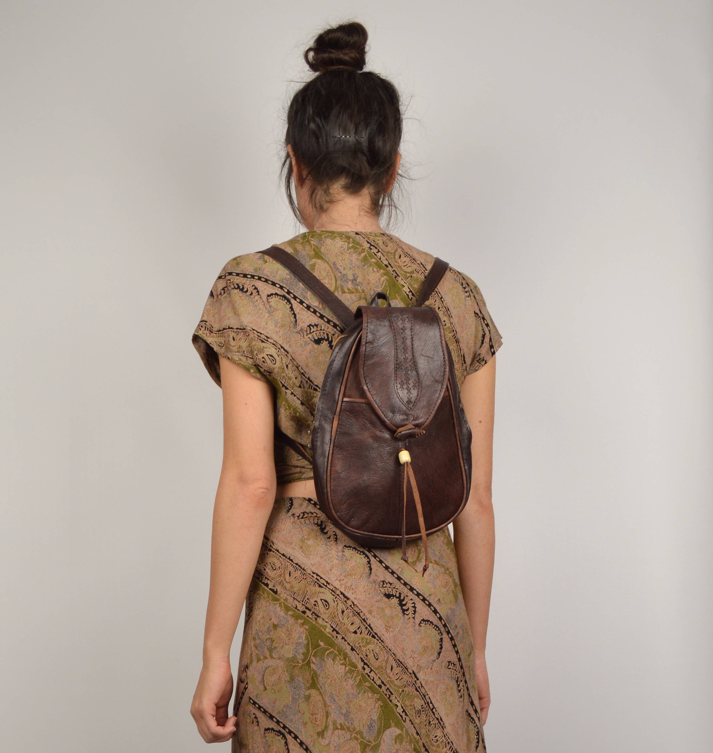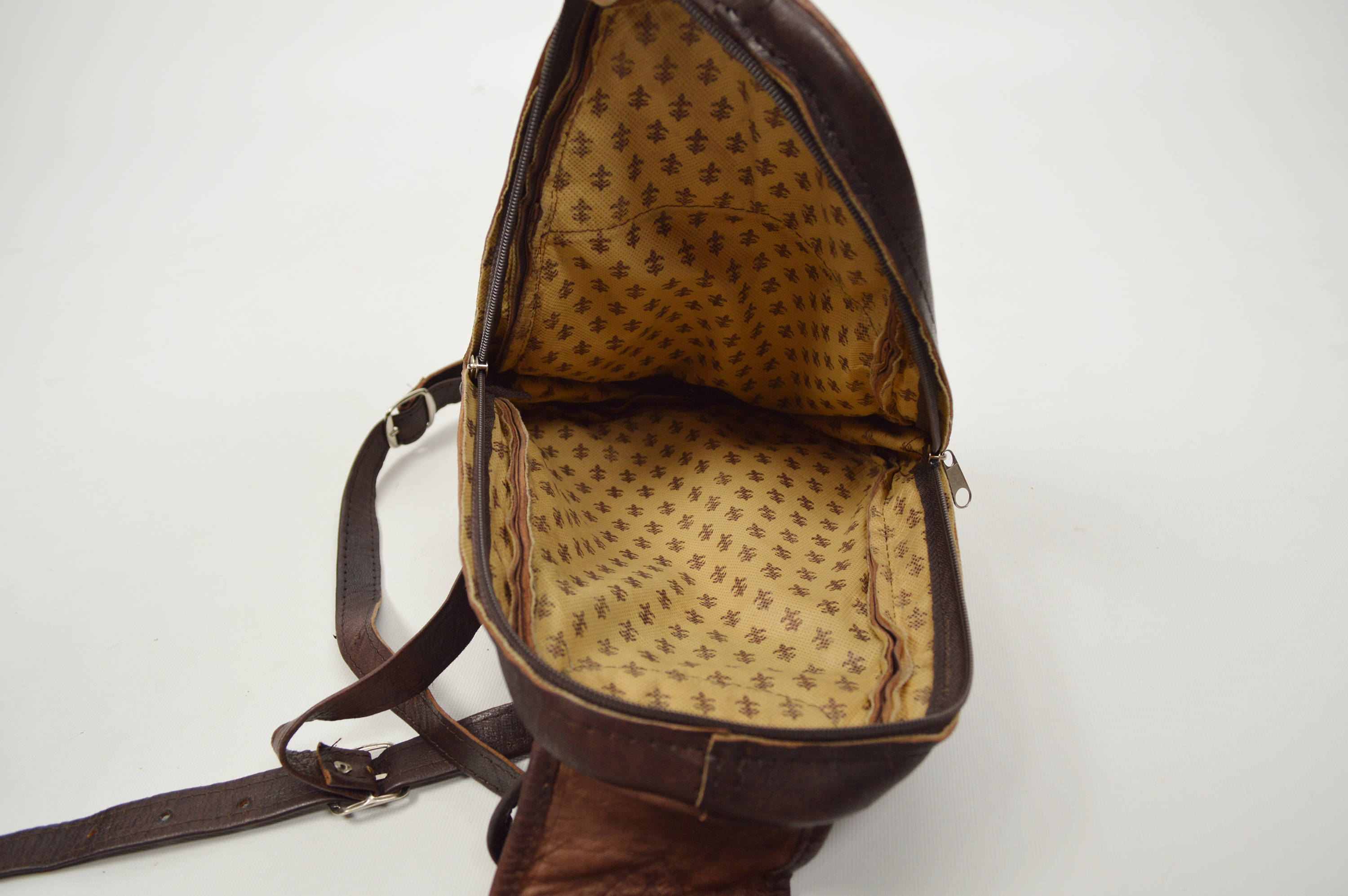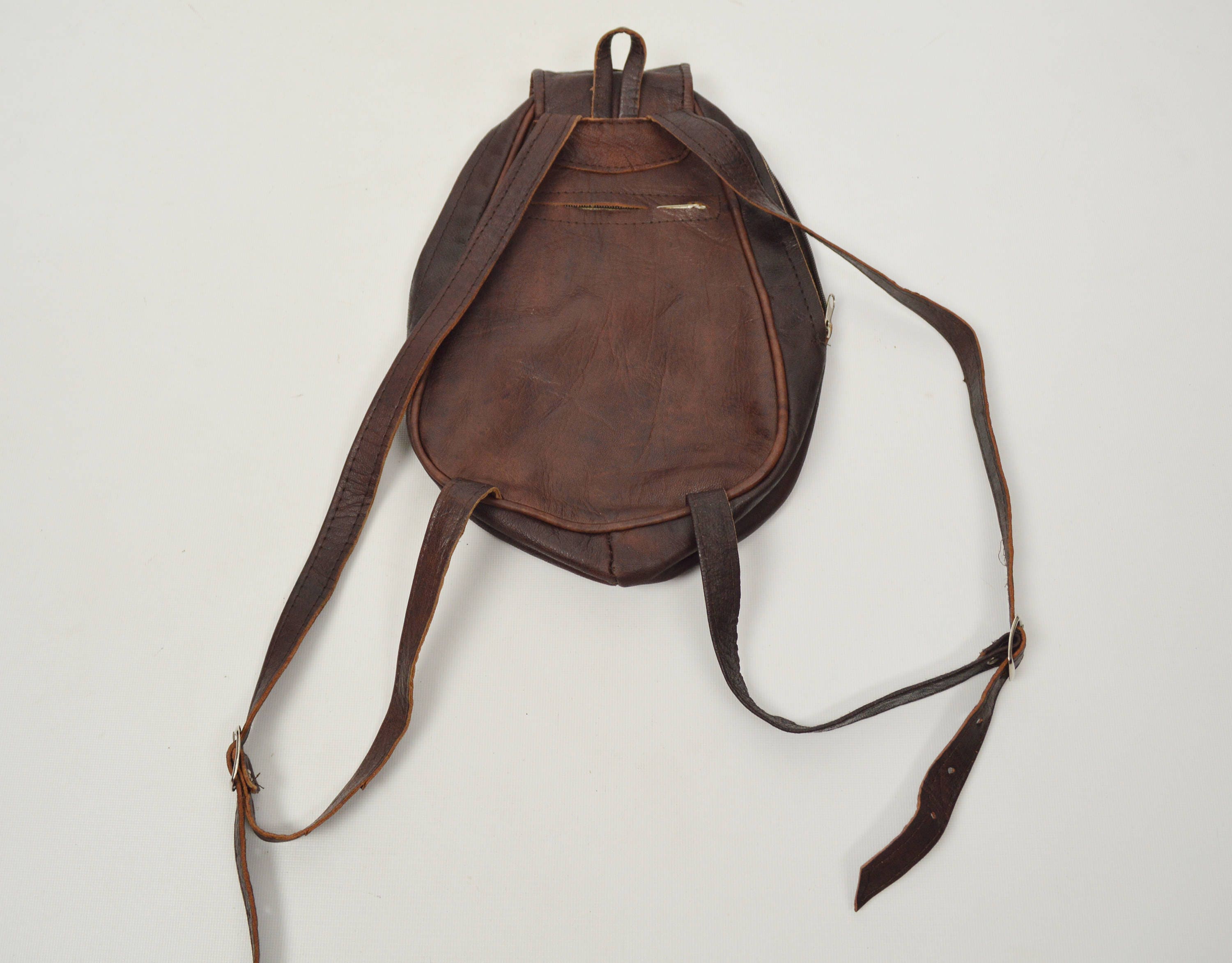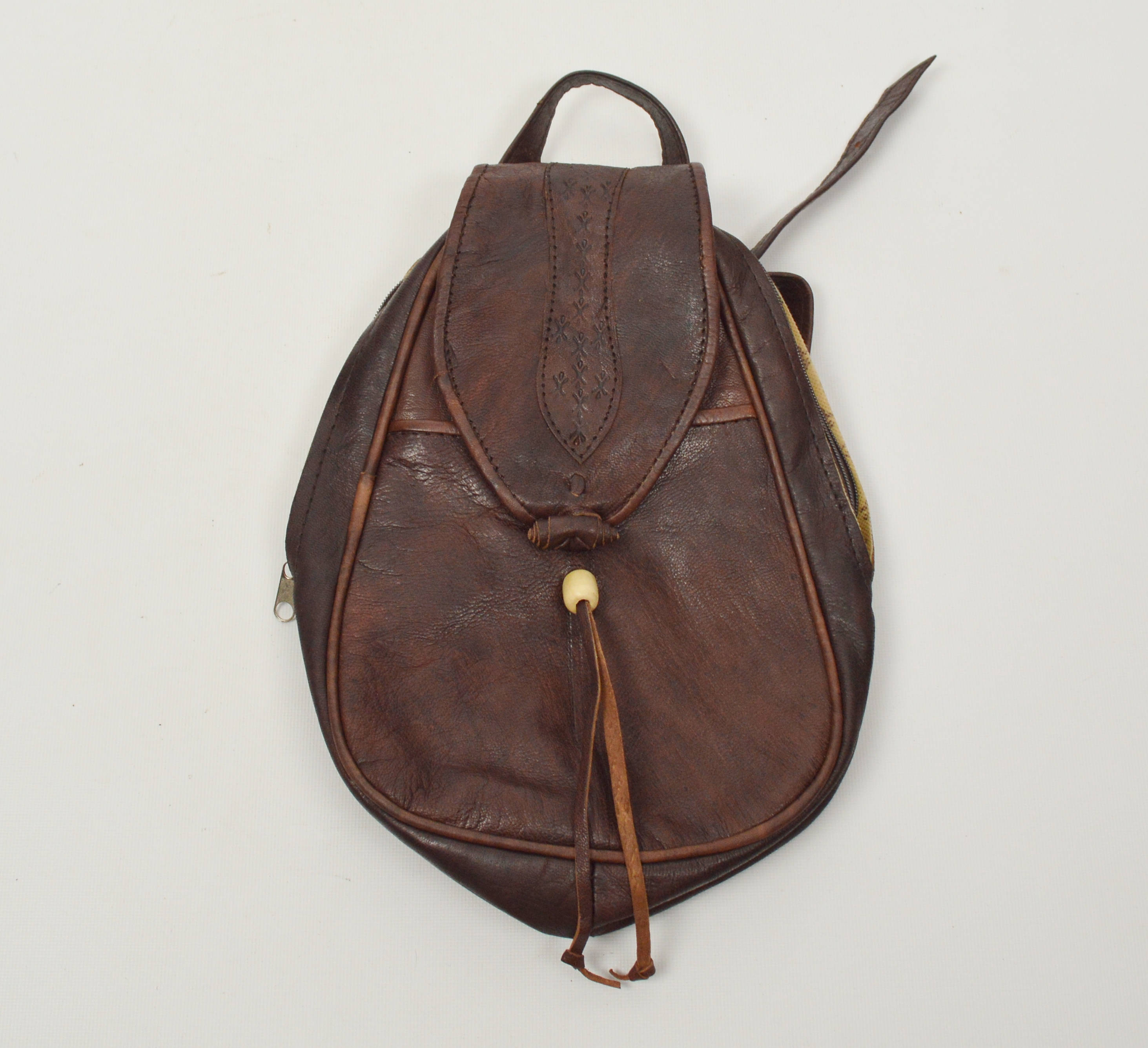 Hand tooled, genuine leather backpack. Adjustable straps. One large zippered compartment inside. One zipper pocket on the outside front and on the outside back. Loop and toggle button flap closure with pull string cinch on top