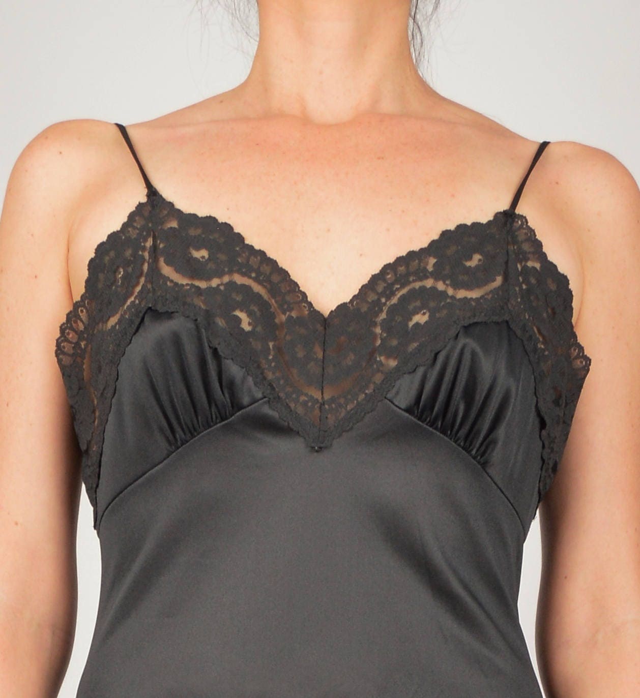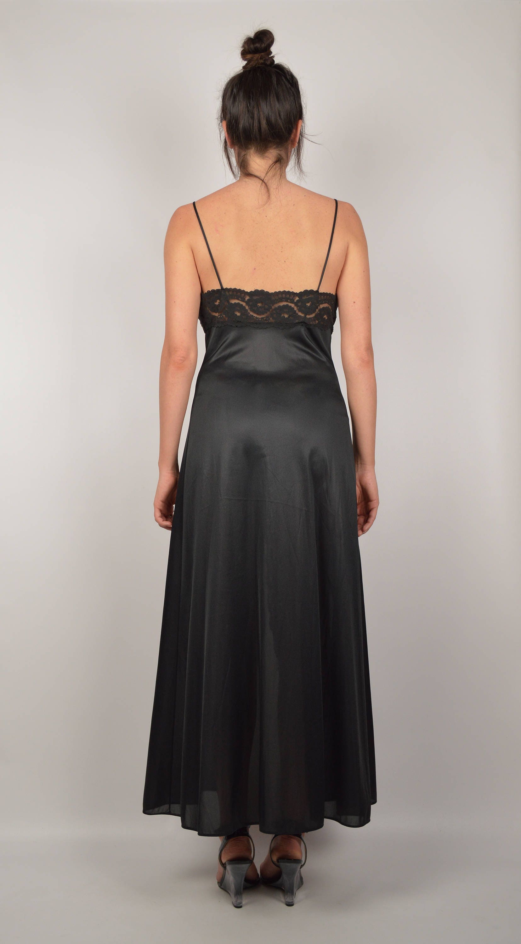 Vintage 70's black slip dress with beautiful lace detail and dangerously high slit in the middle. Shorts underneath recommended for wearing out