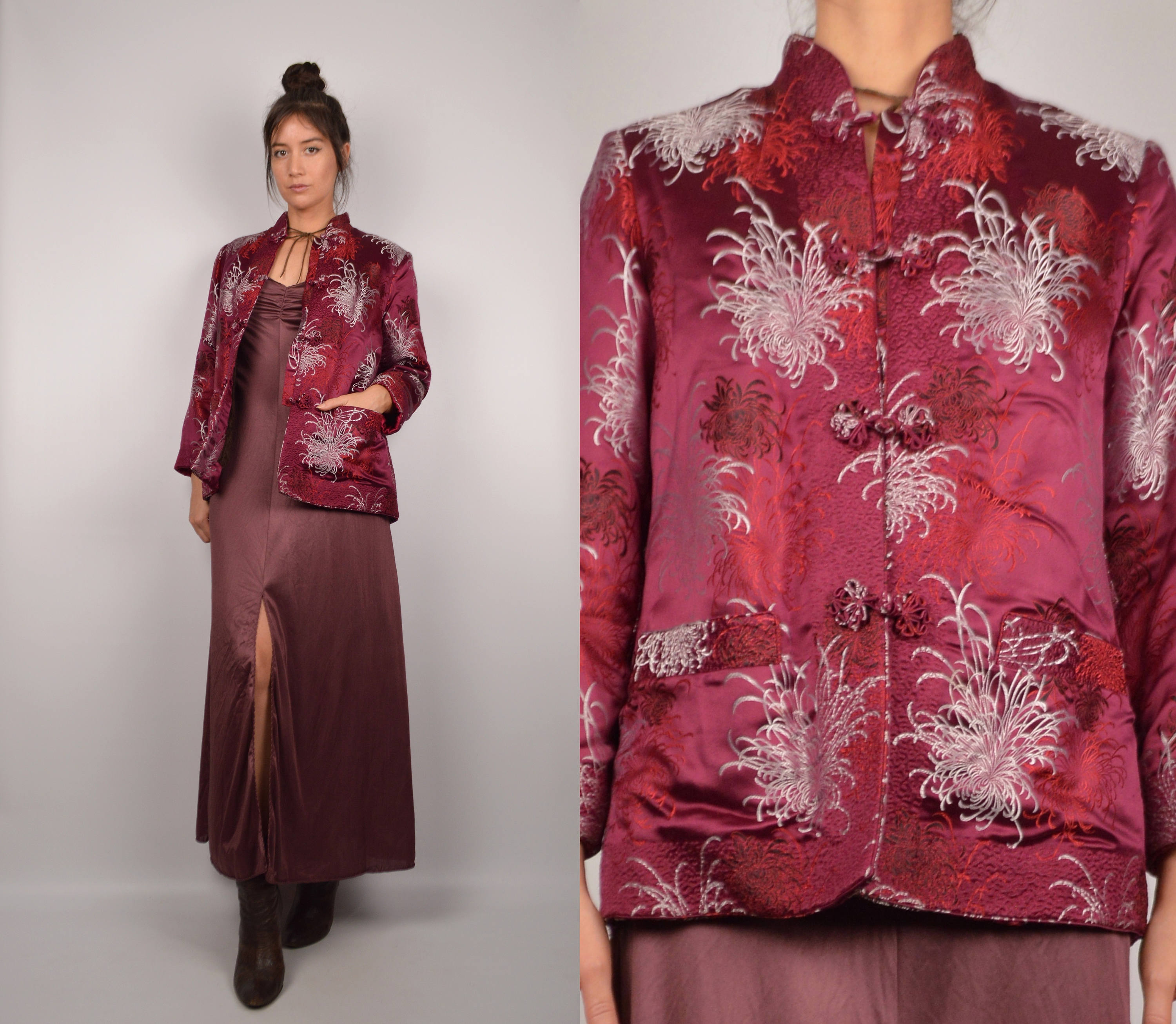 Vintage 70's jewel tone satin Asian jacket or Tang-Zhuang. Loop buttons, Mandarin collar, plus pockets. Beautifully embroidered floral motif. The body is lined with faux fur and sleeves are lined with silky soft poly-fil. This makes it much warmer than other jackets of this style. A true vintage gem