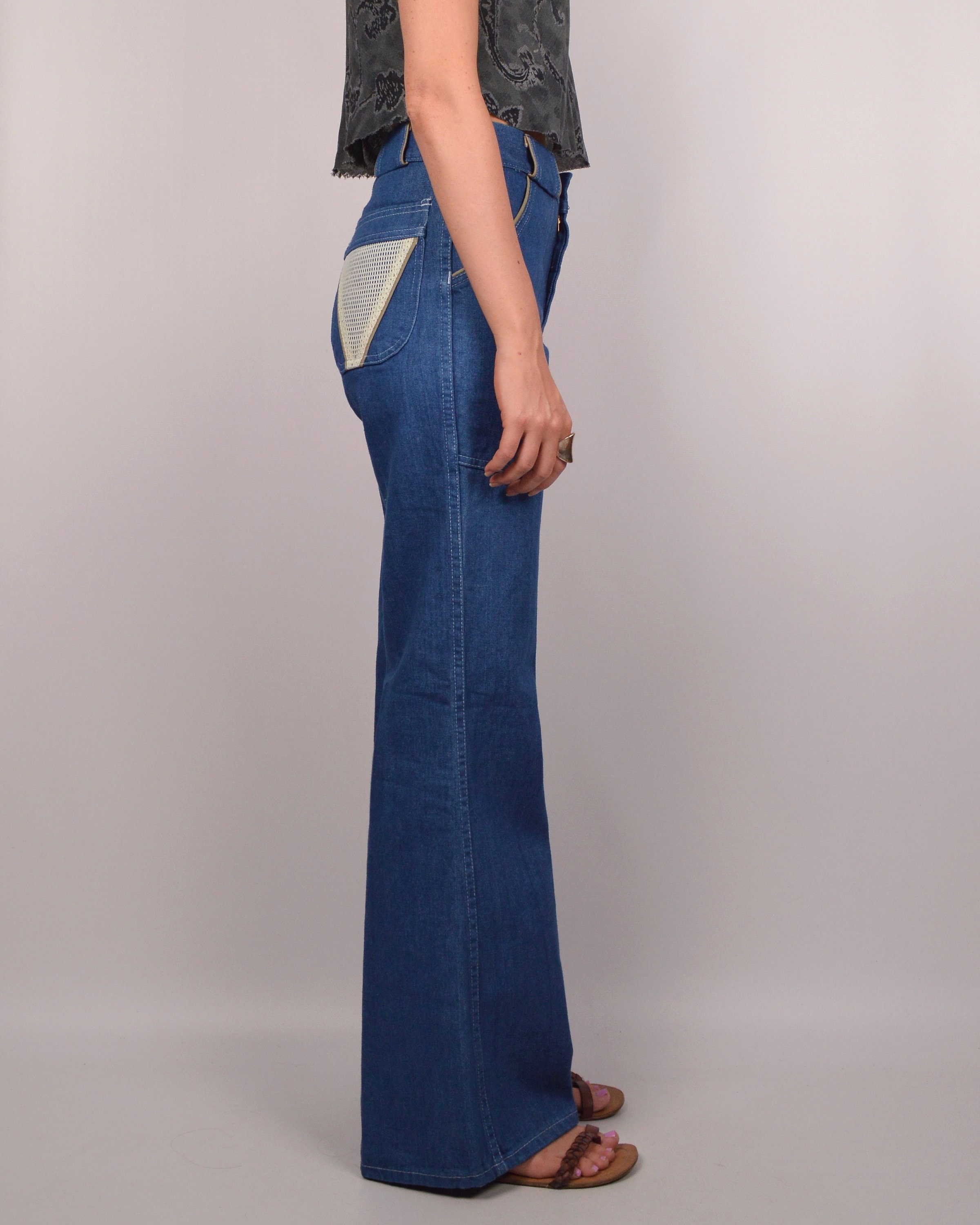 Vintage 70's denim flare leg jeans. Mesh triangles on back pockets. Perfect length for wearing with flats (model is 5'6"). Original tag still attached (unworn). Would look great belted to cinch the waist if needed