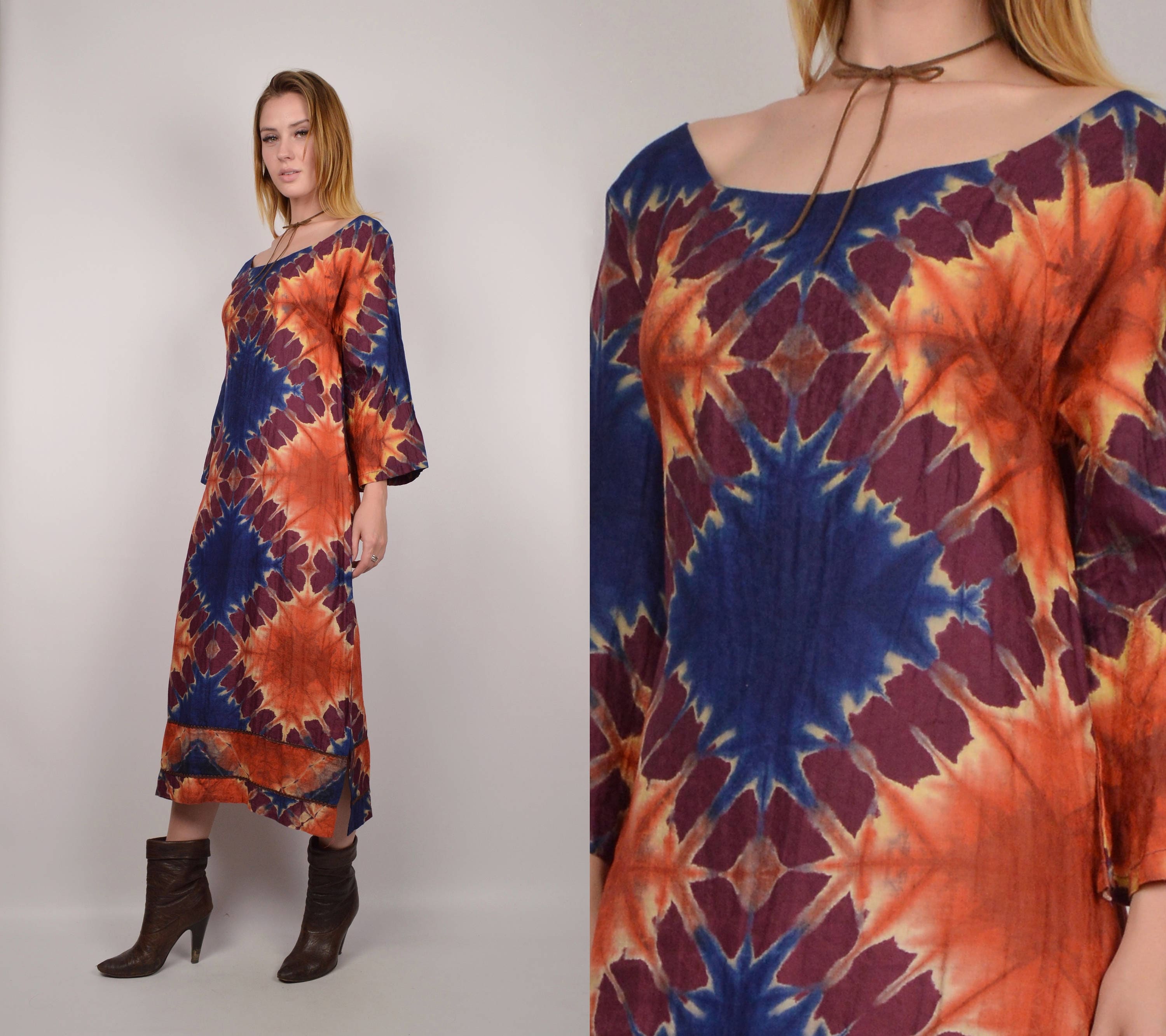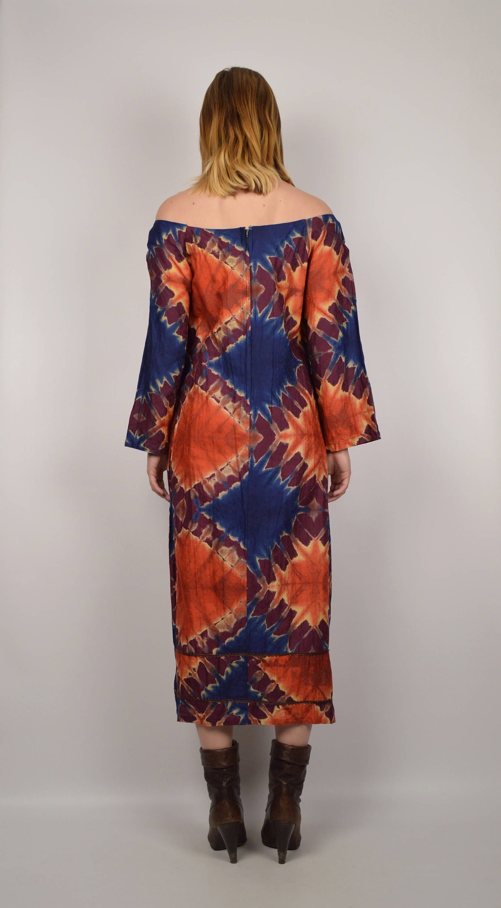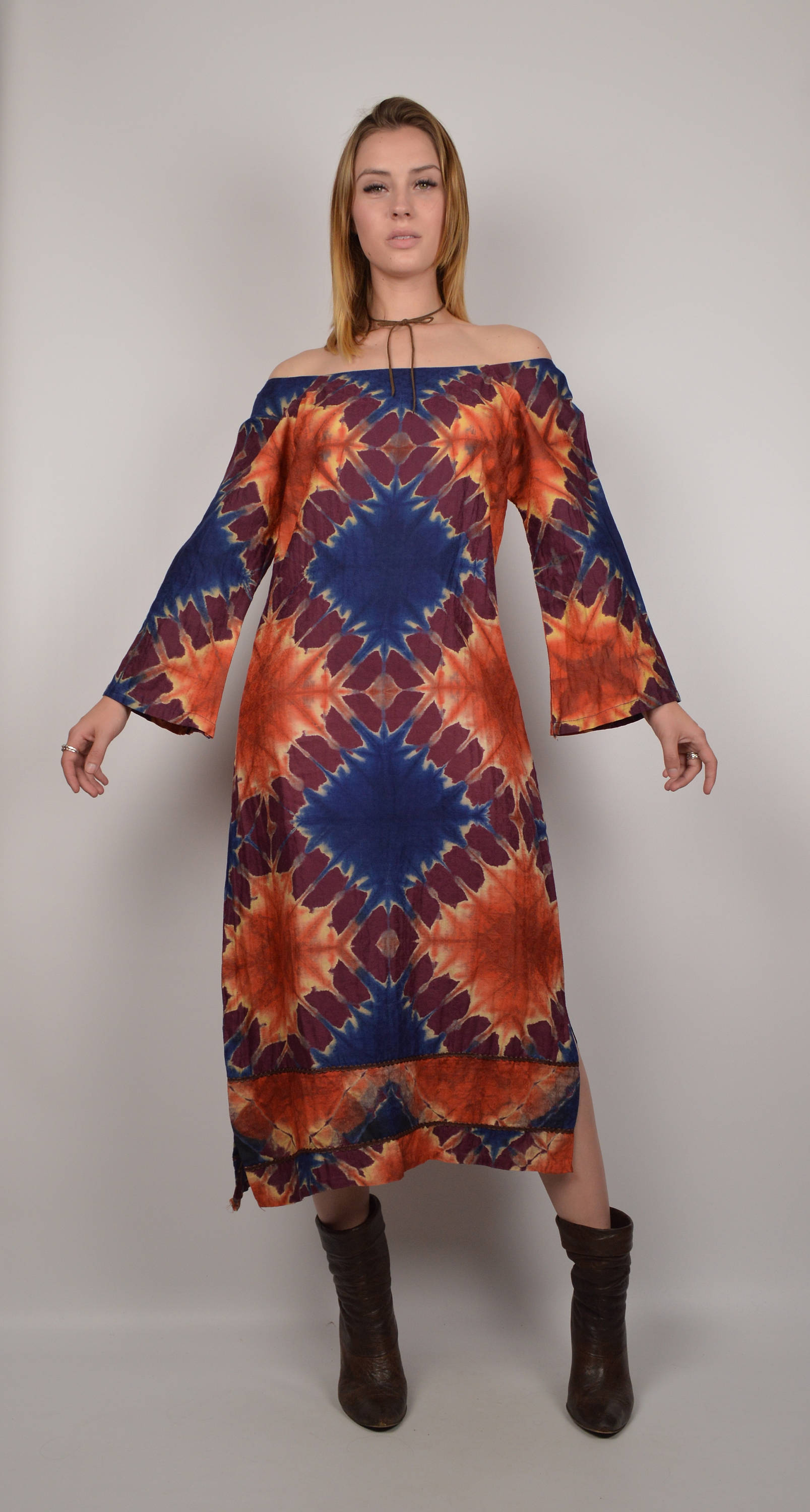 Gorgeous vintage 70's tie-dye midi dress. A-line cut with slight bell sleeve. The fabric is semi-thick. Caftan vibes. Although it is not cut to be an "off-the-shoulder" dress, it can be worn off-the-shoulder fairly easily because of the wide neckline. Zipper closure in back