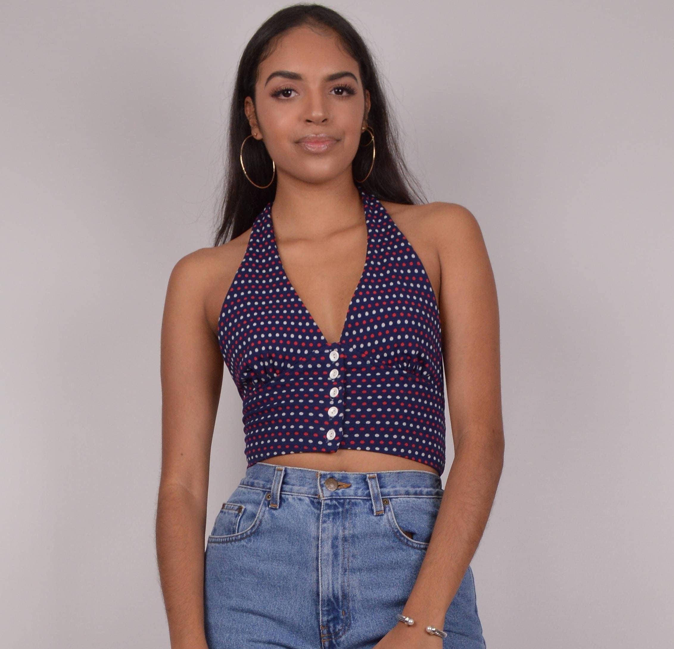 Vintage 1970's navy polka-dot halter top with deep v-neck and button front closure. Ties behind the neck. Stretch to the fabric. Fits like size xs-s. The 70's halter is an iconic piece needed in every vintage lovers closet