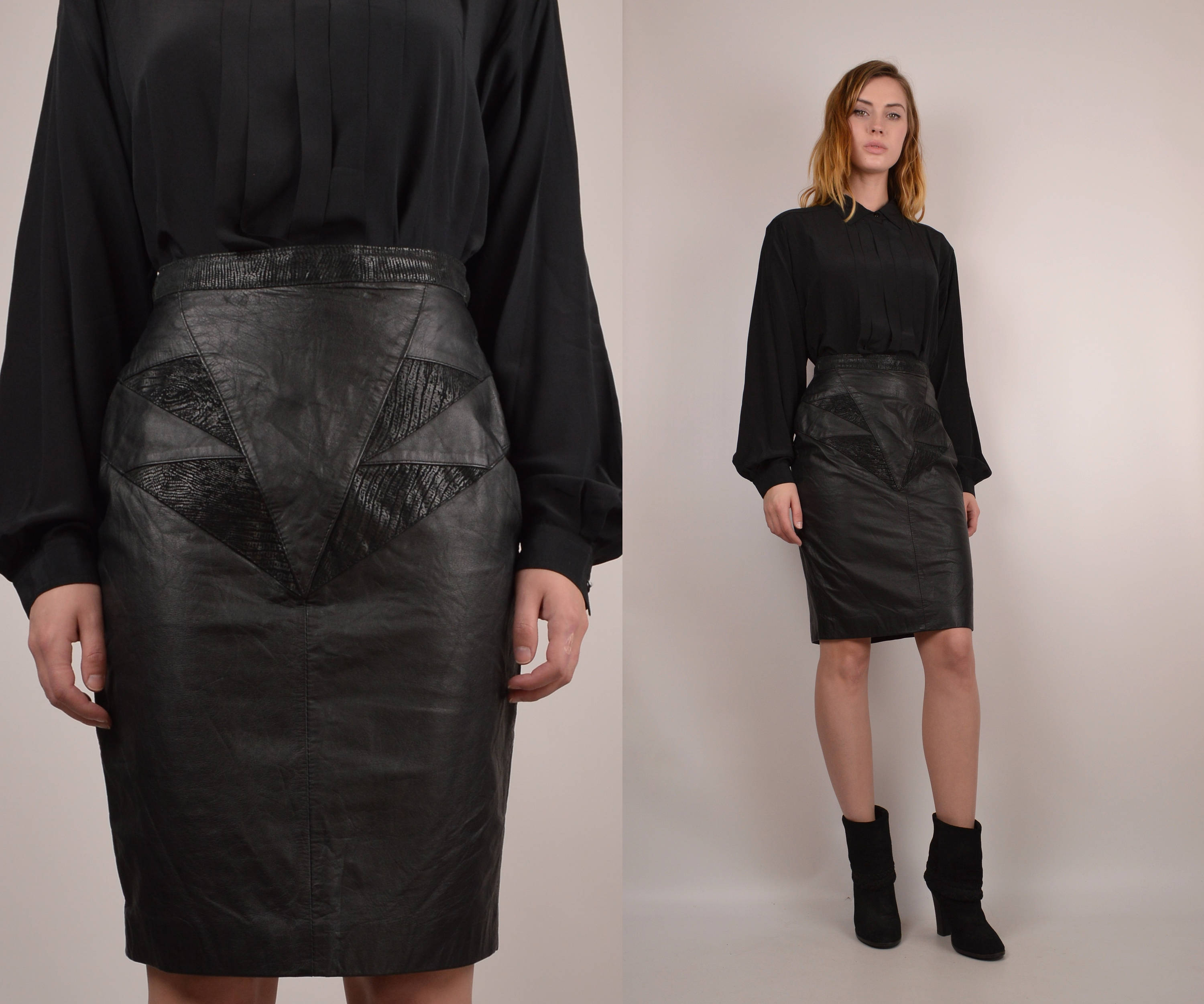 80's black leather and suede high waisted pencil skirt with geometric design and amazing fit! Has snap button and zipper closure in back and small walking slit. Fully lined