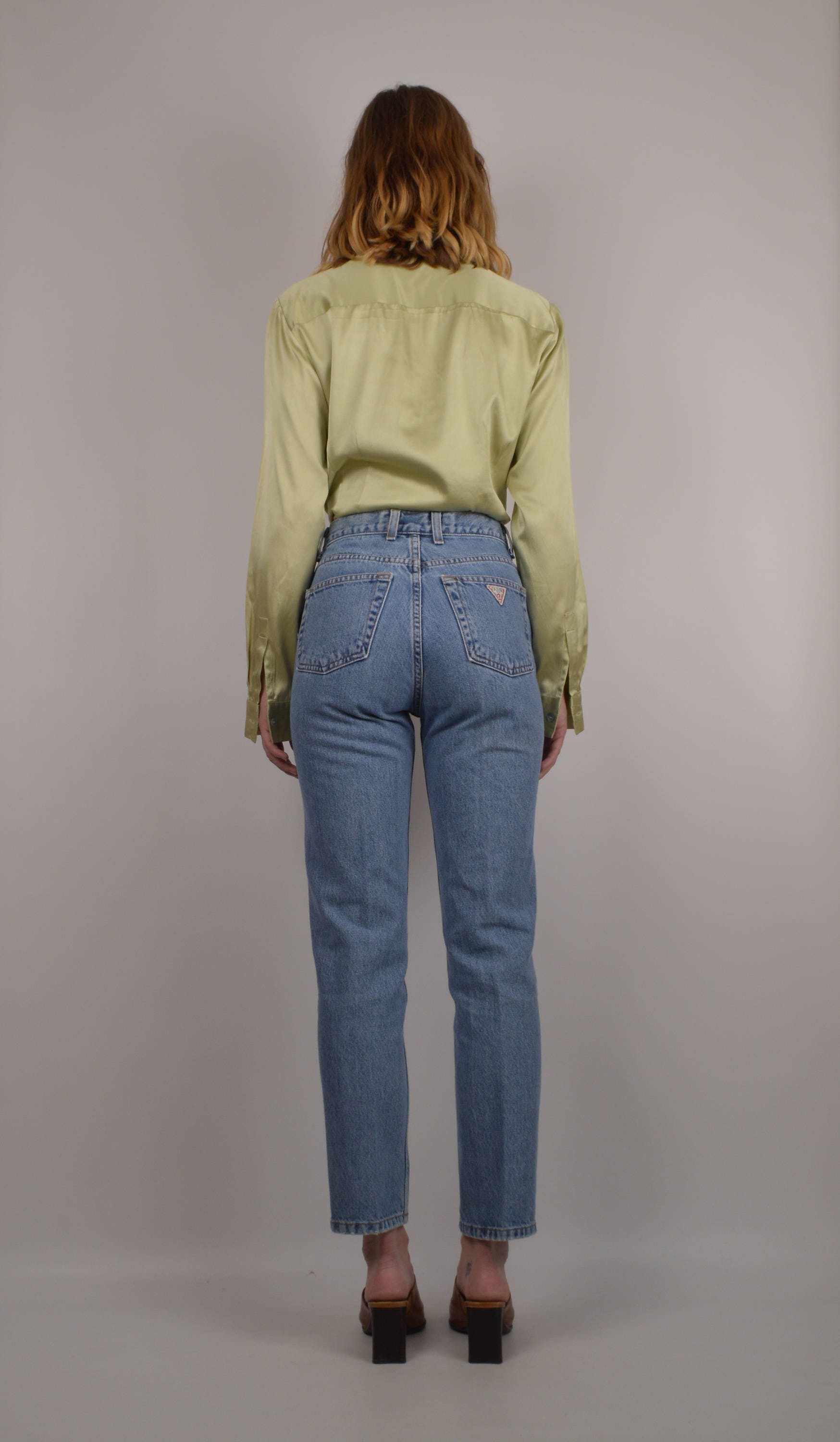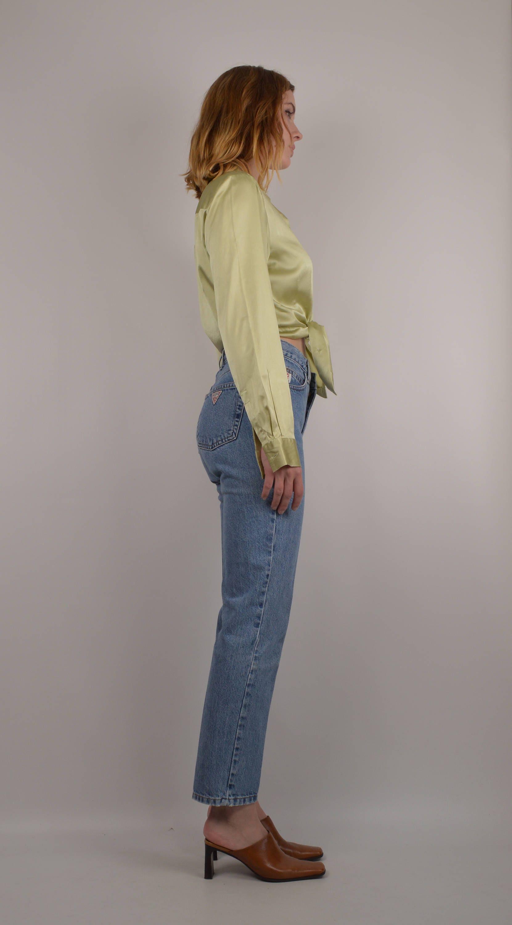 Beautiful vintage Henri Bendel, pale lime green silk button-up shirt. So soft and lightweight