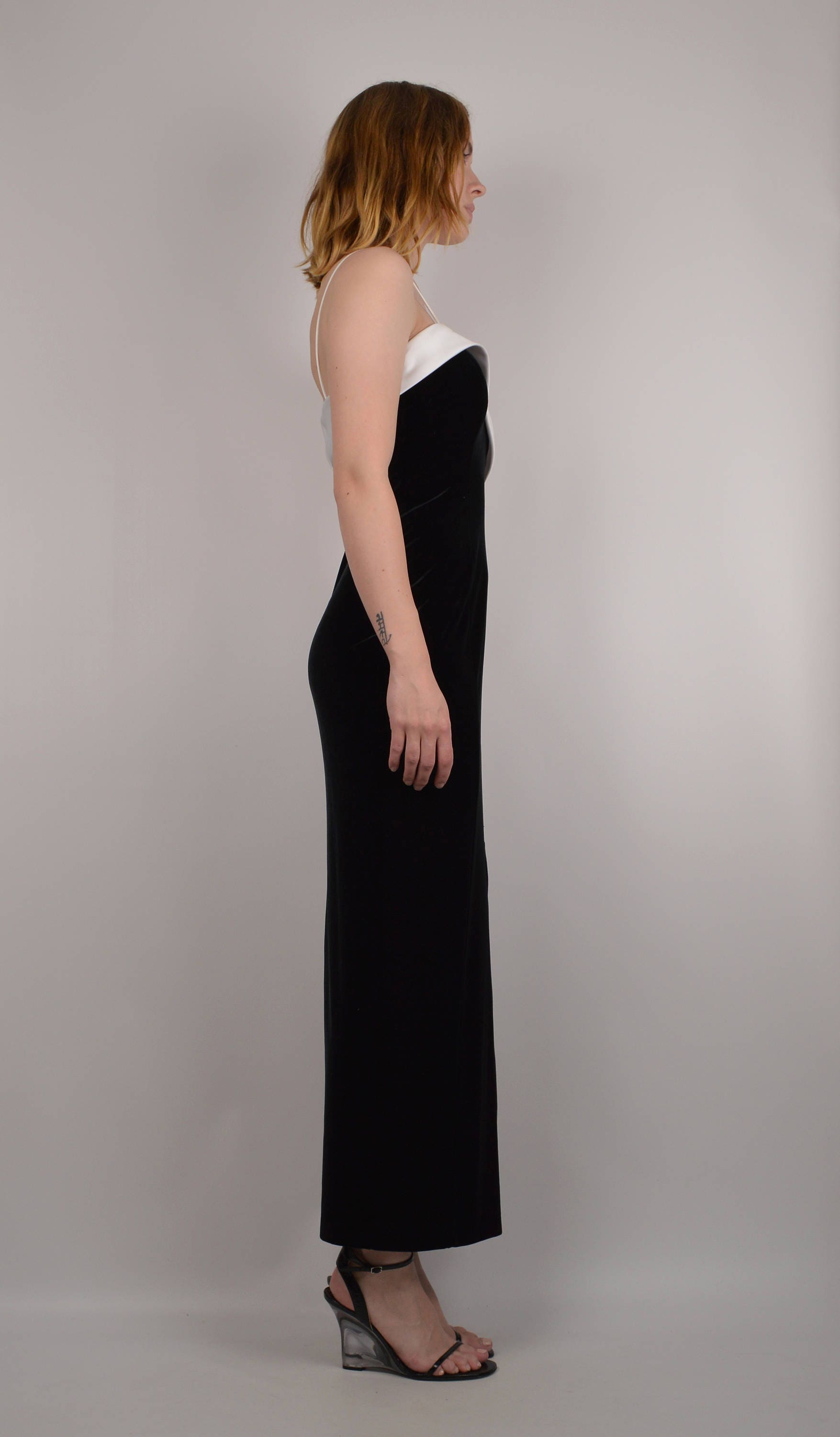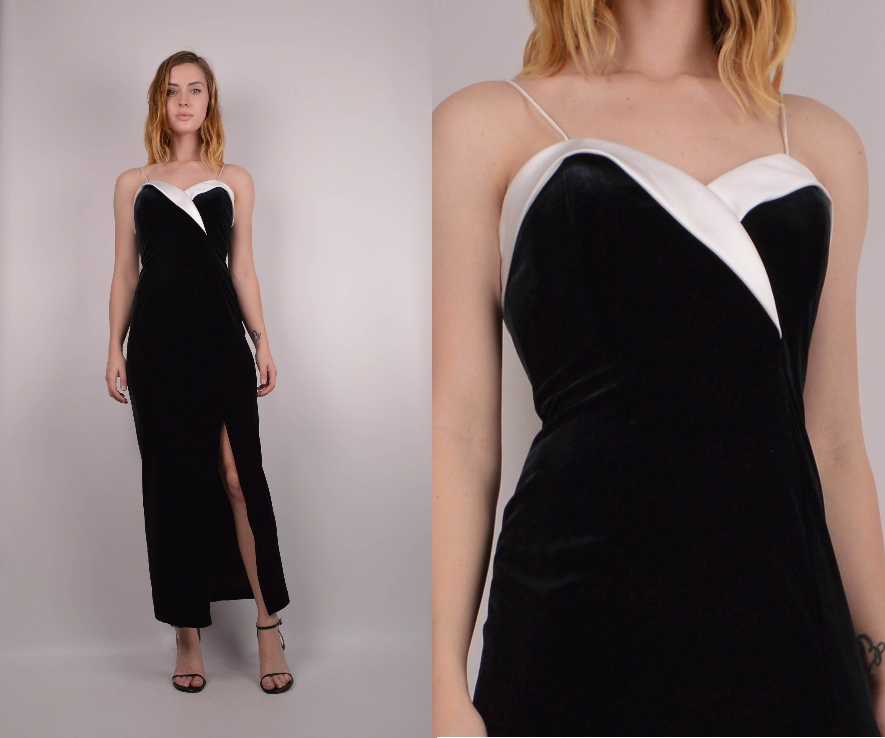 Vintage black velvet cocktail dress with white sculptural neckline. Bodycon fit, high leg slit, and zipper closure in back