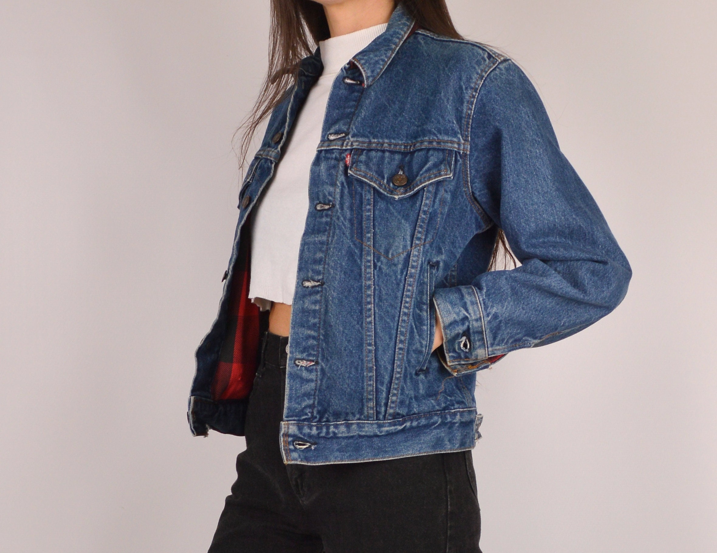Vintage Levi's button-up jean jacket with buffalo plaid flannel lining. Collar underside is also lined. Has chest and hand pockets. It's rare to find a small fit Levi's that still has hand pockets. Perfect for outfits that need a jacket that hits at the waist! Very flattering size does not overwhelm small frames
