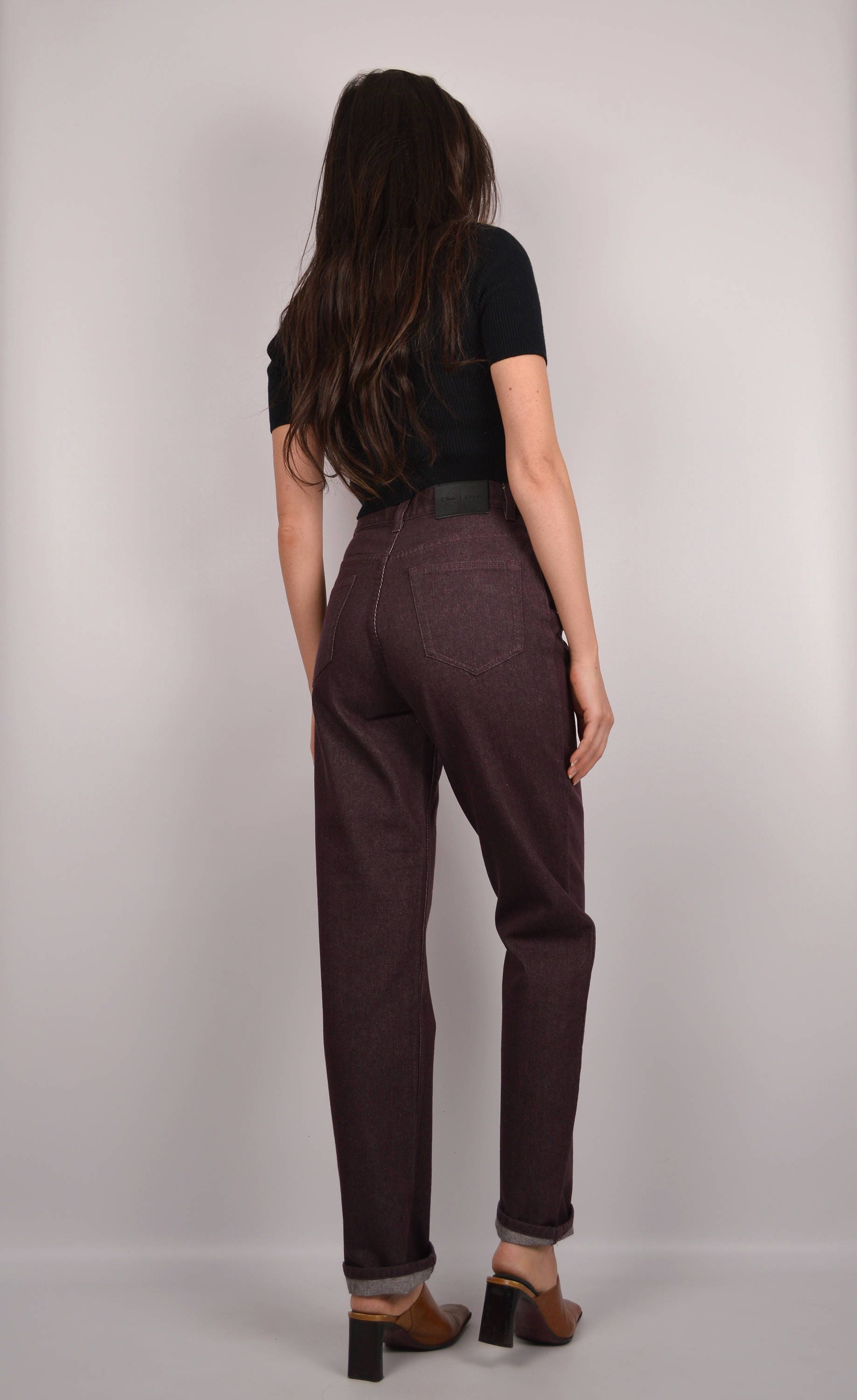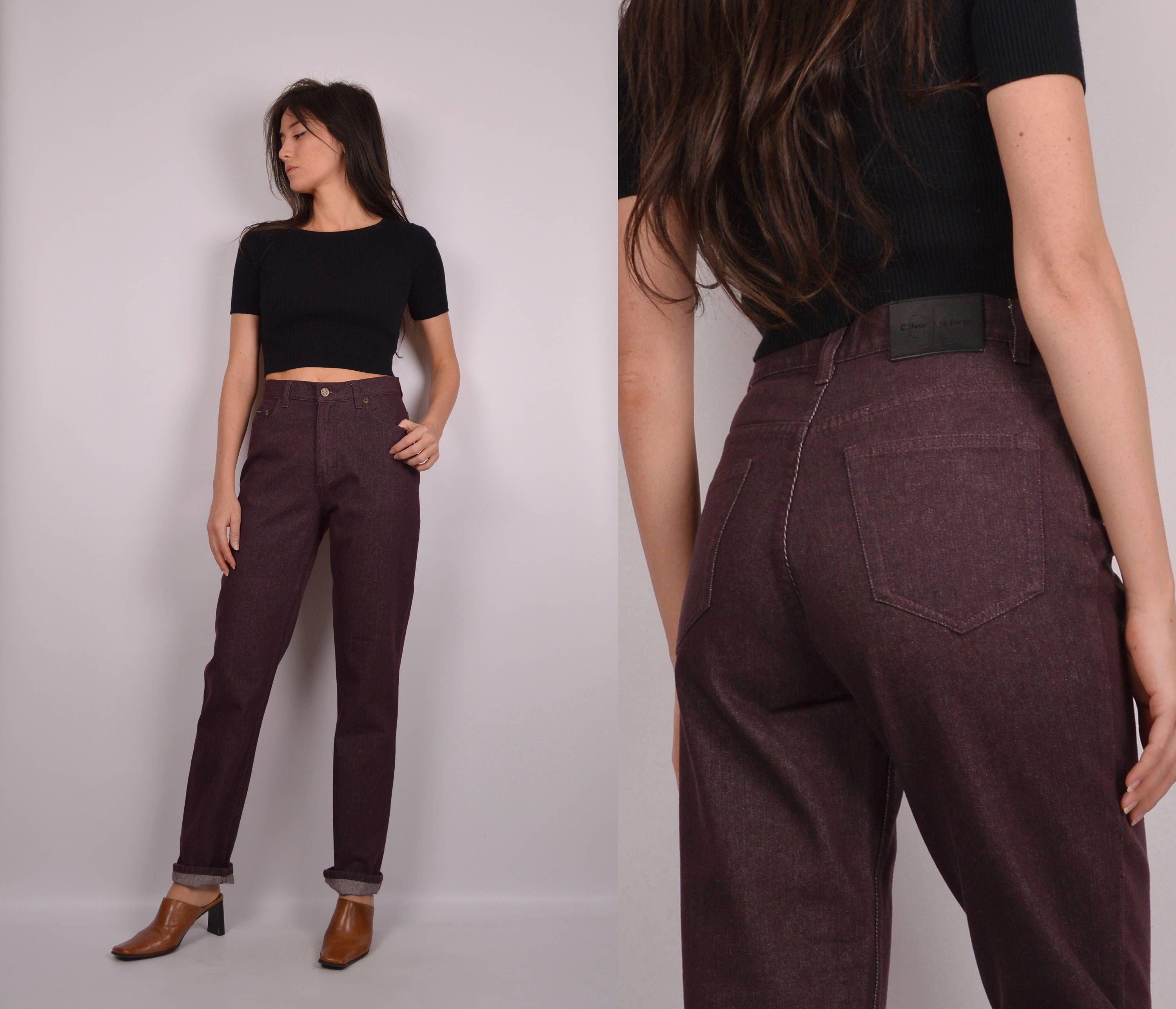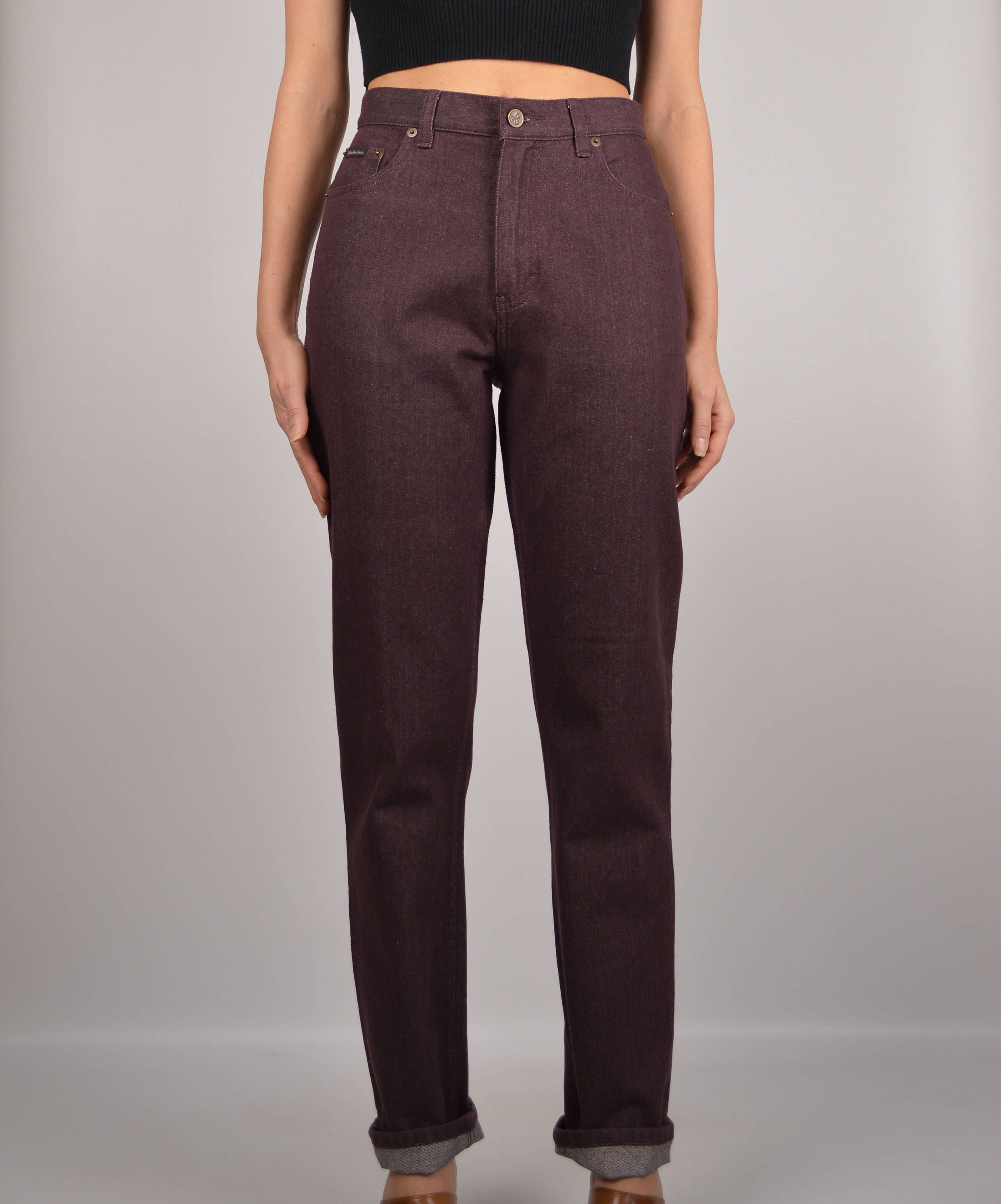 Vintage Calvin Klein jeans. Color is a gorgeous purplish/brownish tone. High waisted, relaxed fit, and slightly tapered leg. "CK" on button and all rivets, on leather patch on the back, and "Calvin Klein" on tag on front pocket. Super comfortable lightweight denim. Store tag still attached (unworn)