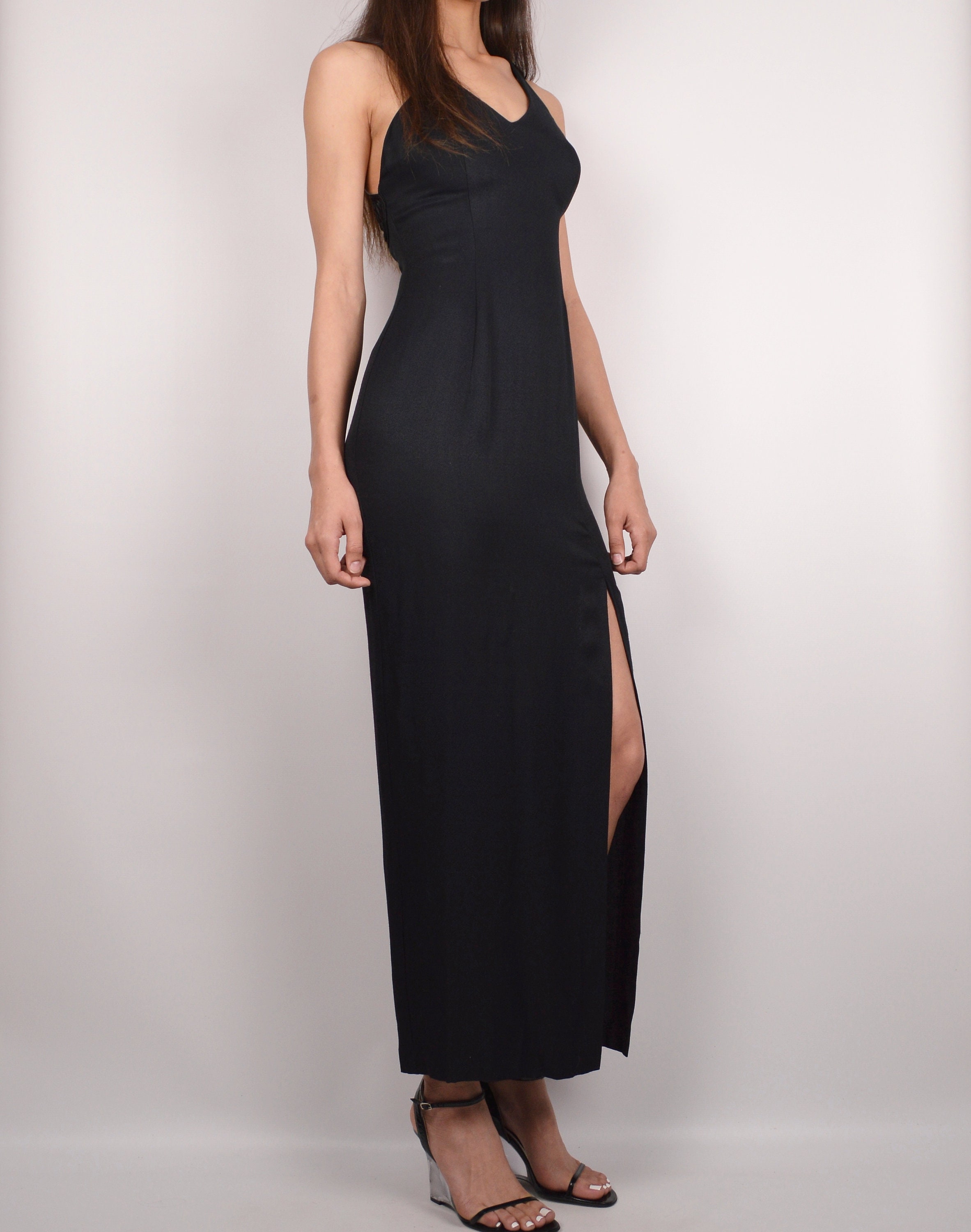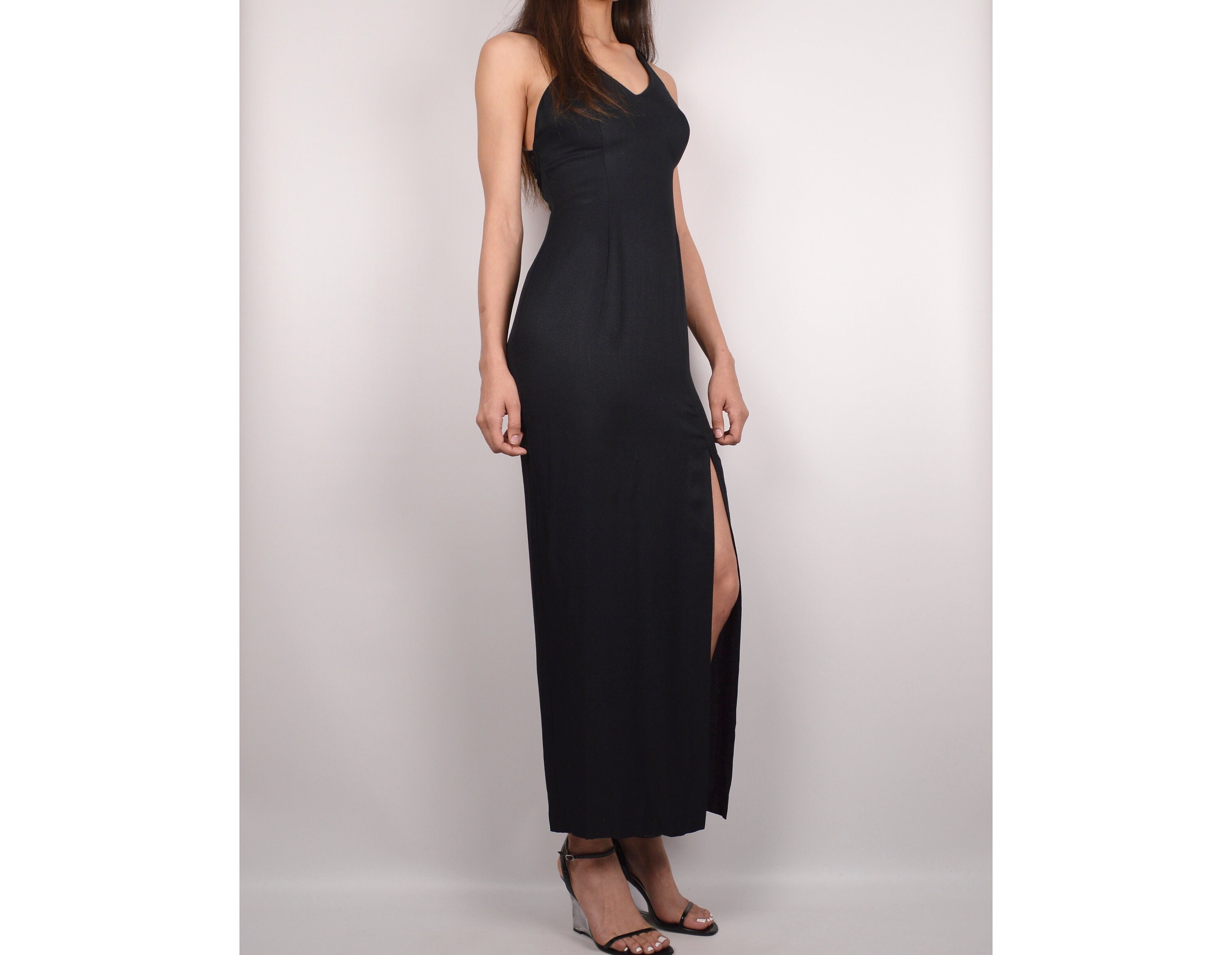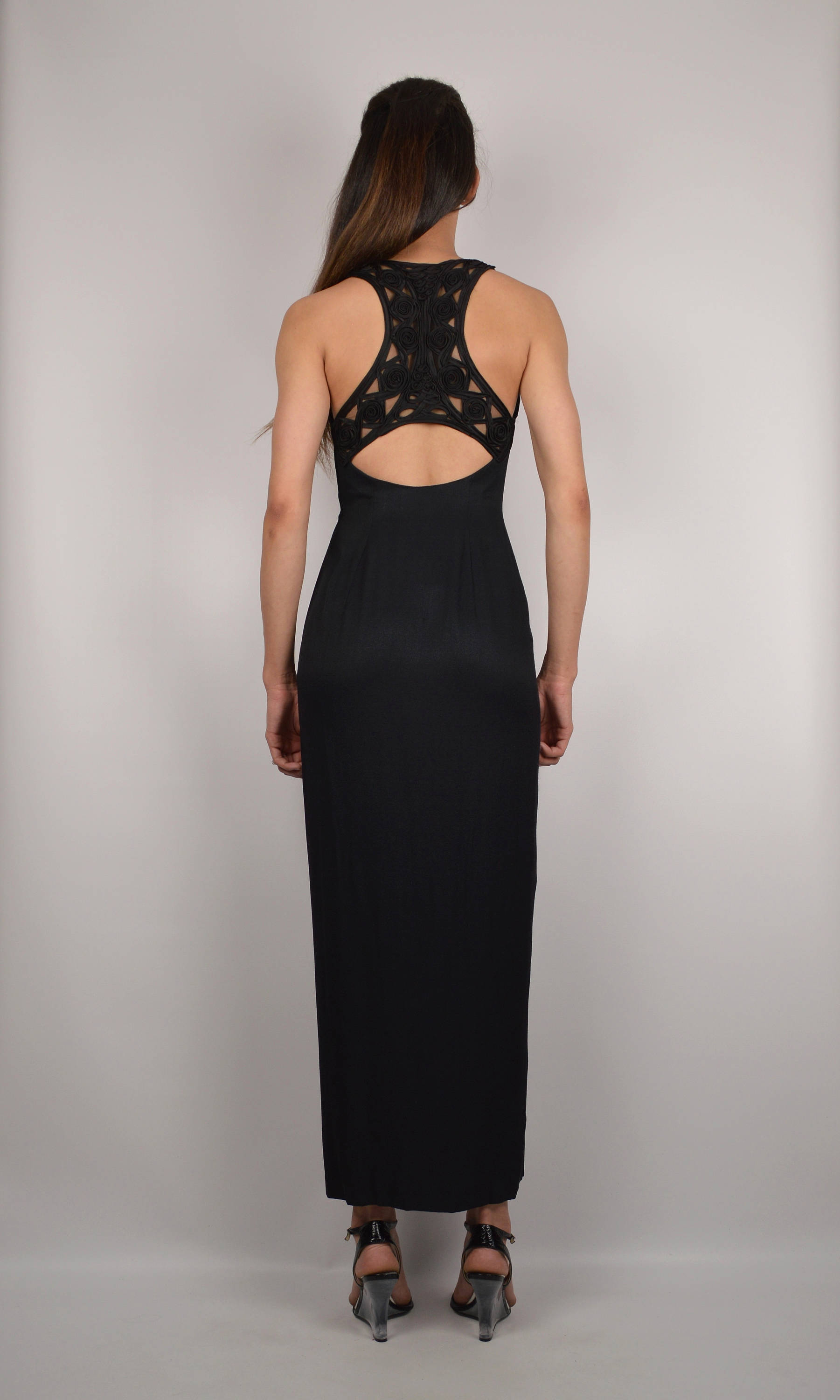 Stunning black cocktail dress with a slit over the leg and soutache detailed open back. Side zipper closure. Made in USA. Absolutely gorgeous!
