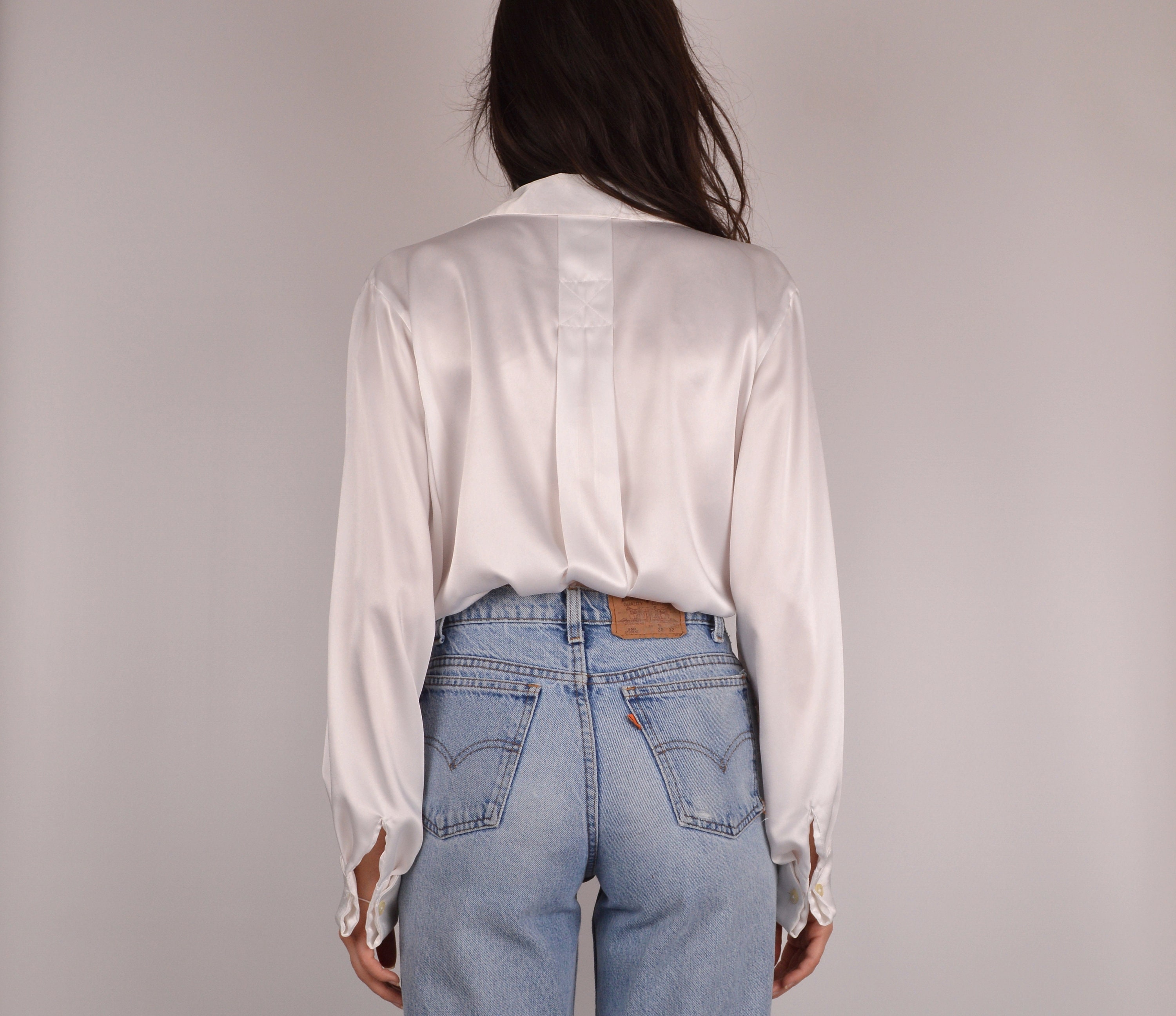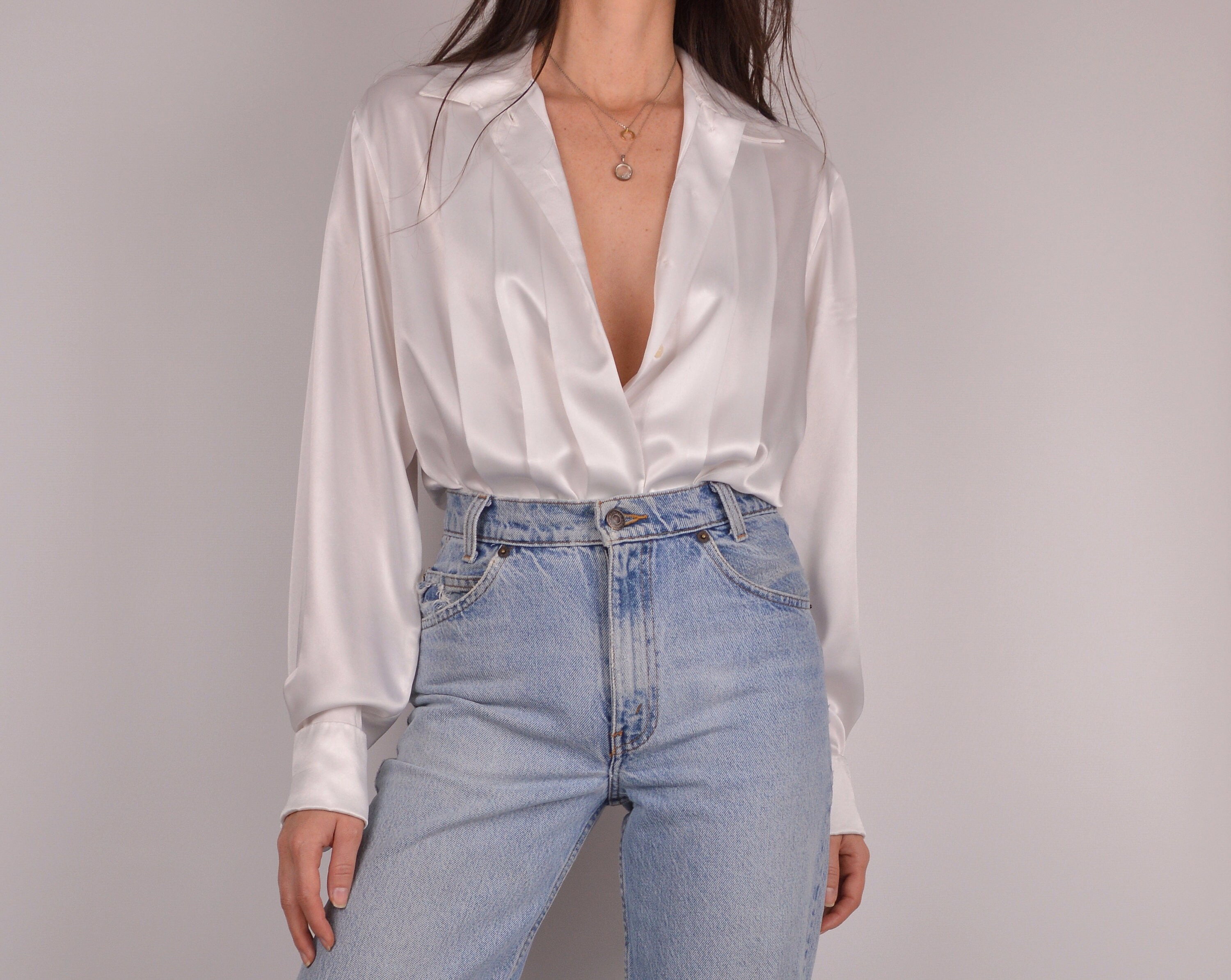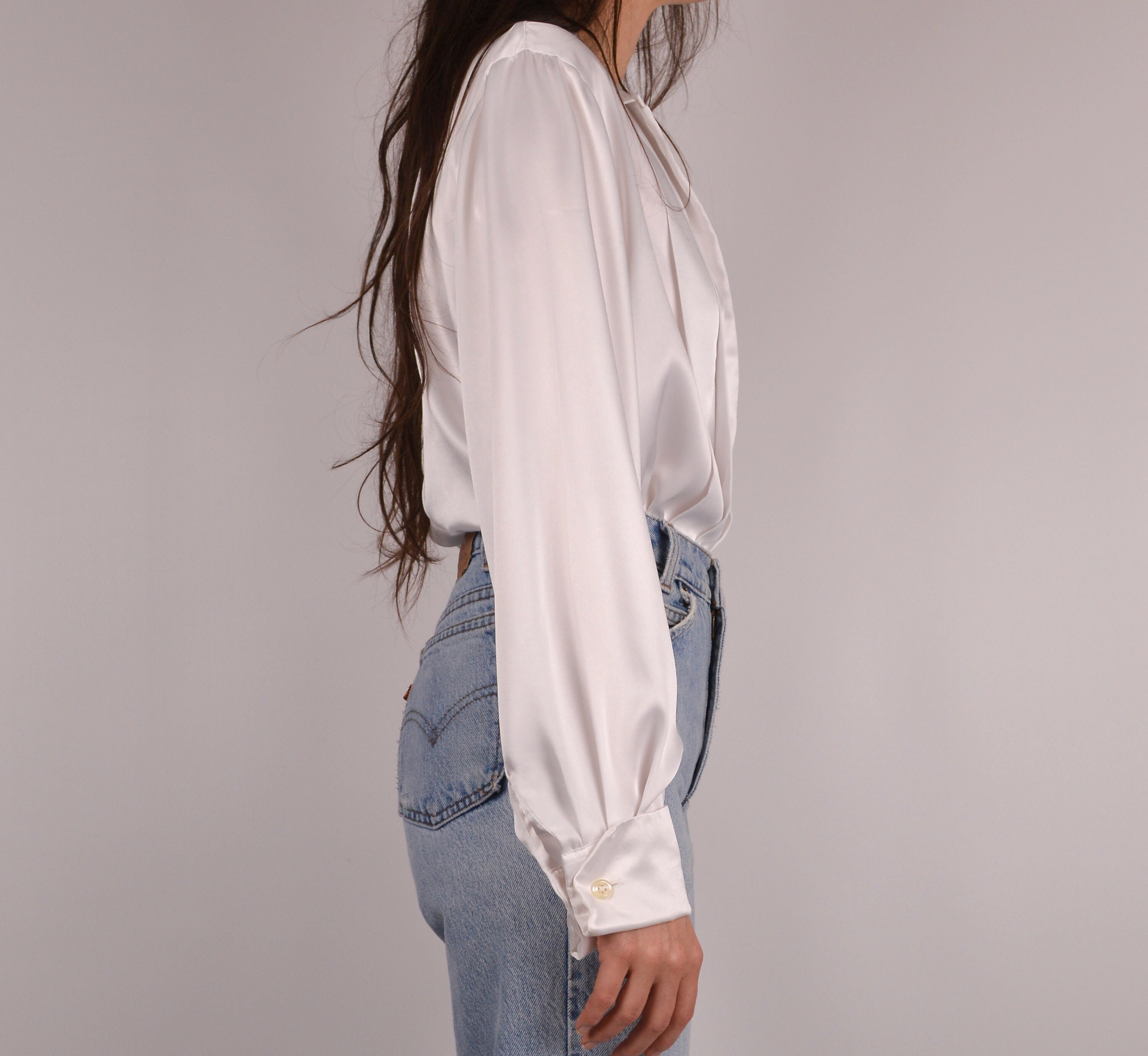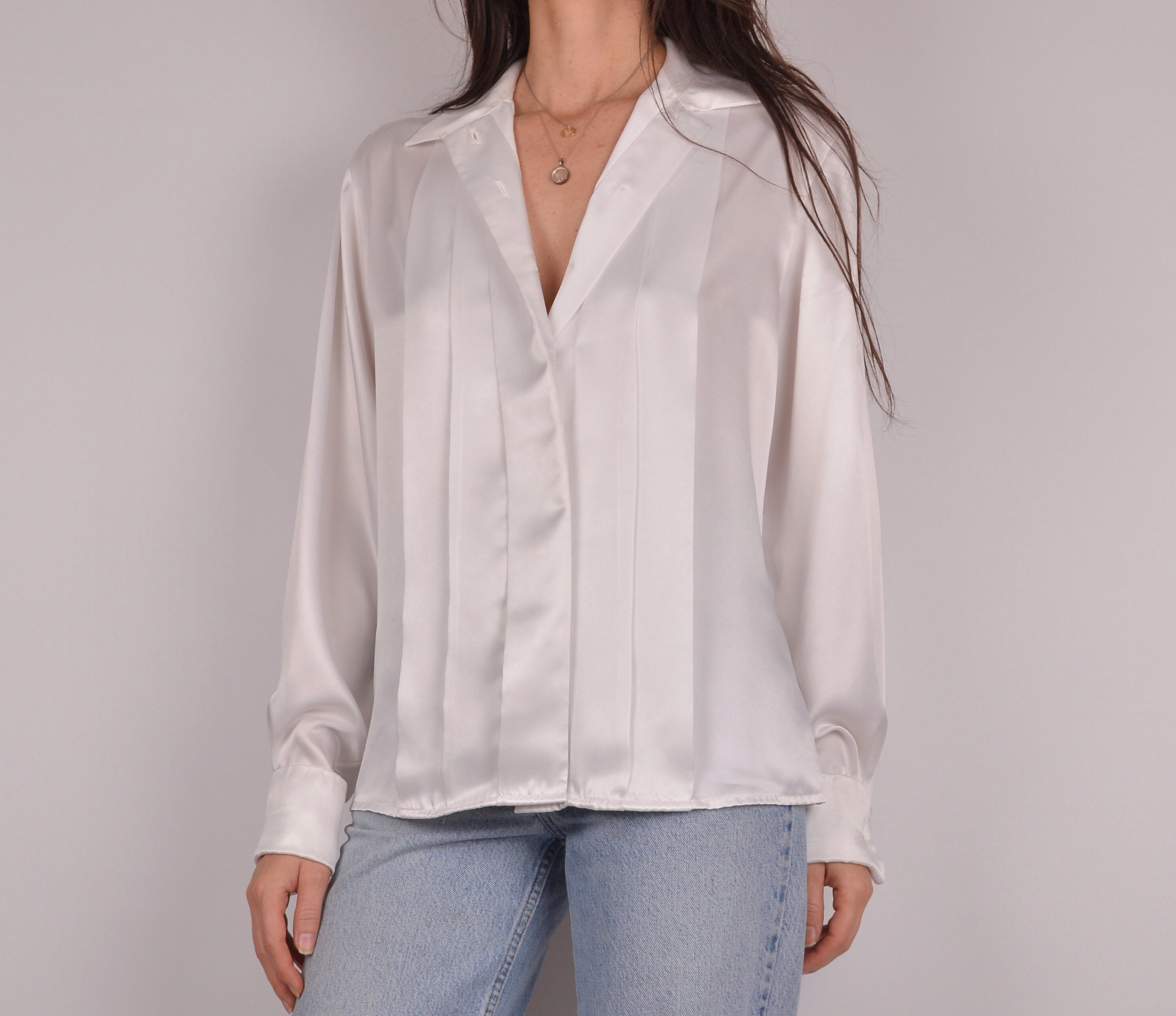 Vintage white button-up blouse. The fabric has a gorgeous satin-like sheen. The pleating detail on the front is so lovely