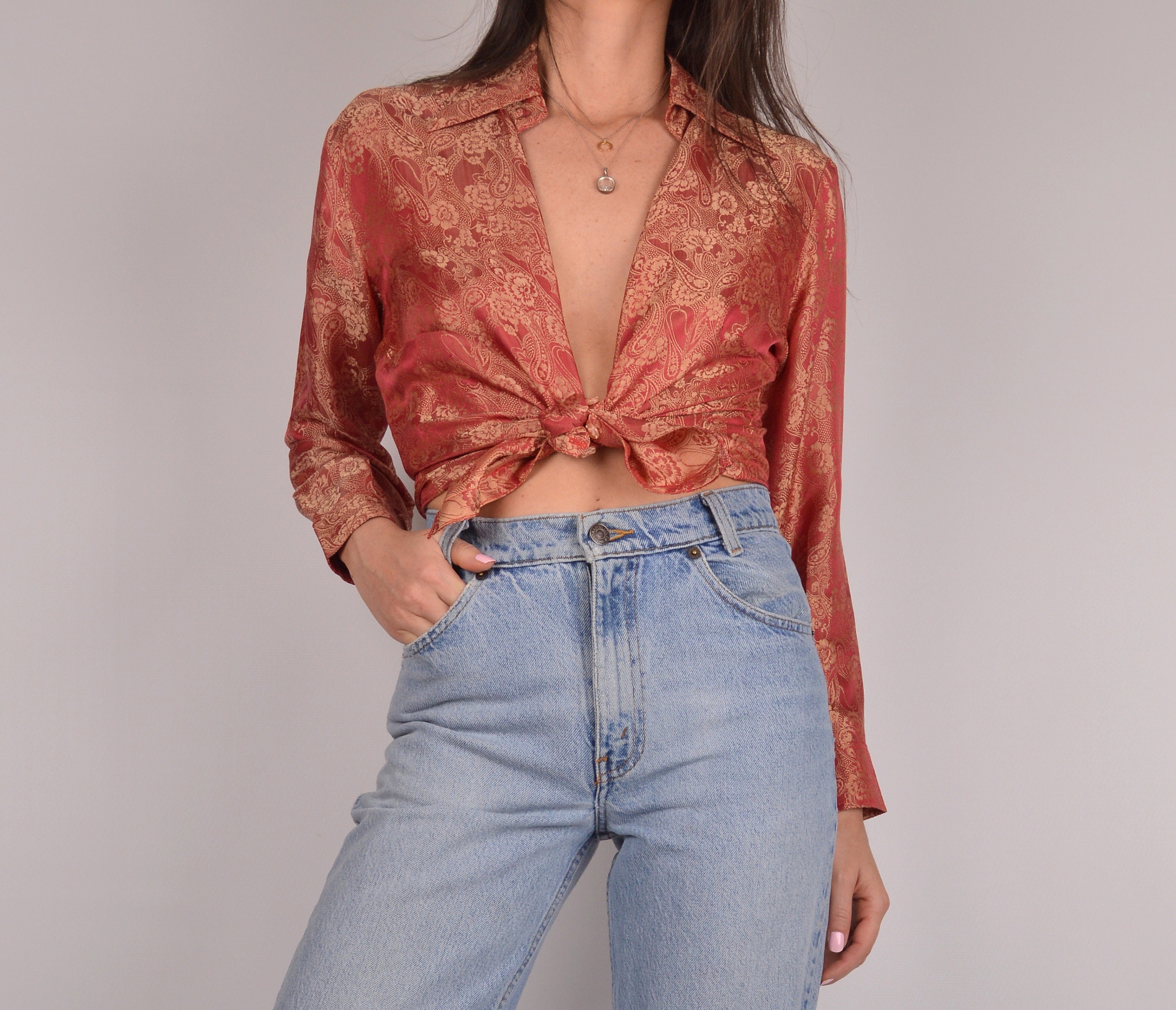 Gorgeous vintage red embossed silk button up shirt with brocade pattern