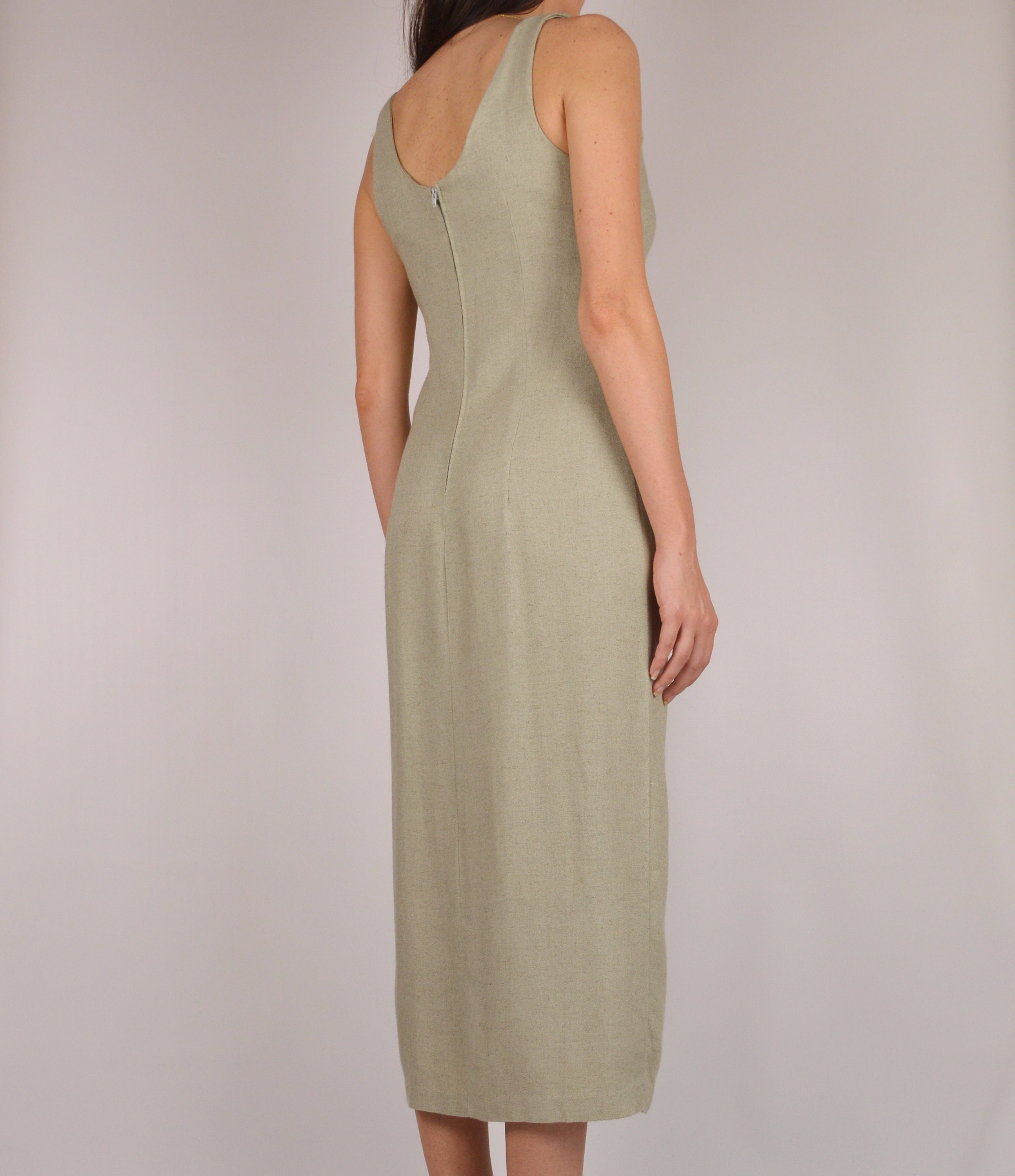 Vintage midi dress in a light sage hue. Has button detail down the front and a slit over the leg. Zipper closure in back