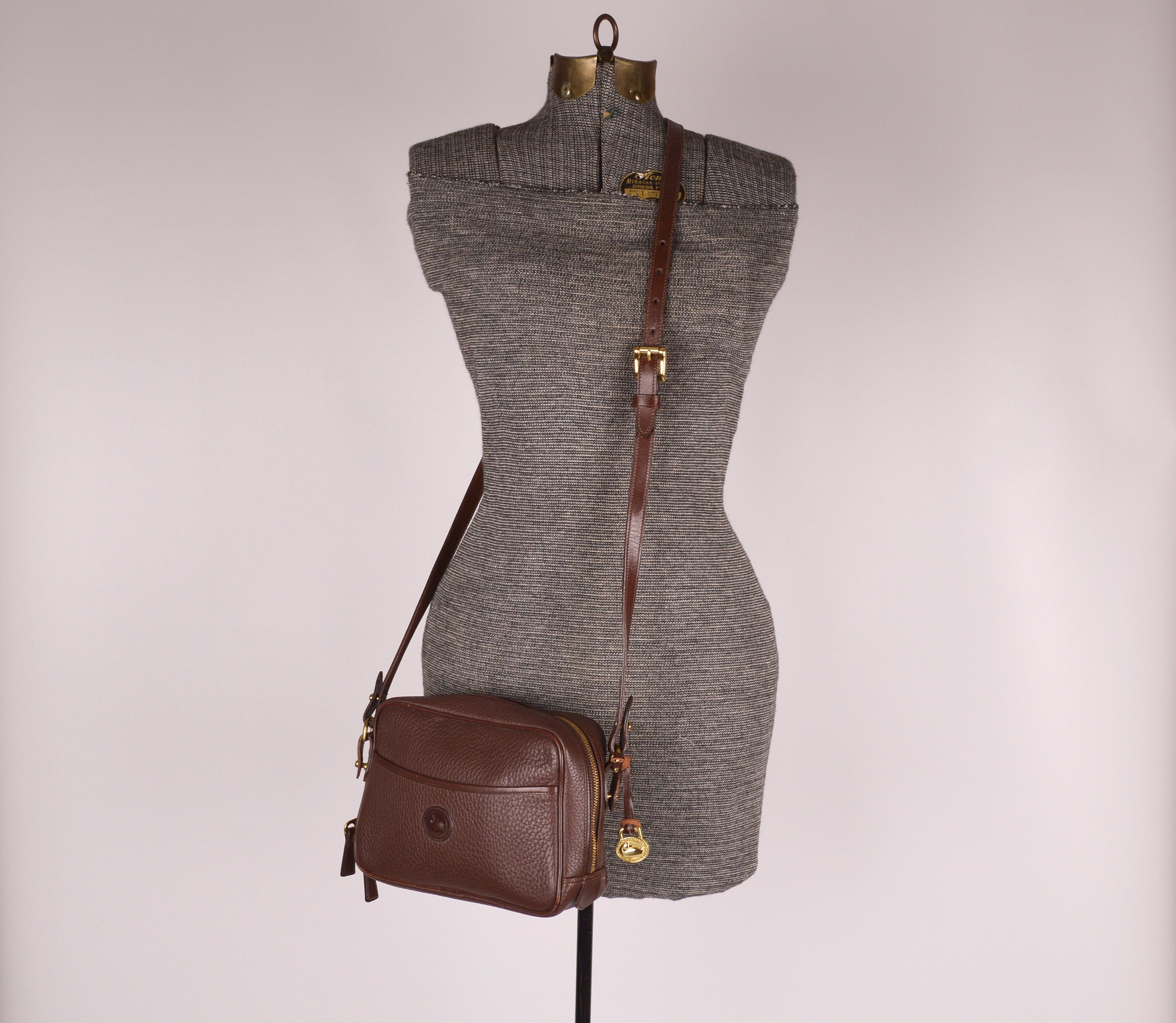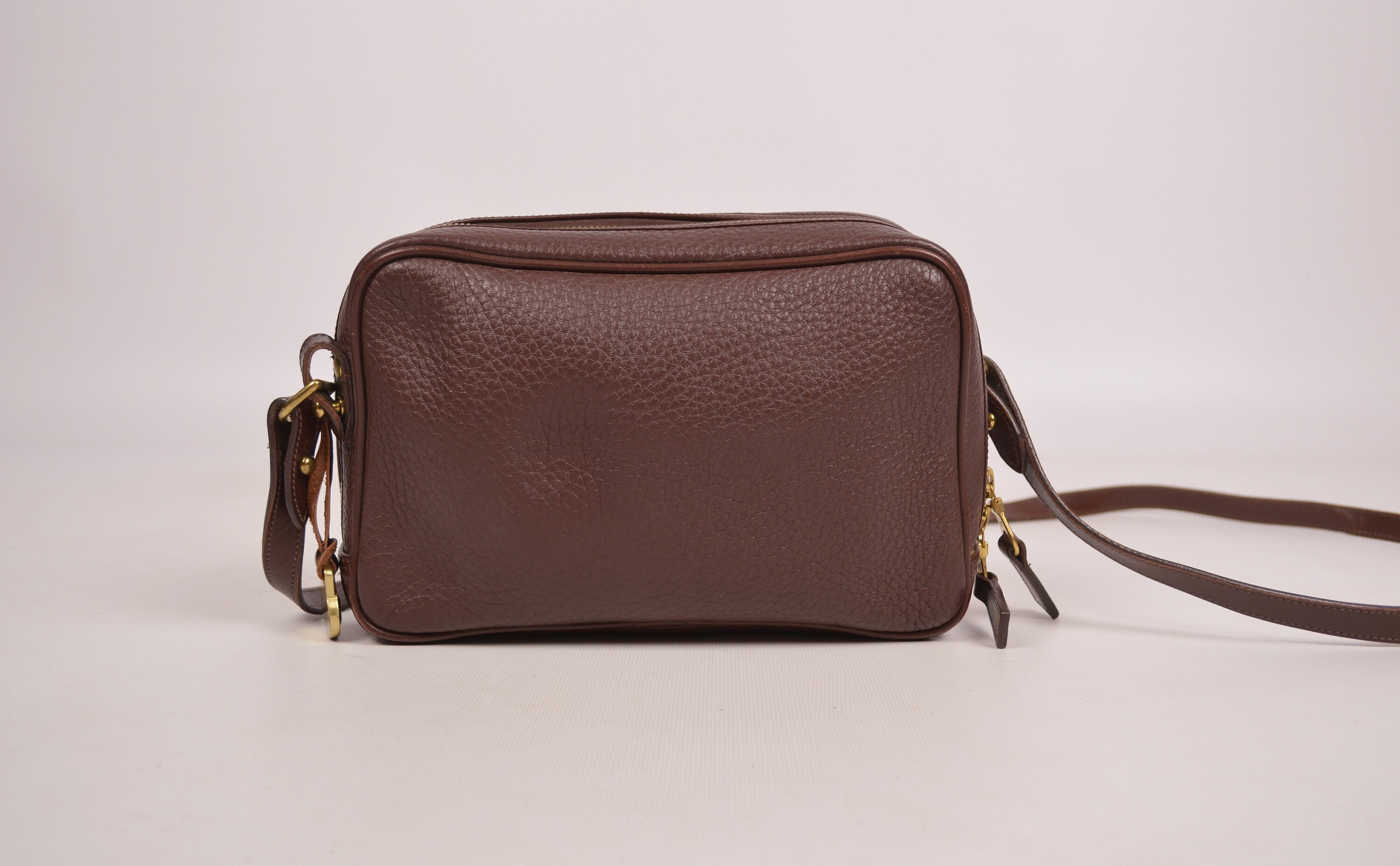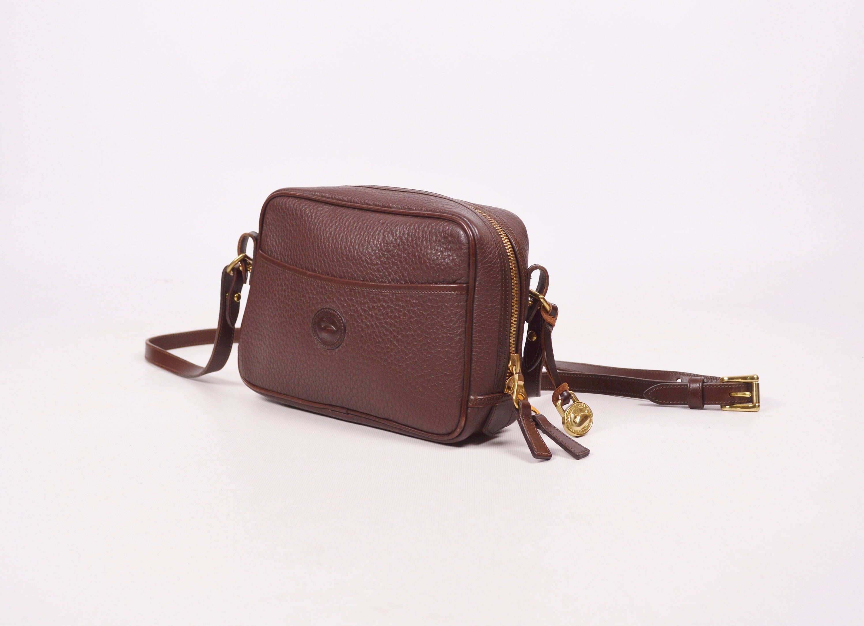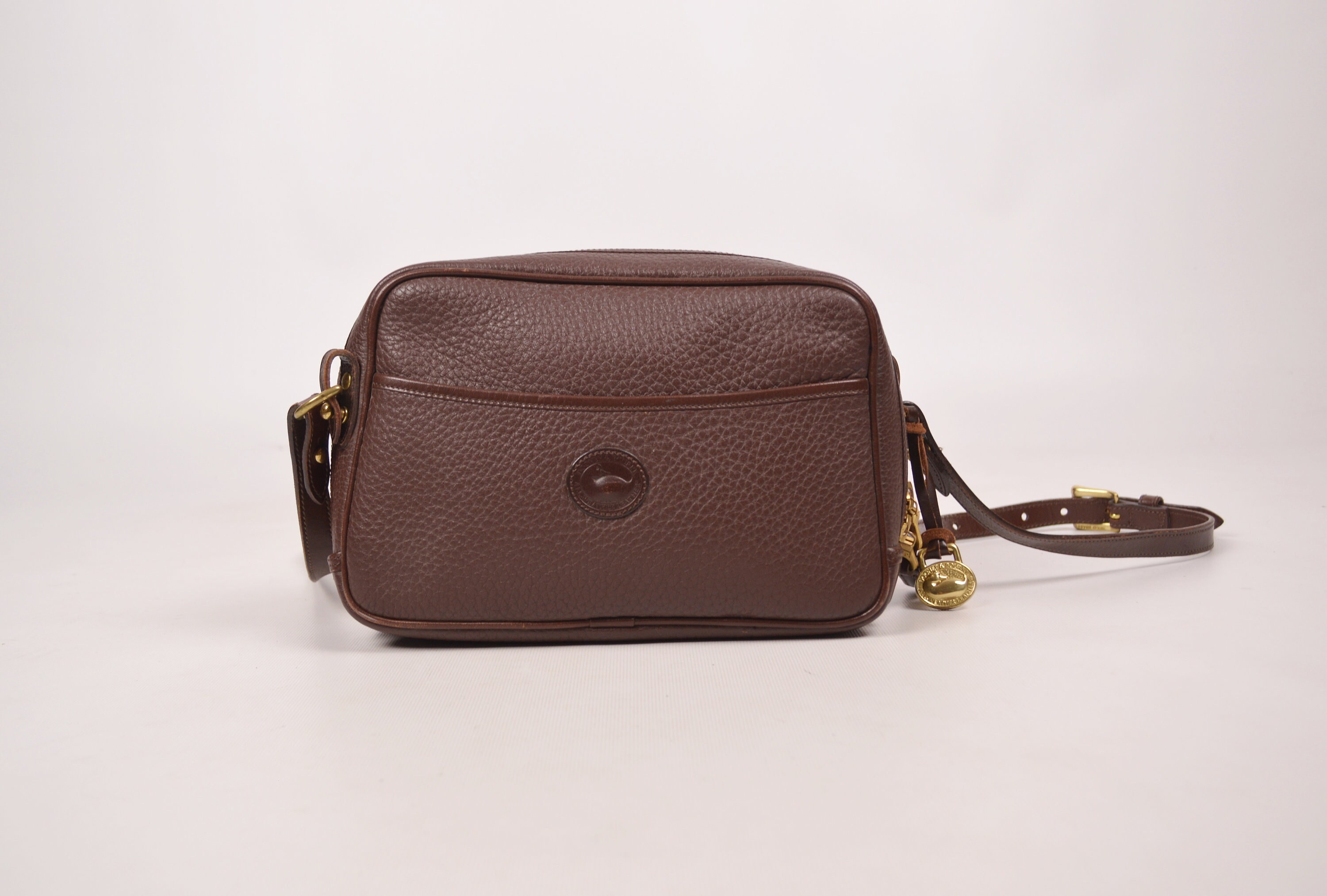 Rare, authentic, vintage Dooney & Bourke, pebbled, All Weather Leather, zipper bag in chocolate brown. Has a slip pocket on the front outside. Large open compartment inside with one small zipper pocket, snap pocket, and slip pocket. Has the red, white, and blue "Made in U.S.A." tag inside with a serial number on the back of the tag. Solid brass hardware. Stamped on leather: "Dooney & Bourke All-Weather Leather". Clean inside and out. Has the hanging brass duck tag. Crossbody / shoulder strap is adjustable and removable. Gorgeous bag! Excellent quality. Perfect for everyday use