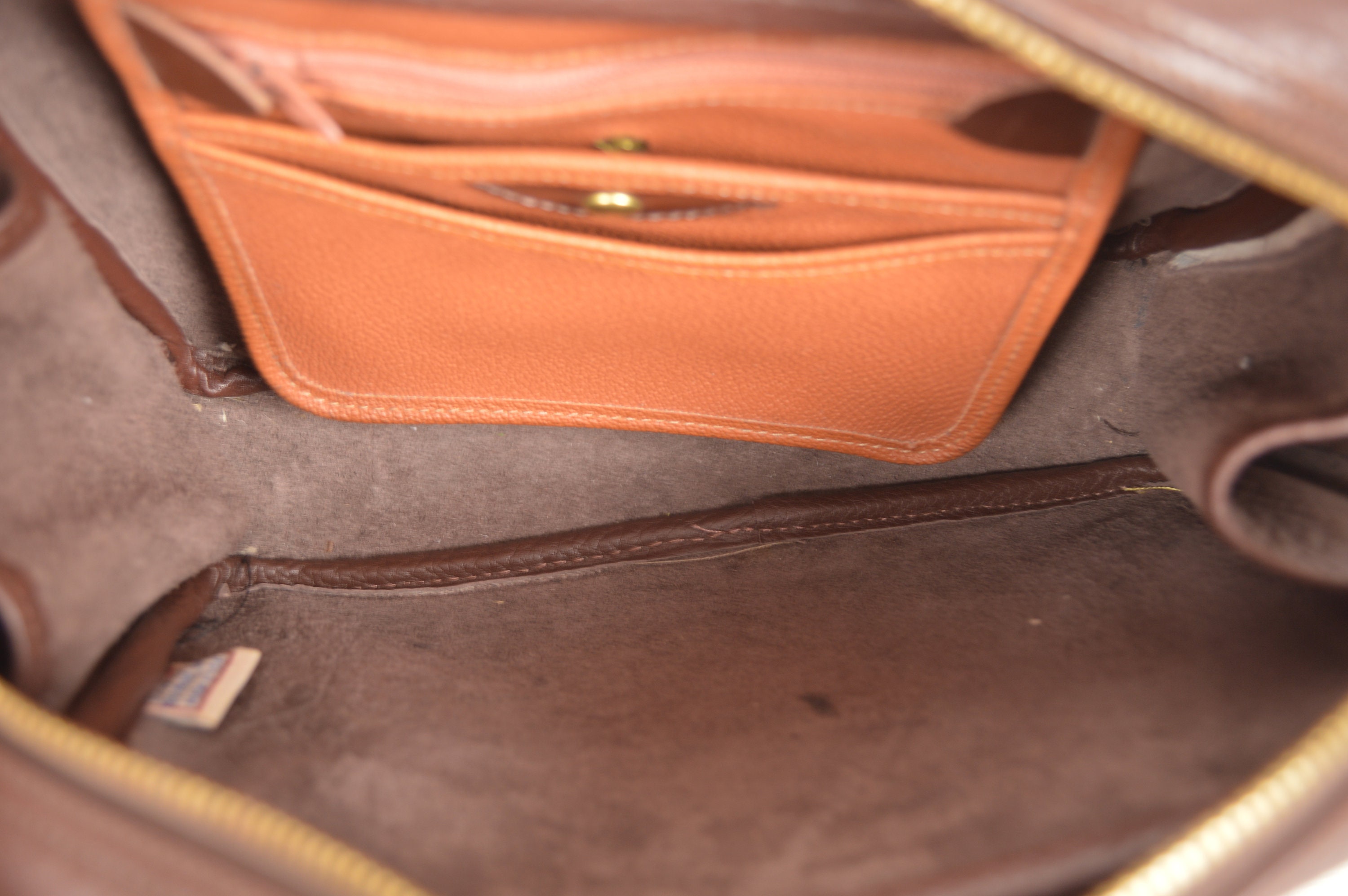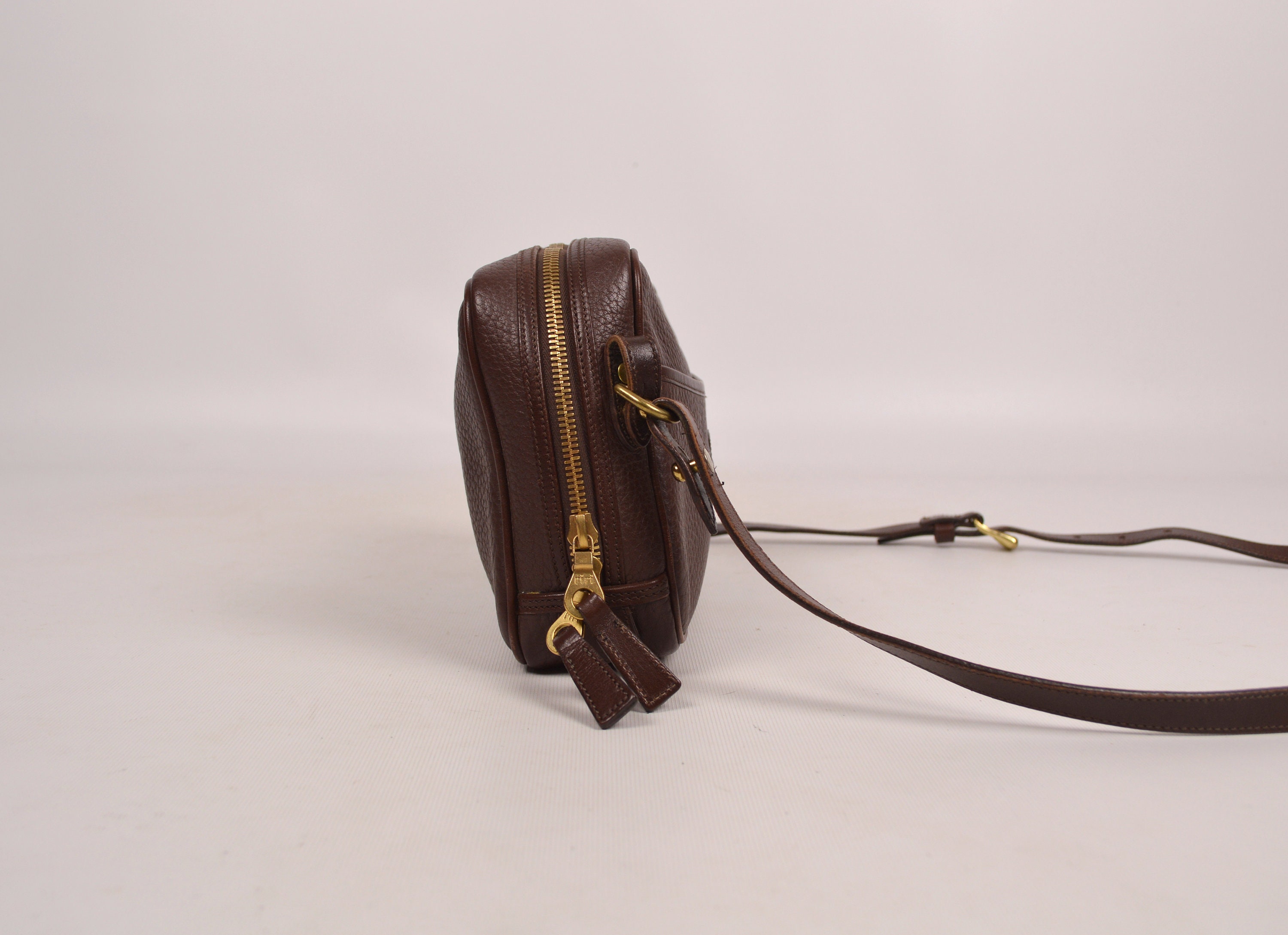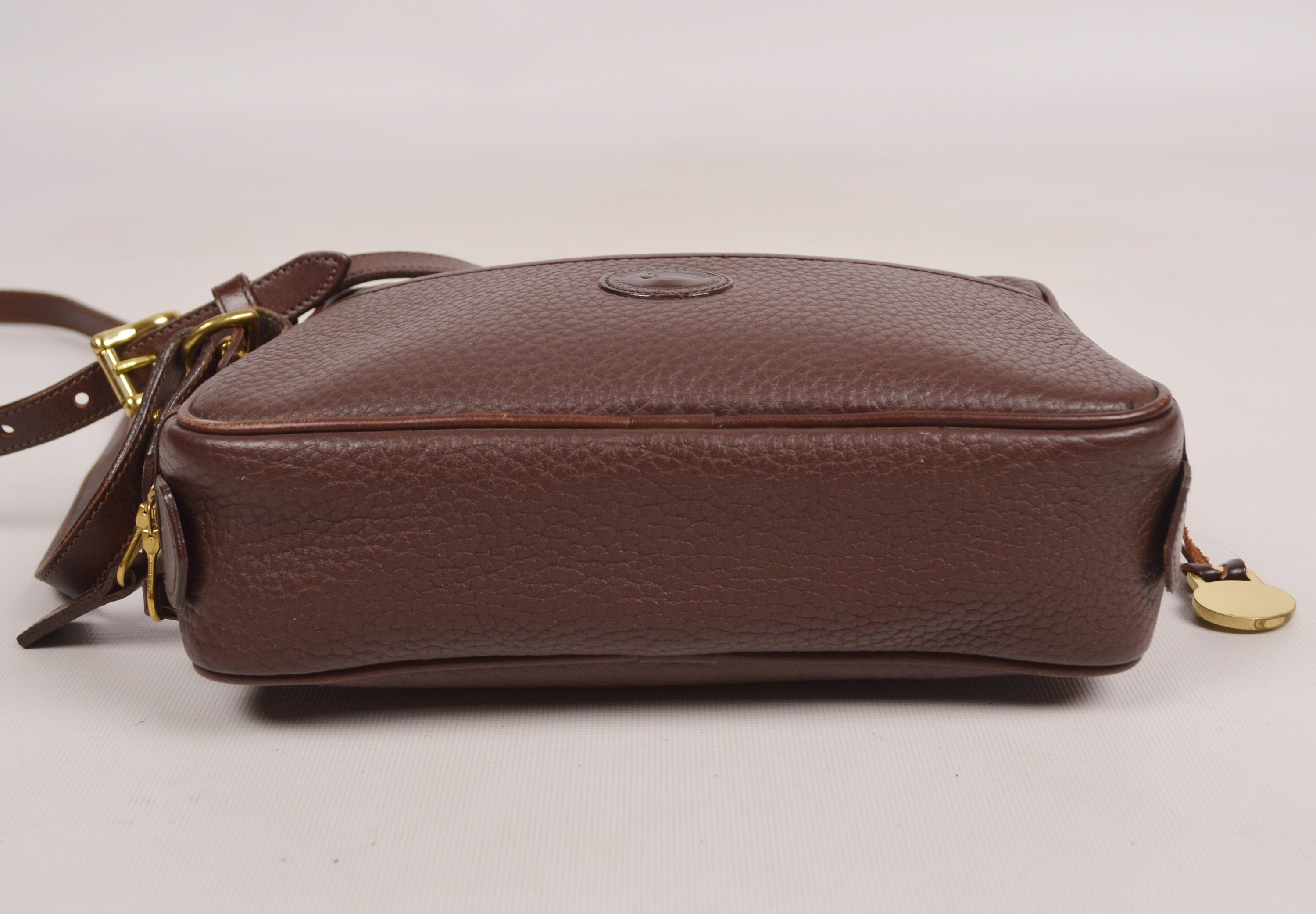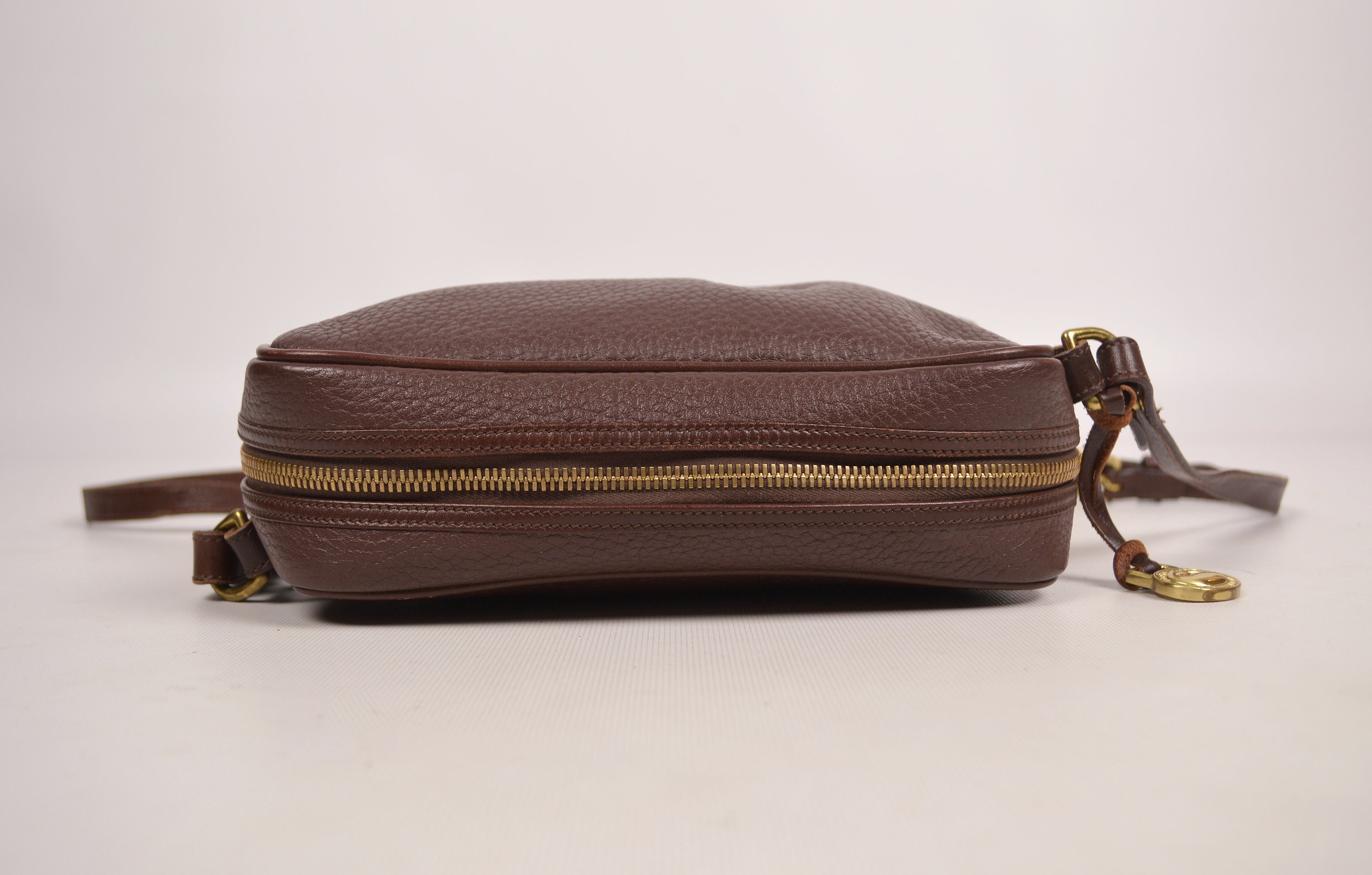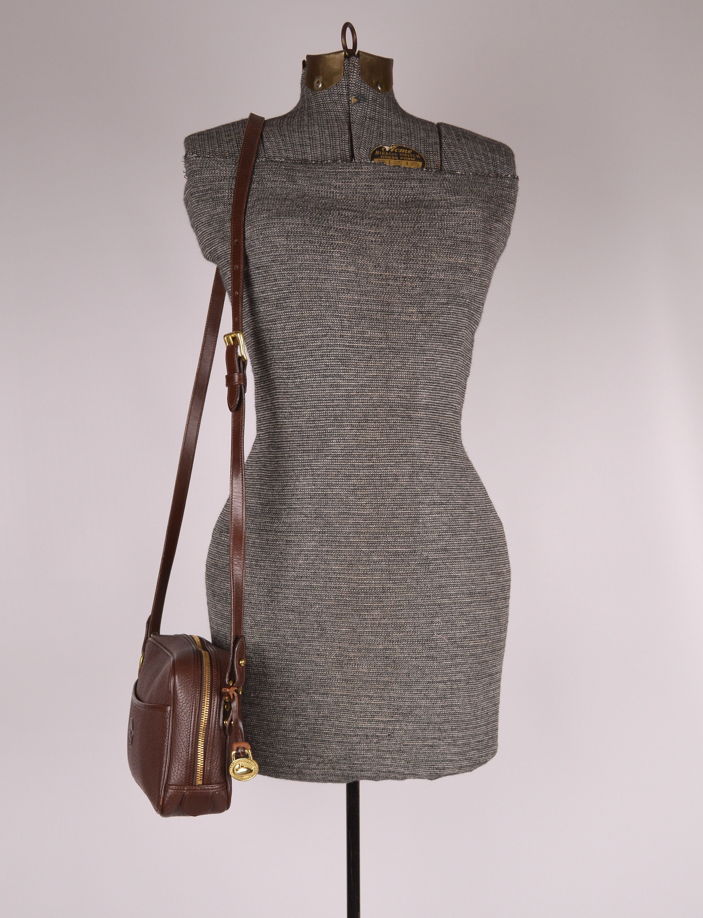 Rare, authentic, vintage Dooney & Bourke, pebbled, All Weather Leather, zipper bag in chocolate brown. Has a slip pocket on the front outside. Large open compartment inside with one small zipper pocket, snap pocket, and slip pocket. Has the red, white, and blue "Made in U.S.A." tag inside with a serial number on the back of the tag. Solid brass hardware. Stamped on leather: "Dooney & Bourke All-Weather Leather". Clean inside and out. Has the hanging brass duck tag. Crossbody / shoulder strap is adjustable and removable. Gorgeous bag! Excellent quality. Perfect for everyday use