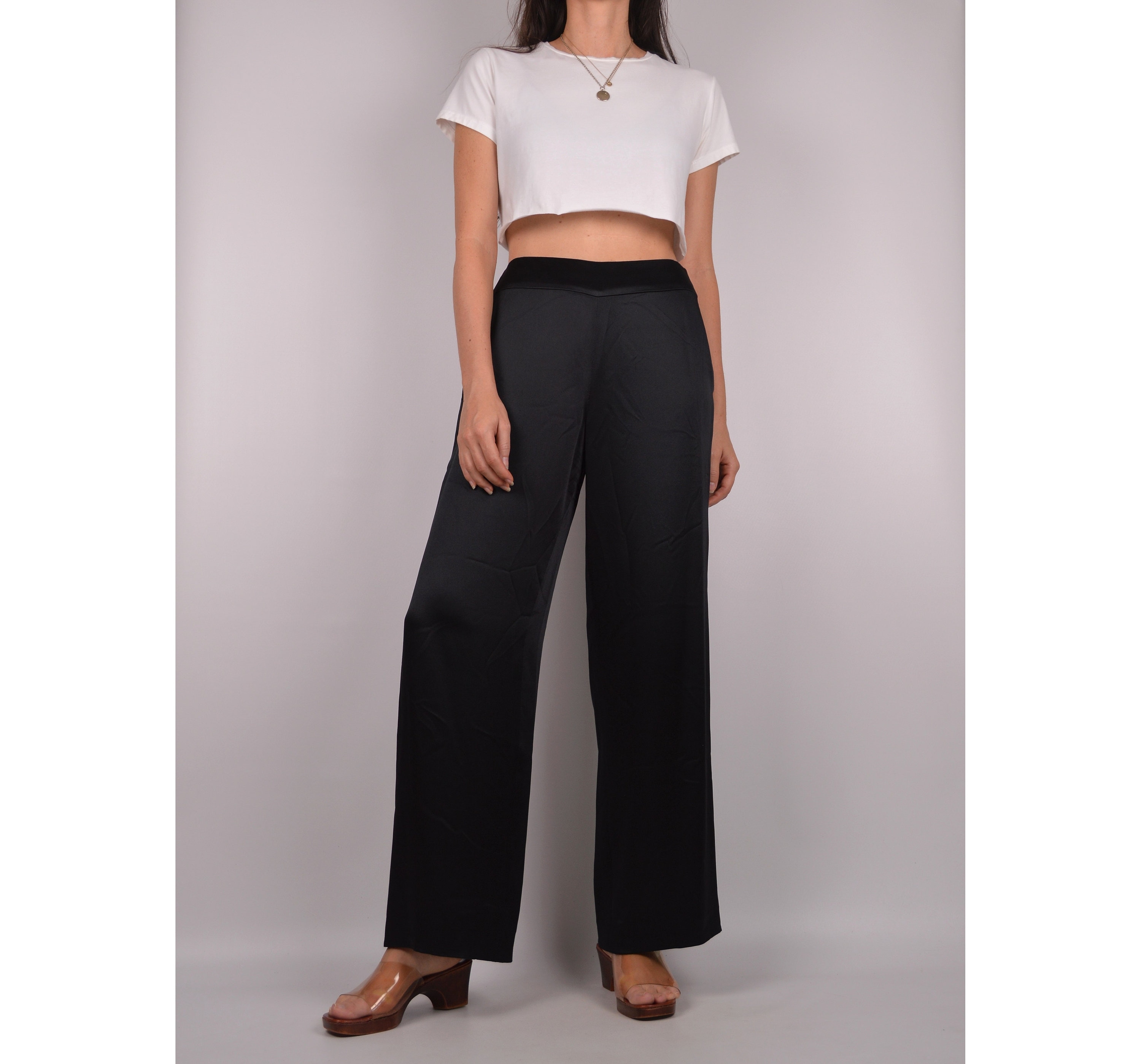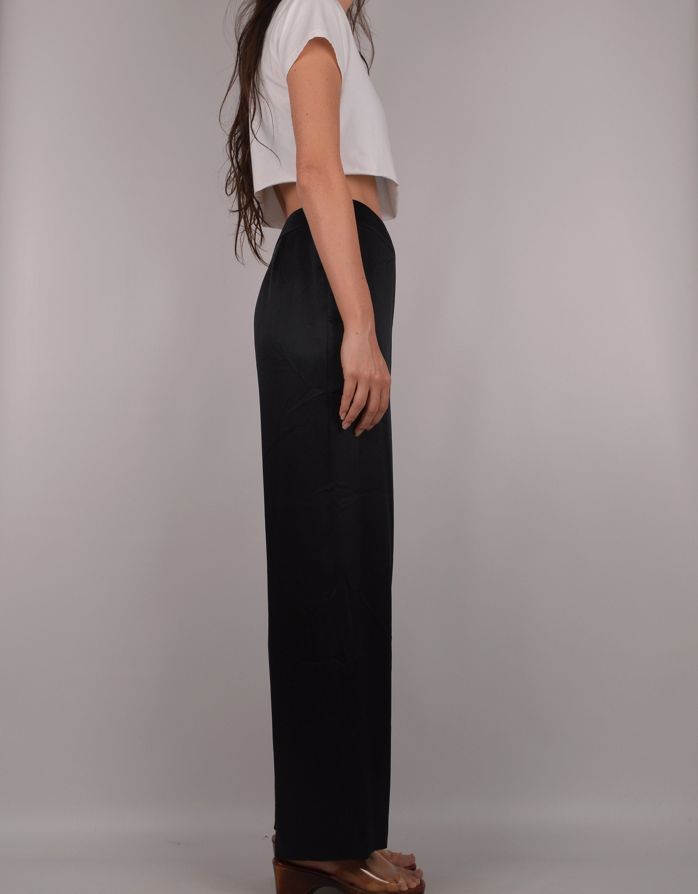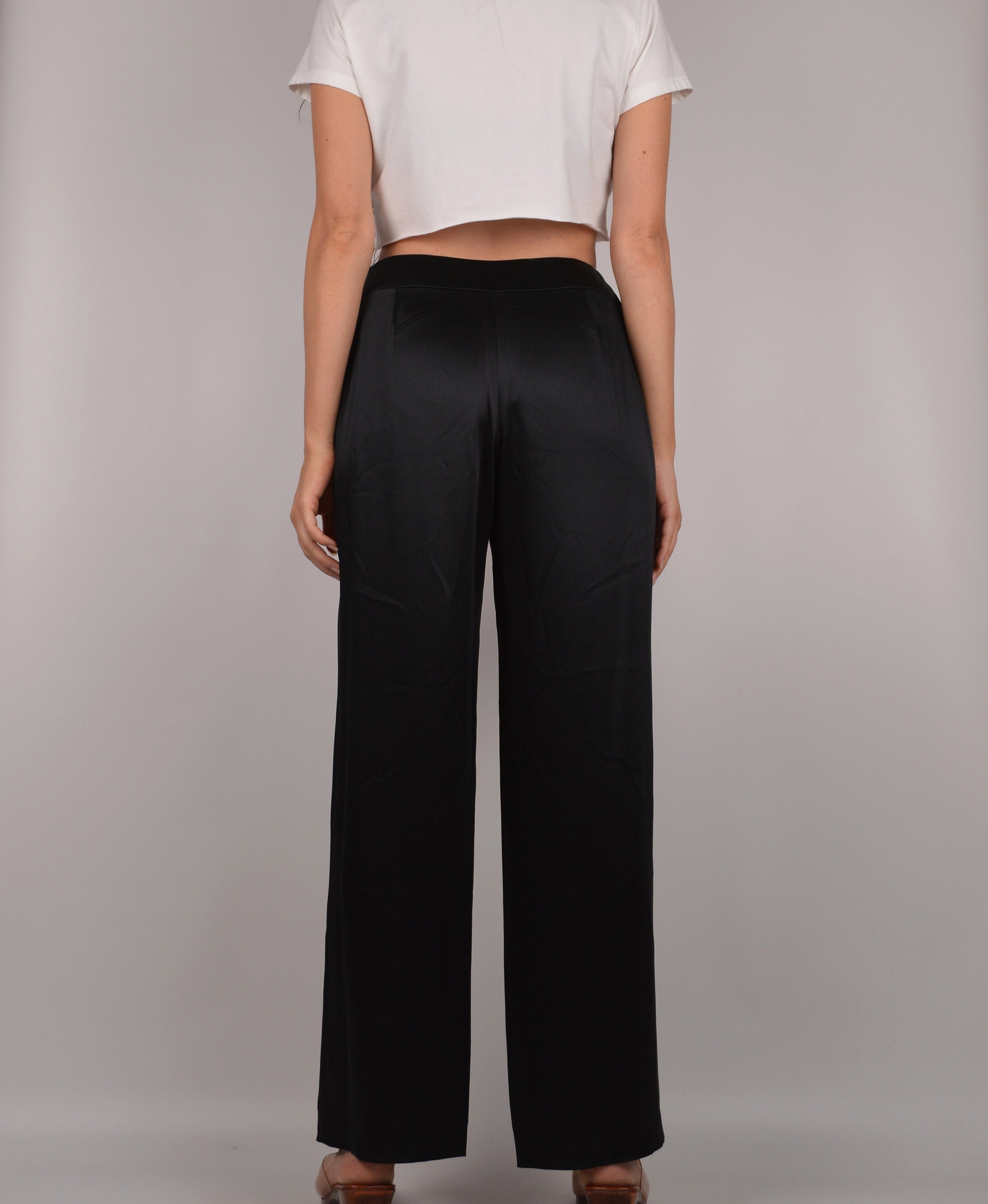Vintage black silk trousers. These do not have a contents tag but I am sure that they are silk. High waist and wide leg. Hidden side zipper and hook closure. Fully lined. Beautiful quality