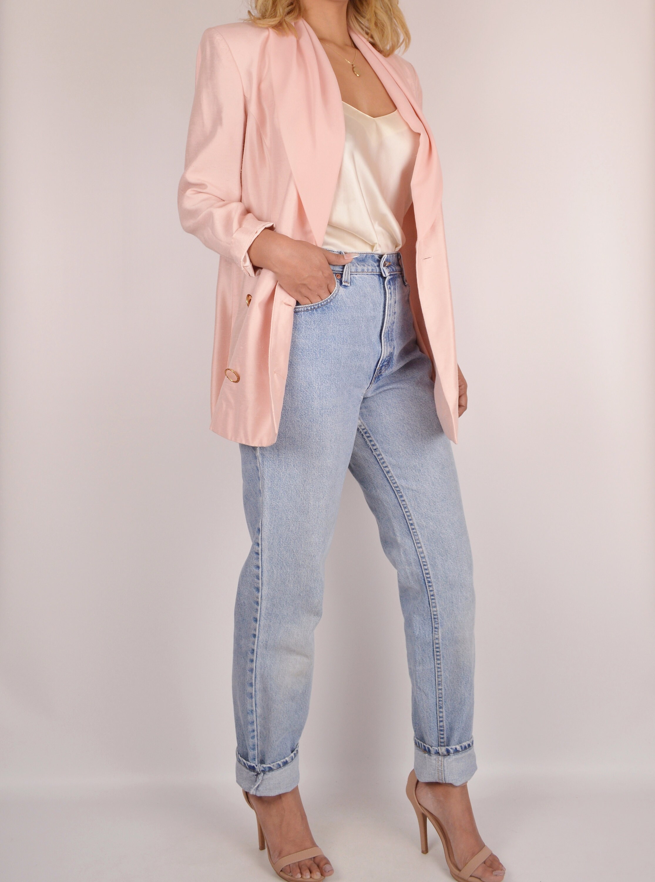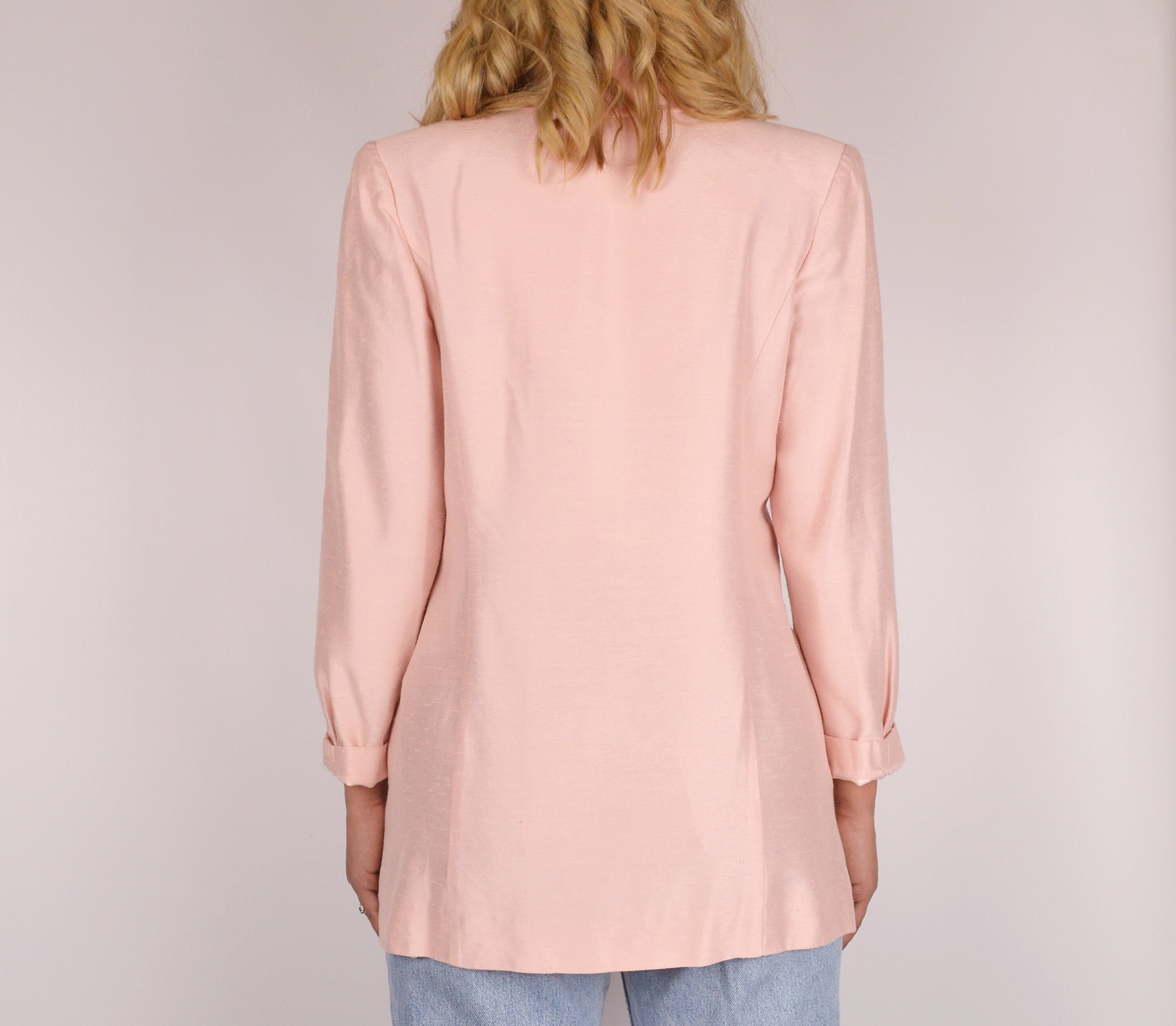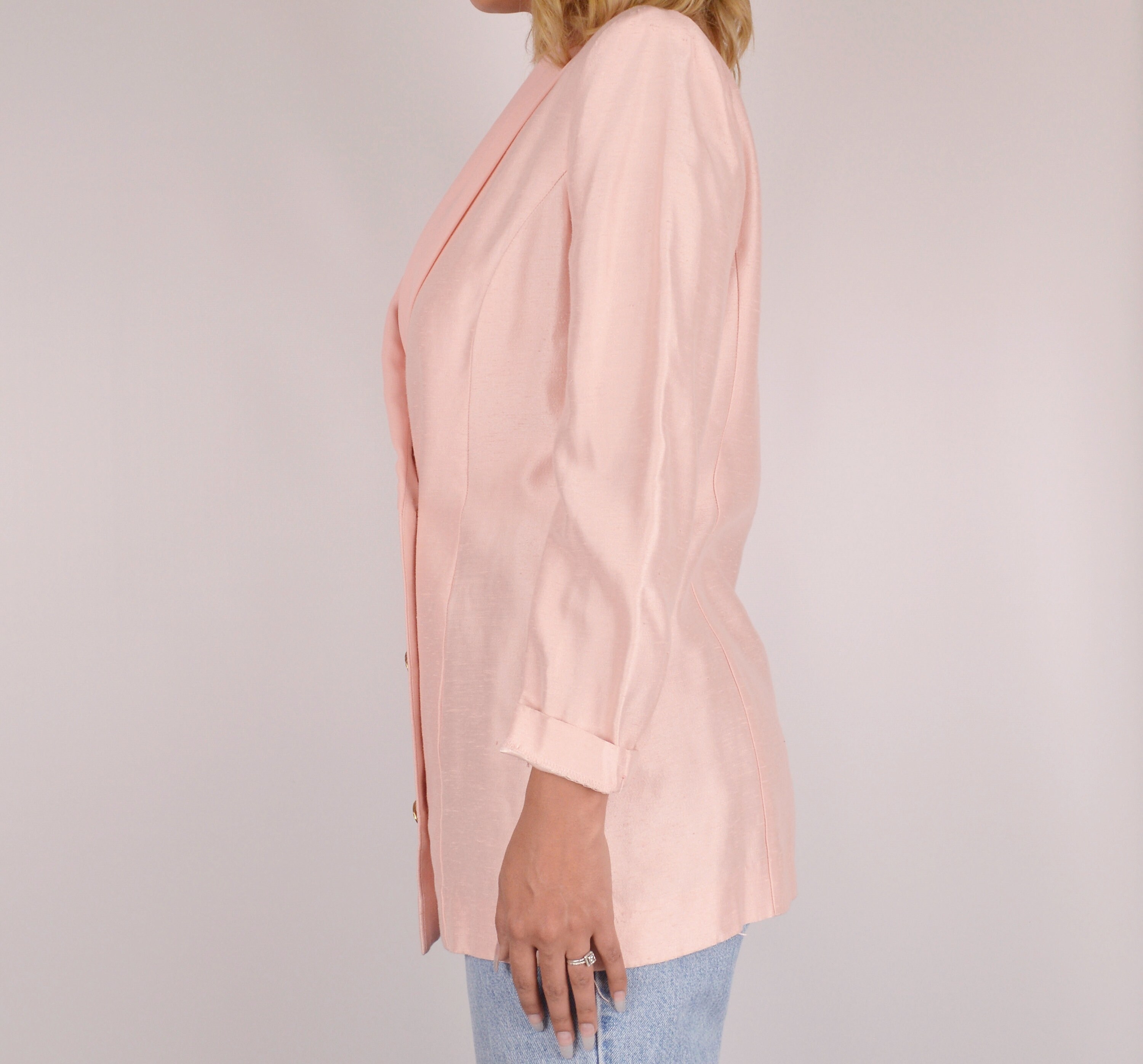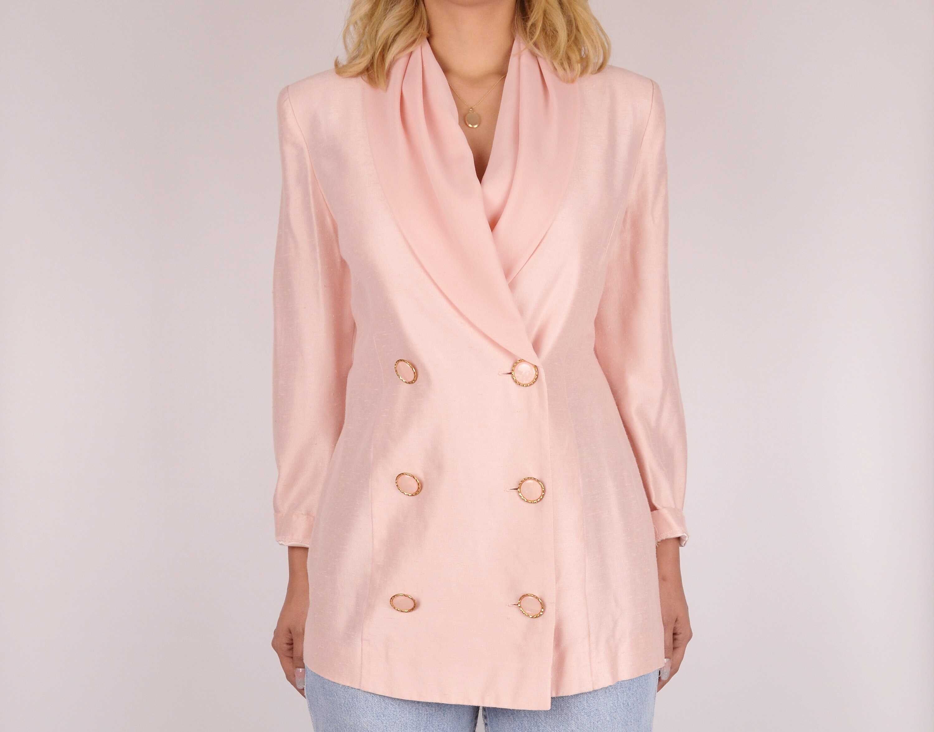 Gorgeous vintage blush pink blazer with draped chiffon lapel. Has beautiful buttons, double-breasted closure, one button at the wrists. Shoulder pads can be easily removed if desired. Unlined. Super versatile as it can be worn with your favorite jeans or over a mini, and everywhere in between
