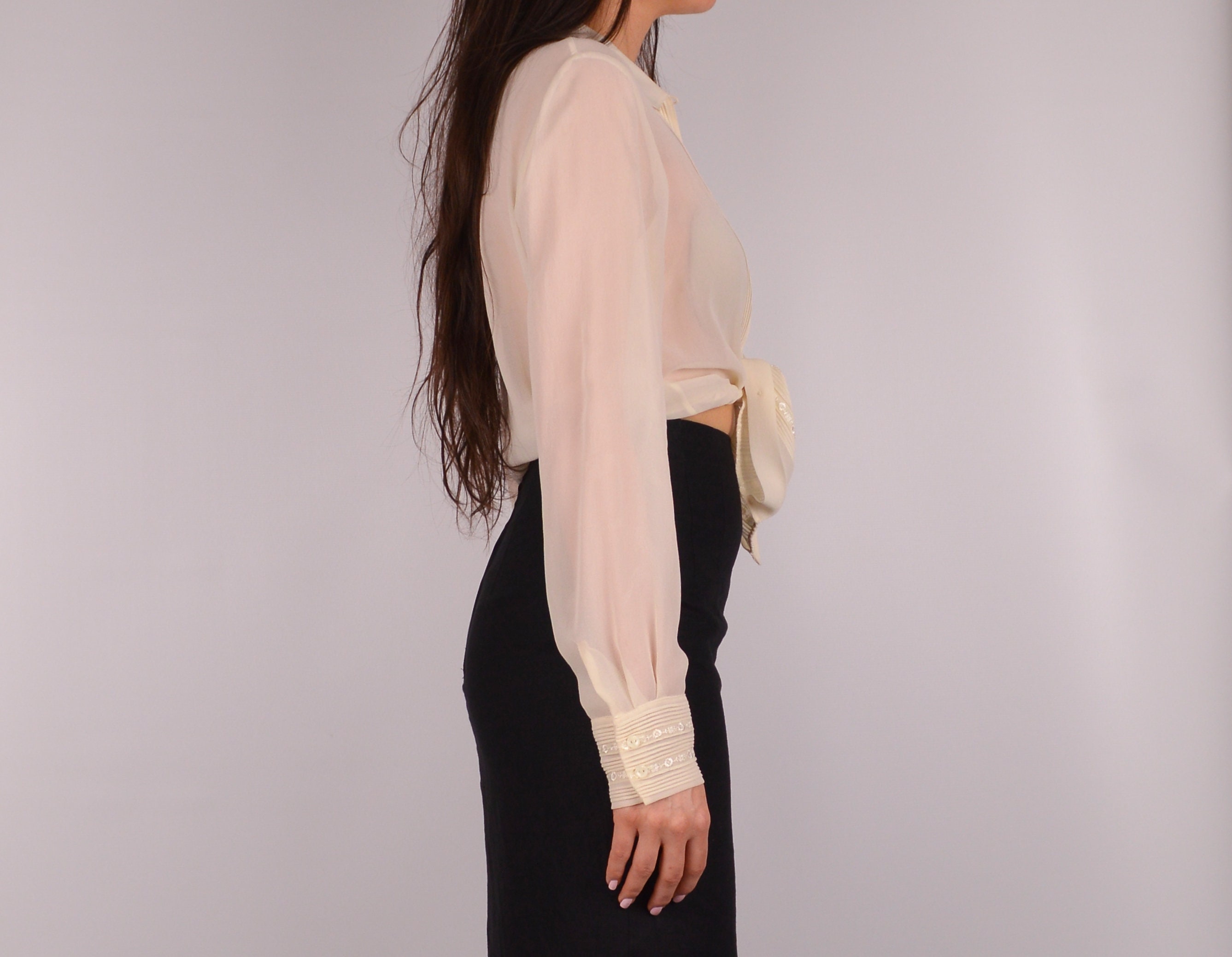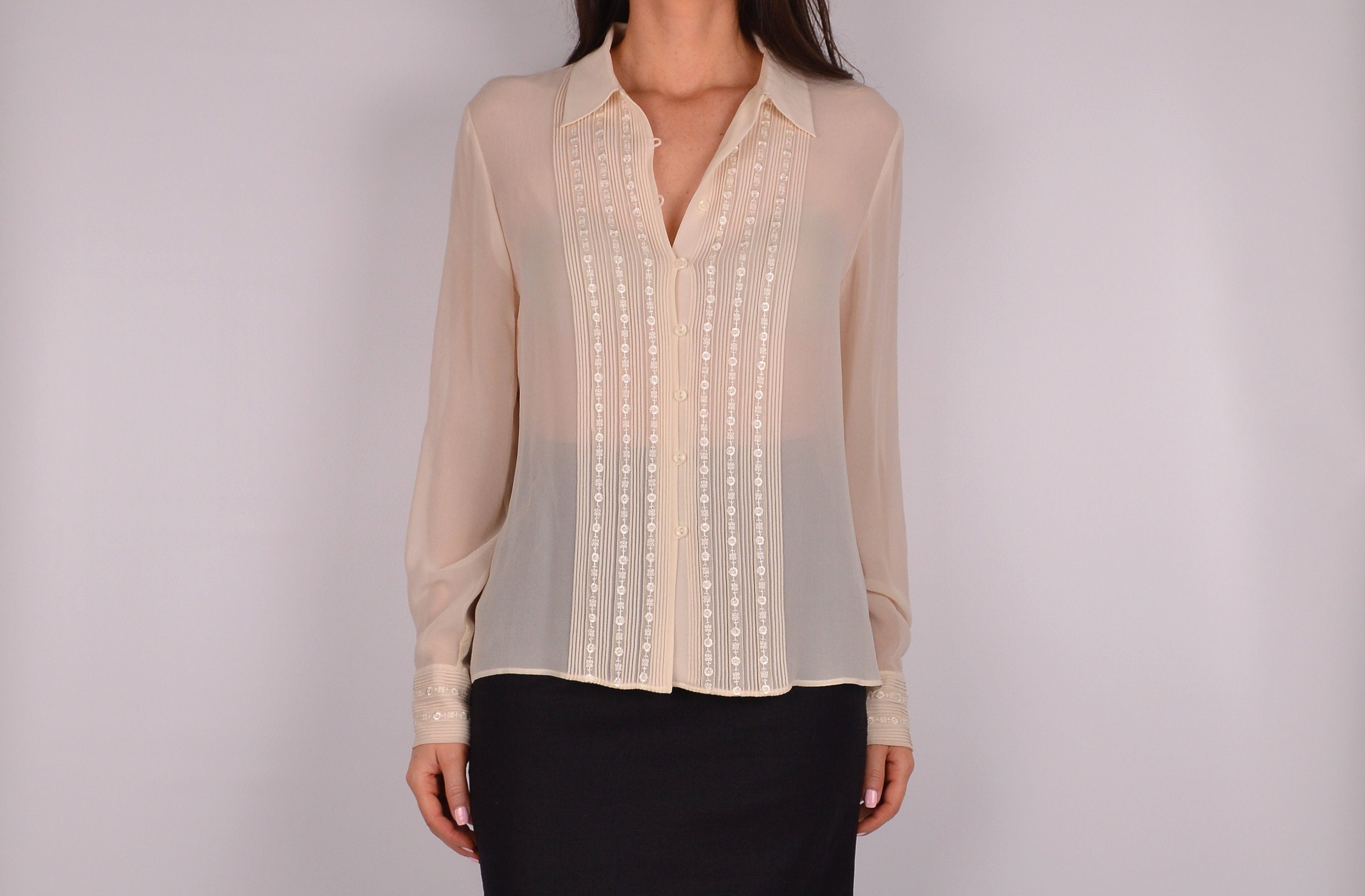 Gorgeous vintage sheer cream silk button up top. Embroidery detail adds delicate beauty. Effortlessly chic