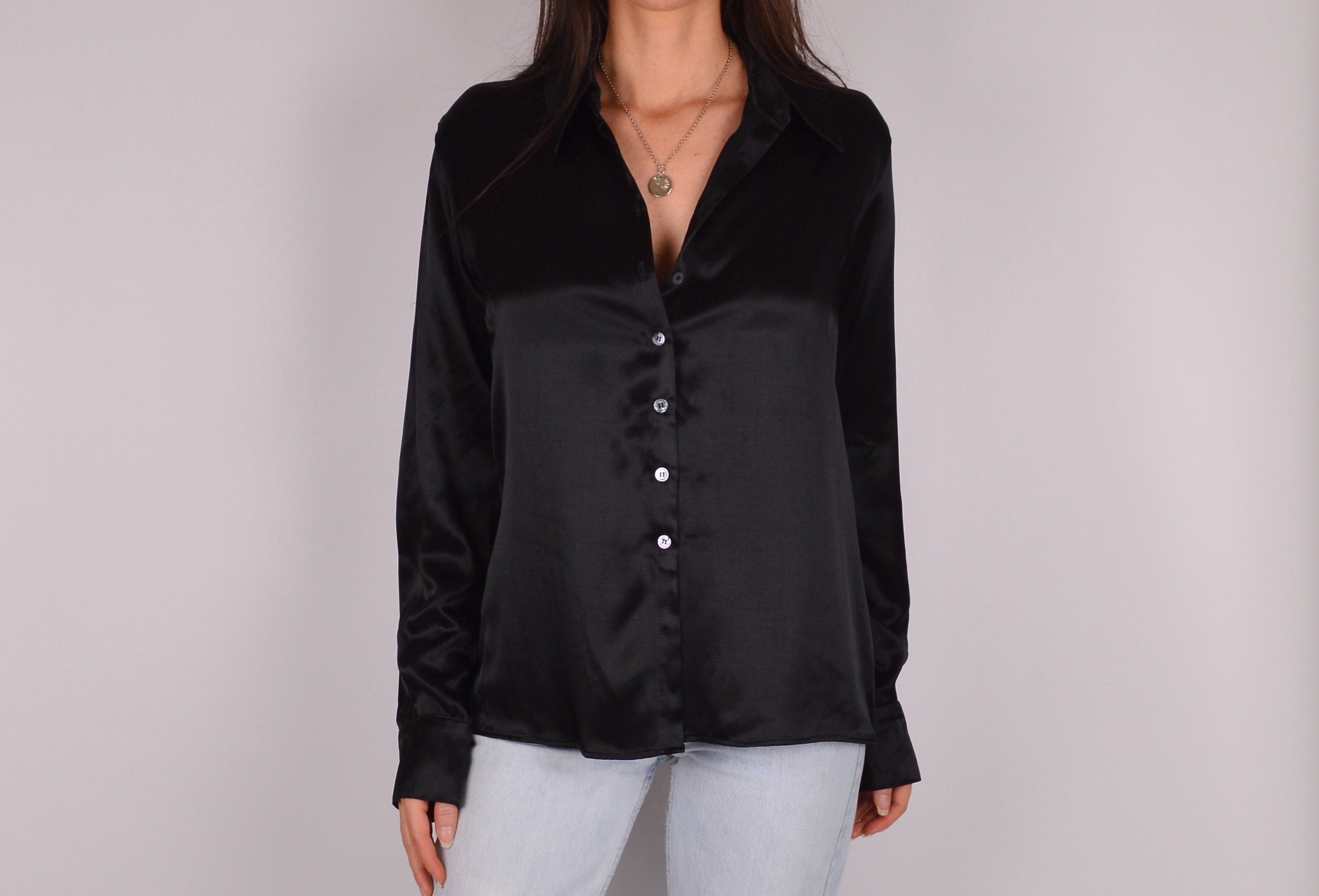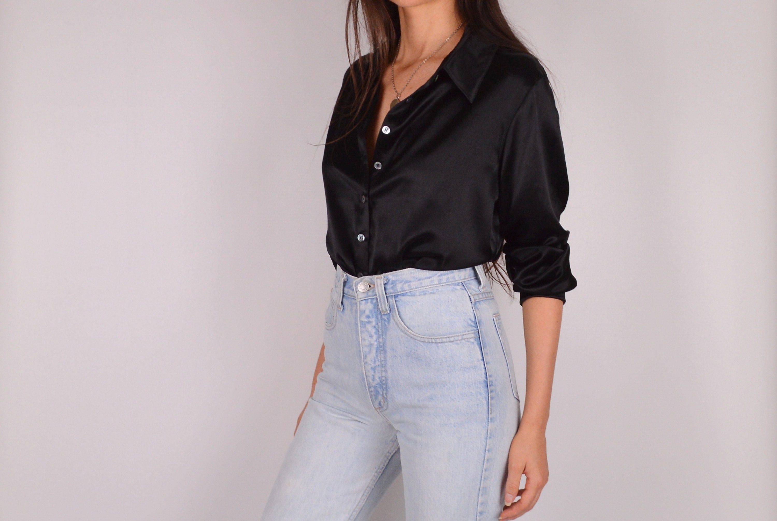 Beautiful vintage black liquid satin blouse. Three buttons at the cuffs. Made in USA. So perfect