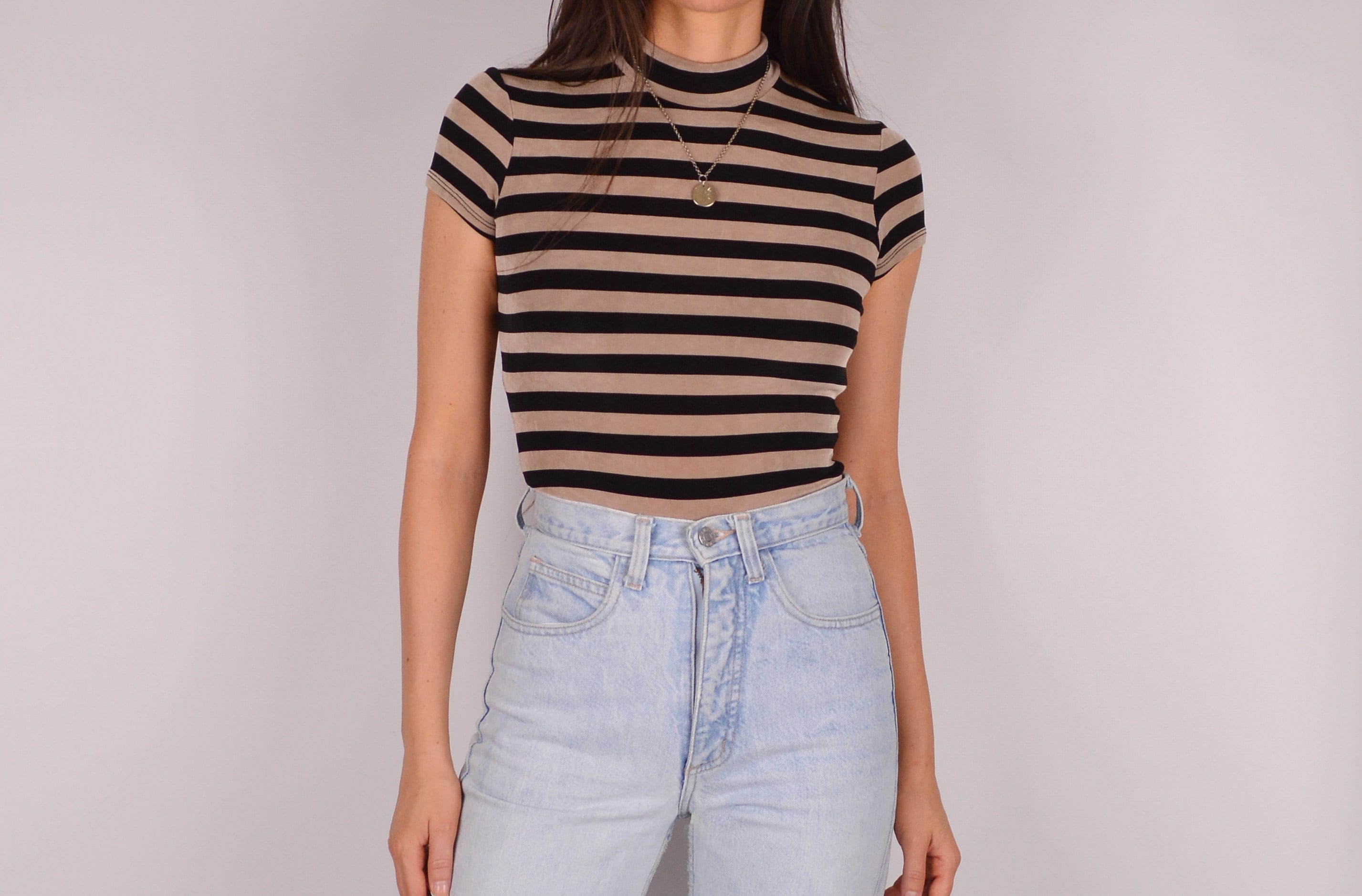 Vintage black and tan striped mock neck bodysuit. The fabric has stretch. The suit has two snap closure inside. Back is almost thong-shaped. Ideal to not add panty lines to your jeans. Love this look!