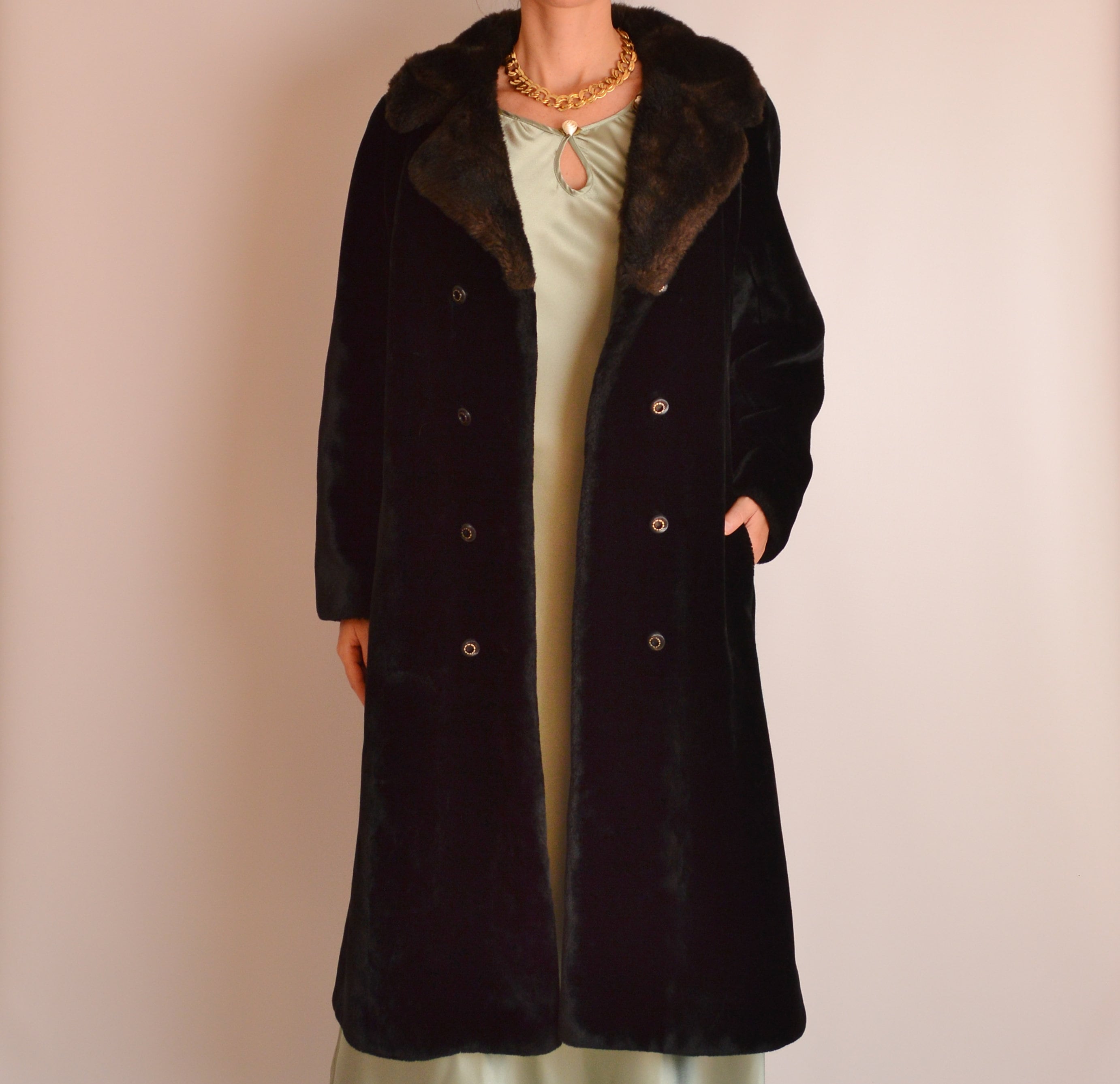Gorgeous vintage black faux fur winter coat with a dark brown collar. Double-breasted closure with four buttons. Has hand pockets. Fully lined in lovely satiny fabric. Soft and warm. Worker's Union Made in USA.