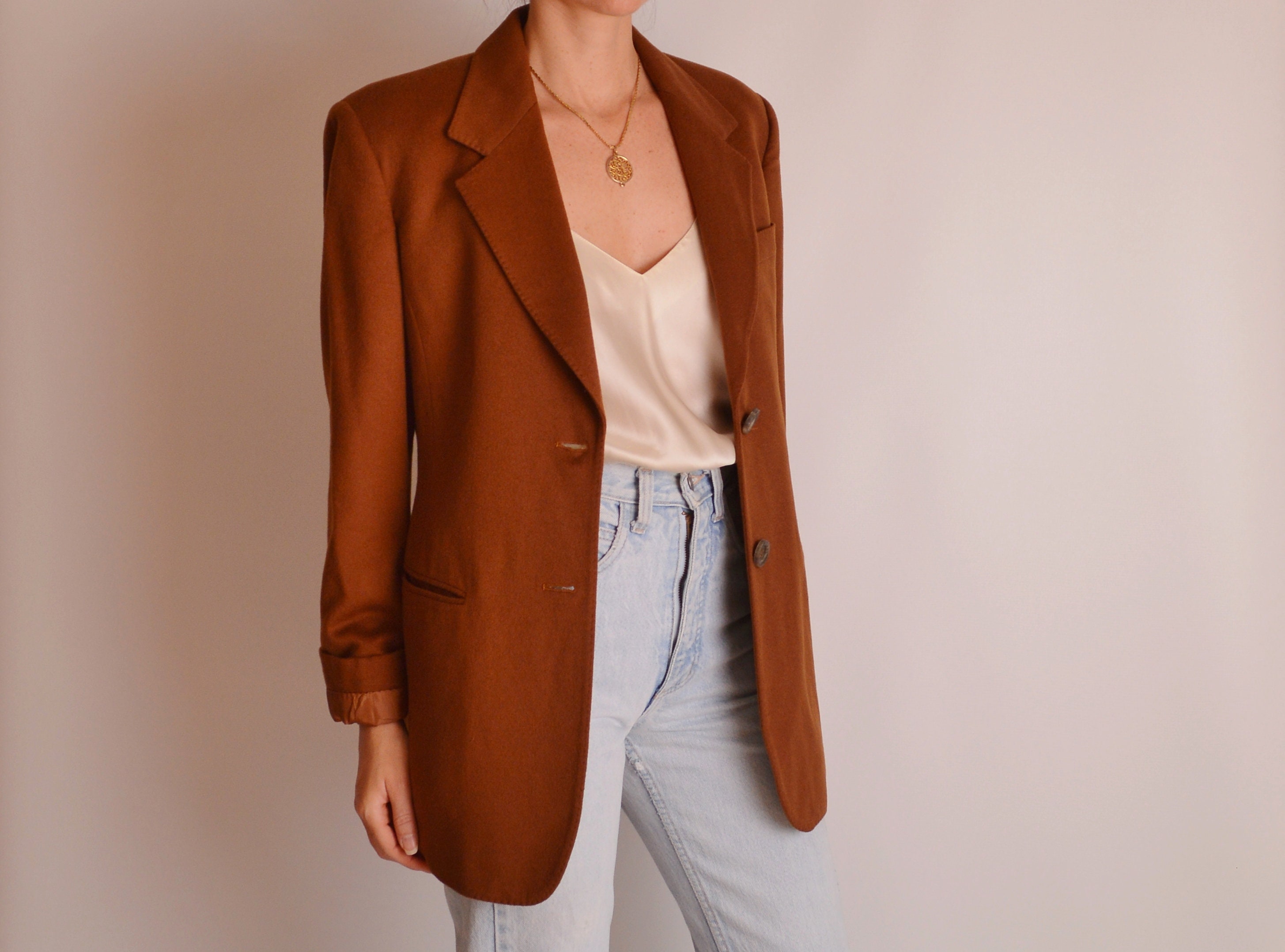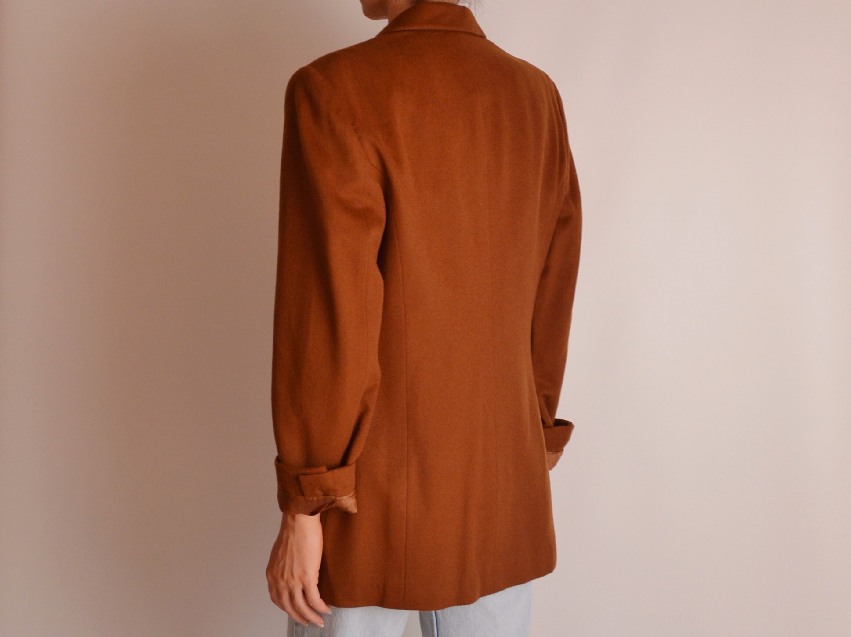 Gorgeous vintage, caramel, wool, and cashmere blend blazer. Has two-button closure, pockets, and thinly padded shoulders. Button detail at the cuffs. Fully lined. Made in Italy. Excellent quality garment.