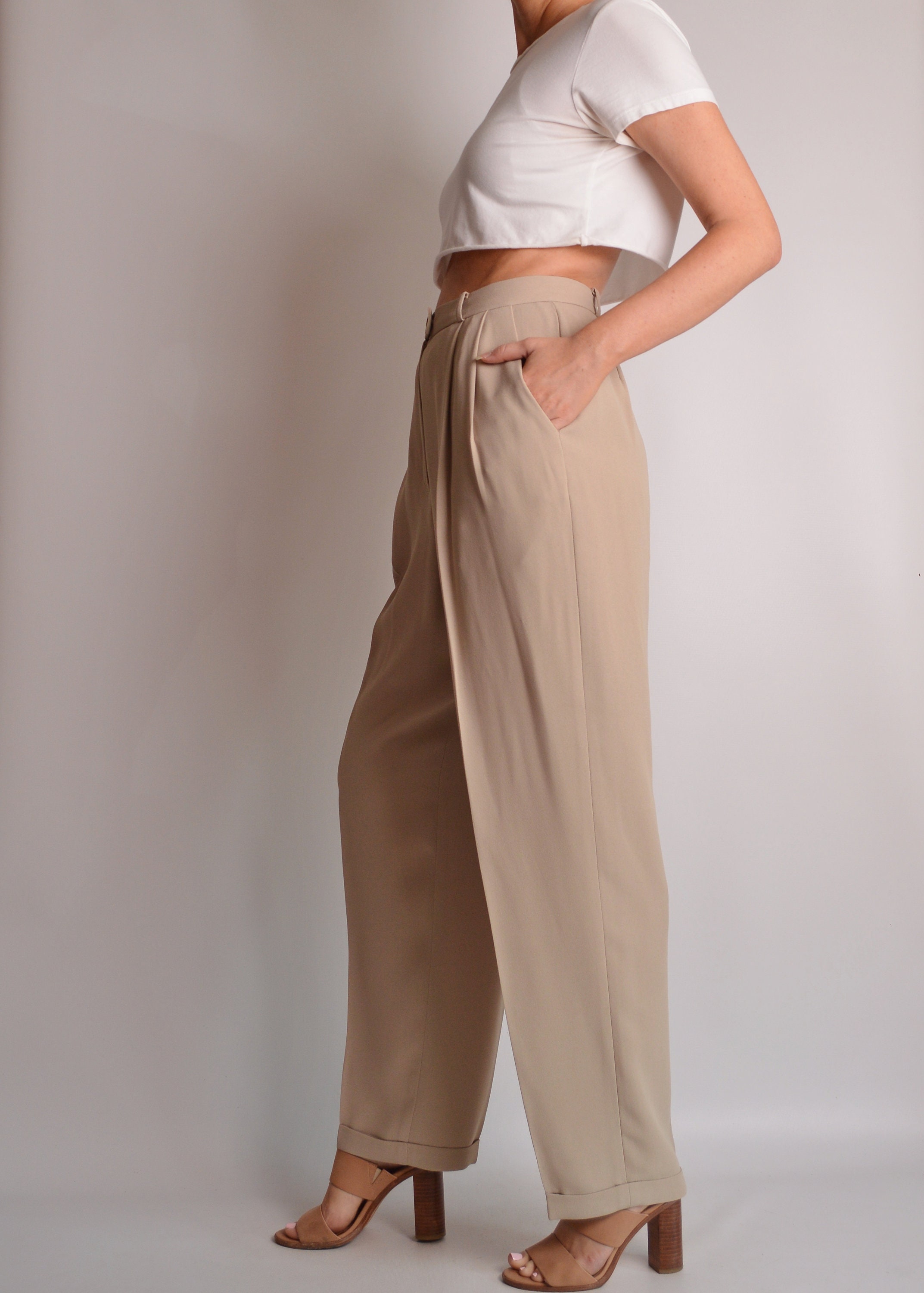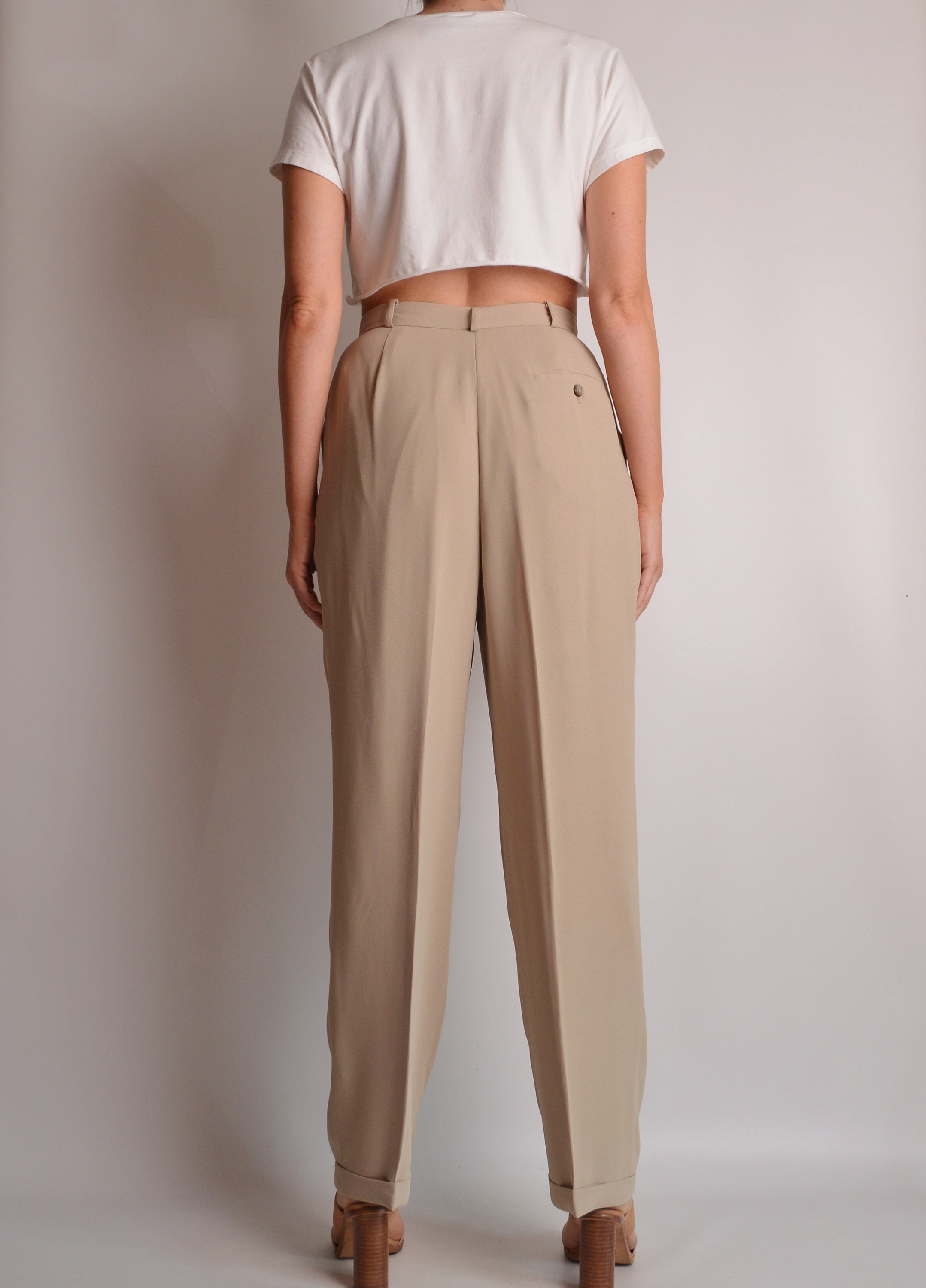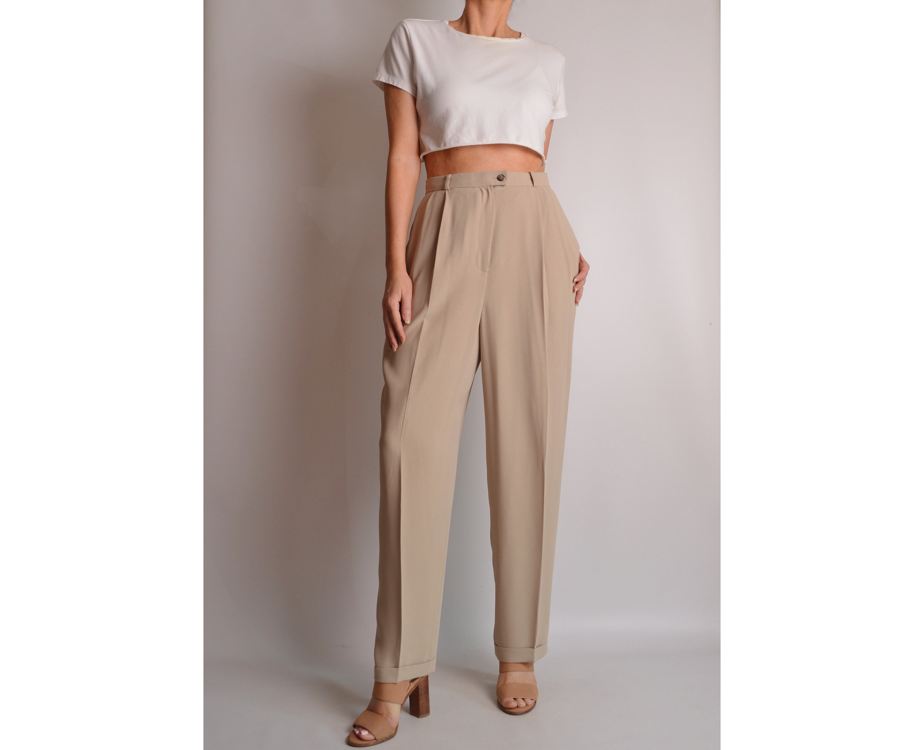Gorgeous vintage beige color trousers. High waist, tapered, relaxed leg. Pleats in front, and button and zipper closure. Cuffed hem and fully lined. So perfect