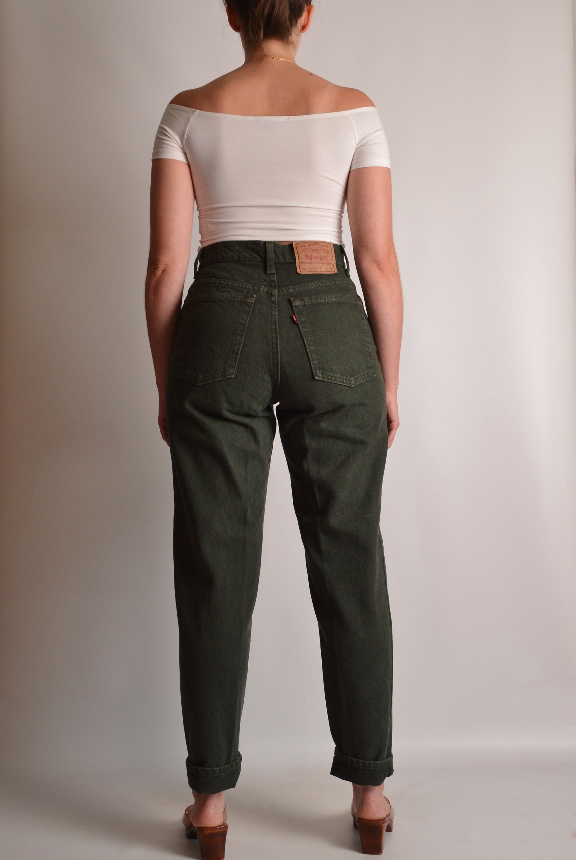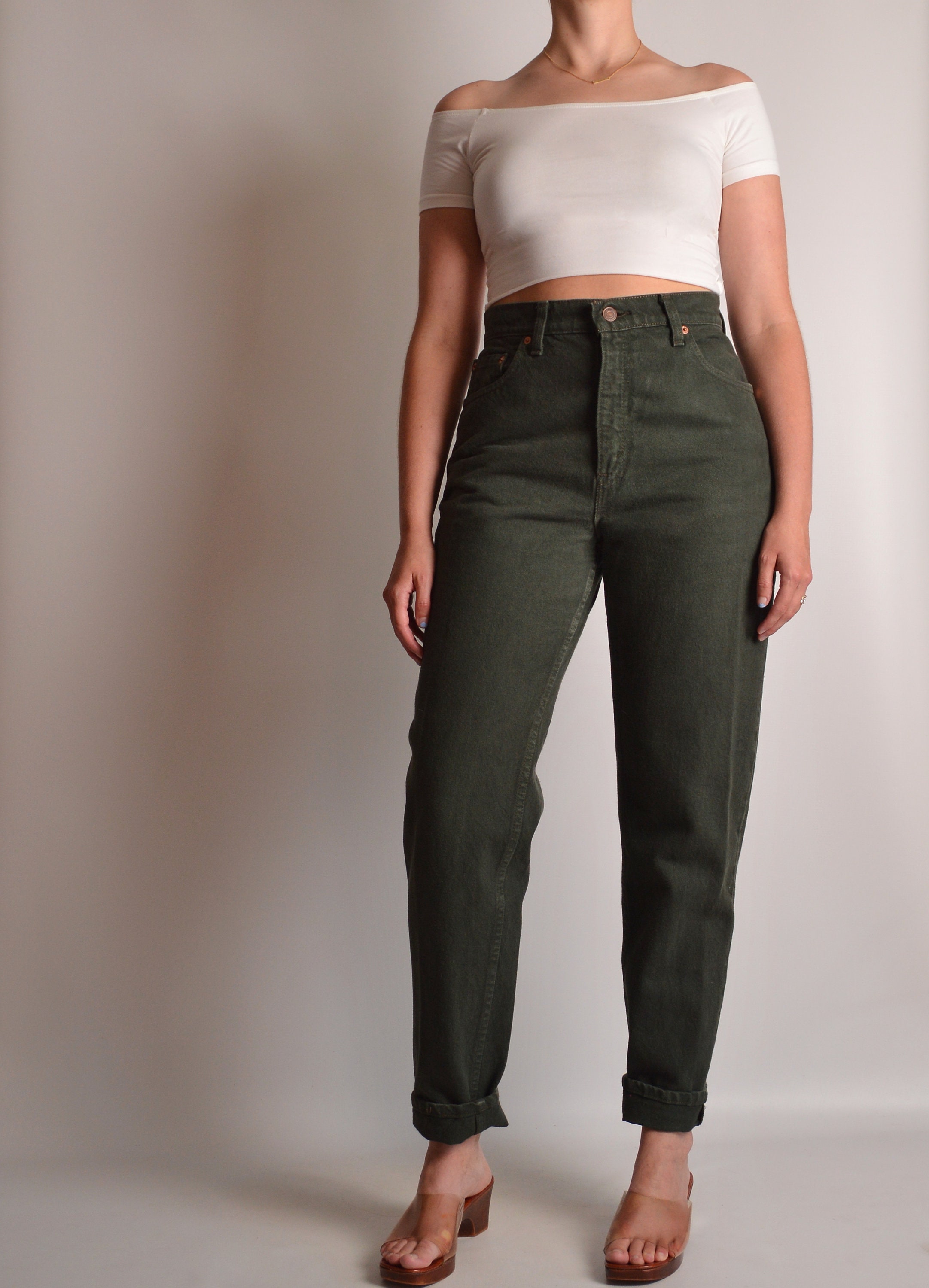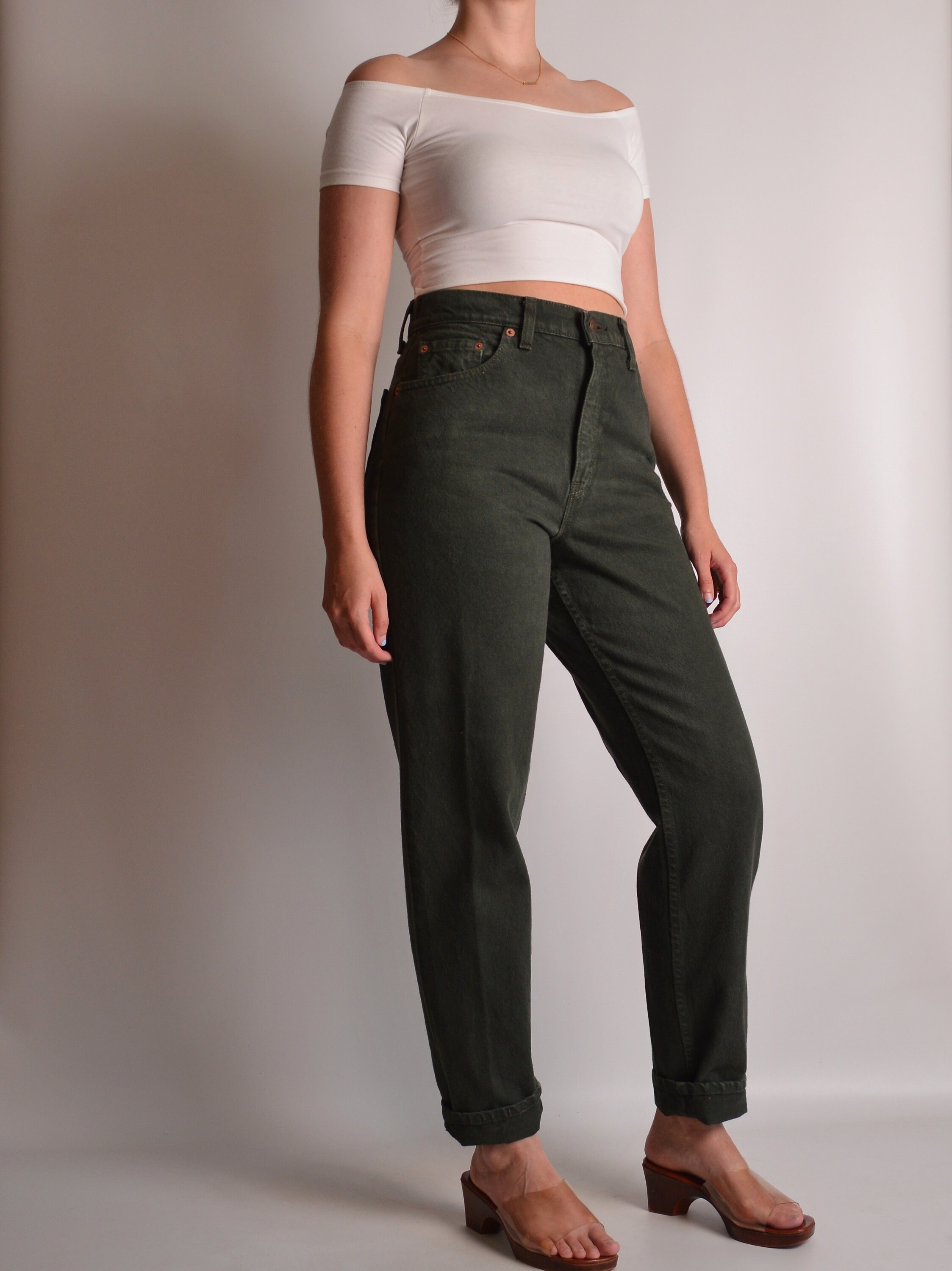 Vintage seaweed green Levi's 551 "relaxed fit, tapered leg" jeans. Great length, high waist. Gorgeous rare color. Made in USA.